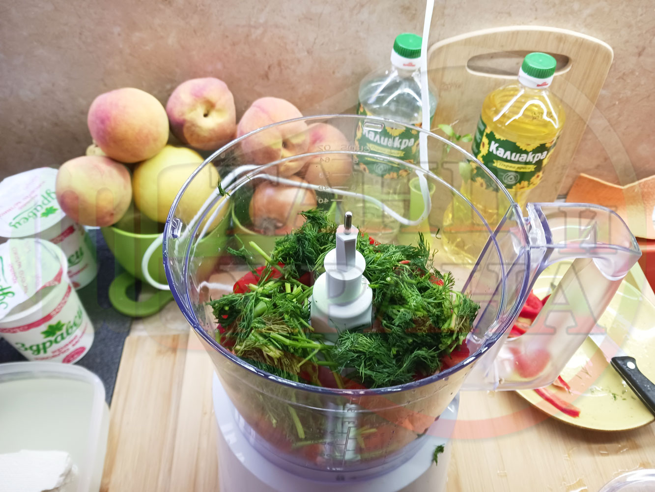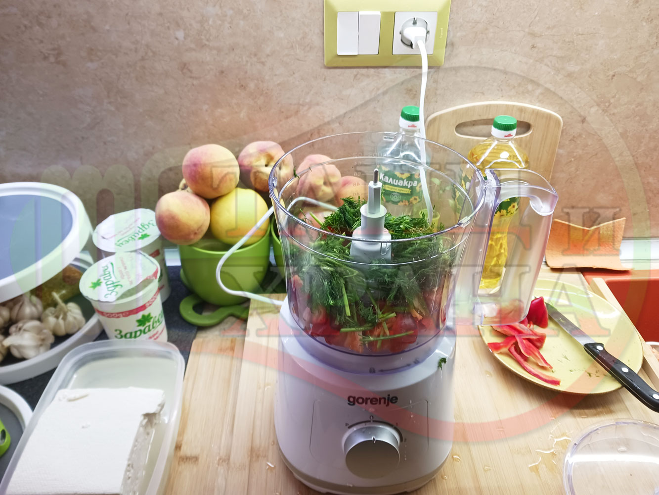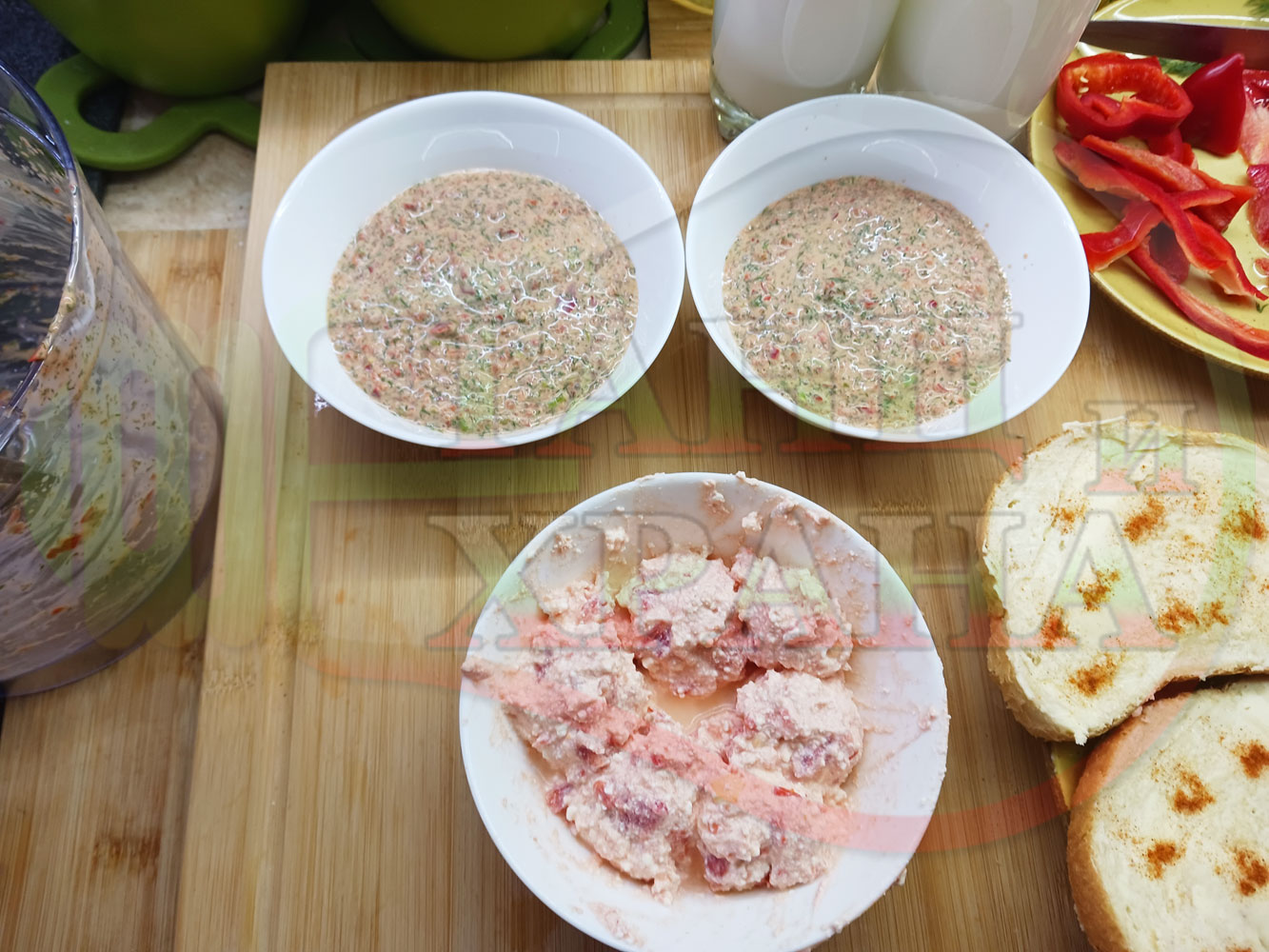 Българската червеночушкова сурова, млечна супа, която сътворих се оказа доста вкусна и се спретва буквално за "нула" време с чопър. Гарнирах супата с топчета от сиреново доматен крем приготвени с българско краве бяло саламурено сирене, стар чесън и пресни домати и се получи най-вкусната сурова супа, която сме хапвали (поредната най-вкусна сурова супа (всичките сурови супи са вкусни по свой си начин според продуктите, които са включени в тях)). Двукомпонентността на супите (в голямата си част са авторски с иновативен метод на представяне и комбиниране на продуктите (прилагам метода на двукомпонентността в почти всички видове ястия, които приготвям)), позволява да се комбинират различни сурови и/или запечени продукти, с което осъвременявам и обогатявам традиционни български вкусове за приготвянето на супи, ястия, печива и различни гозби. Сиреновите топчета овкусяват супата с неповторимия вкус, който носят в идеална хармония с червеночушковокопъровата супа с кисело мляко от България и за пореден път се получи голяма вкусно, вкусна, вкусотия (вкуснотия), която е изключително полезна, обединяваща млечните протеини, минерали и микроелементи с богатството от полезни съставки на чушките, чесъна и свежия копър.