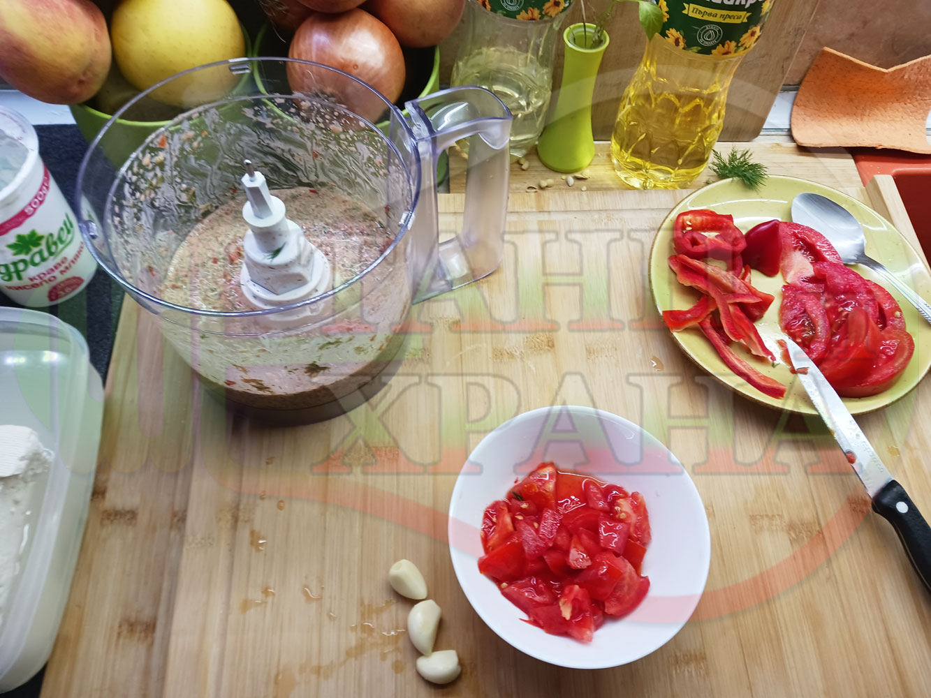 Измийте домата и го нарежете на средни по големина парченца в купа заедно с обеления и нарязан на едро чесън (нарежете част от домата на резени за украса). Добавете кравето бяло сирене и разбъркайте и намачкайте с вилица до образуване на средно гъст сиреново доматен, хомогенизиран крем със стар чесън (сиренов крем). Оформете 6 средно големи топчета от крема за гарниране на супите.