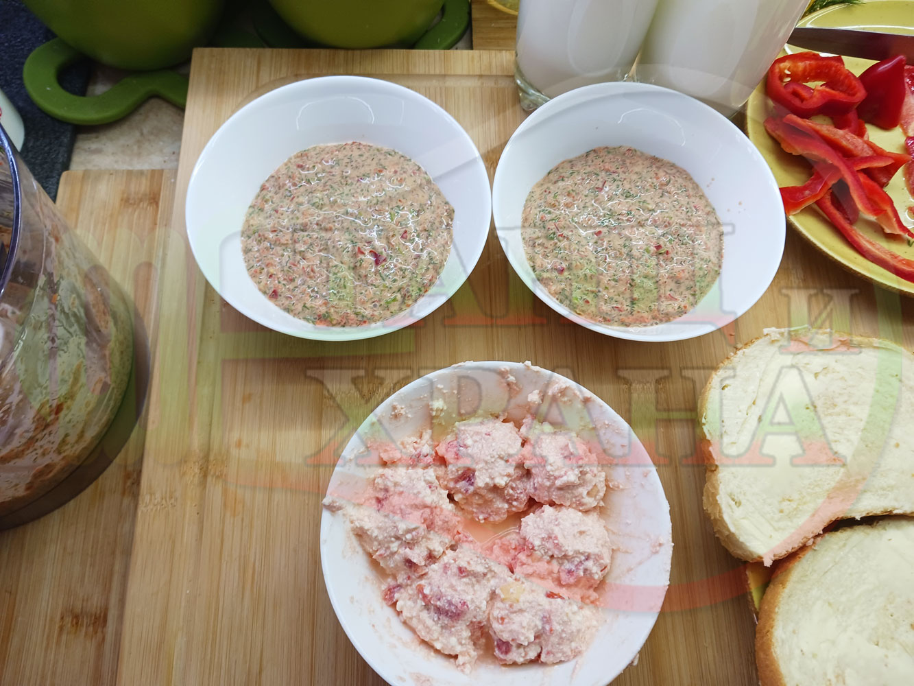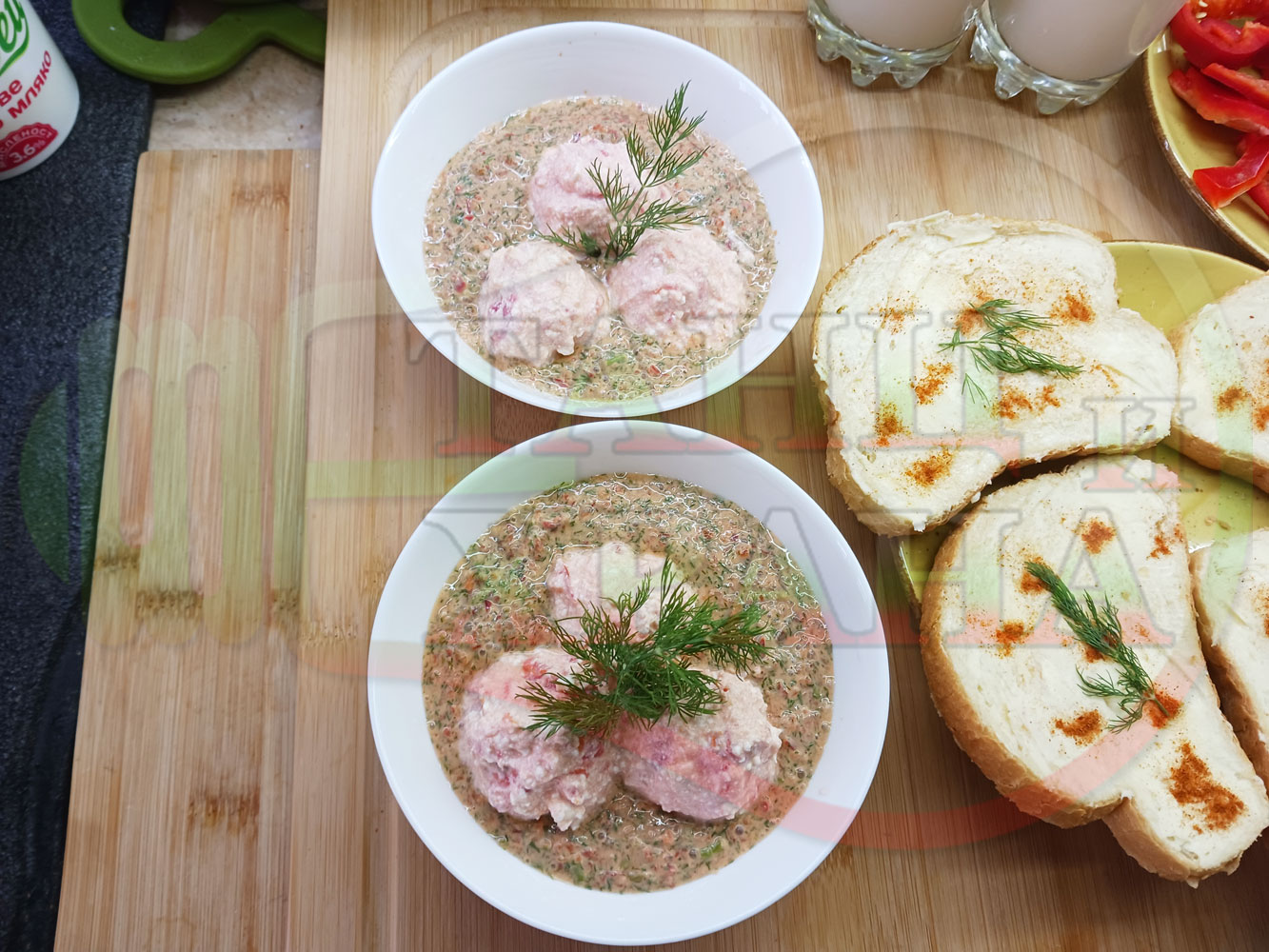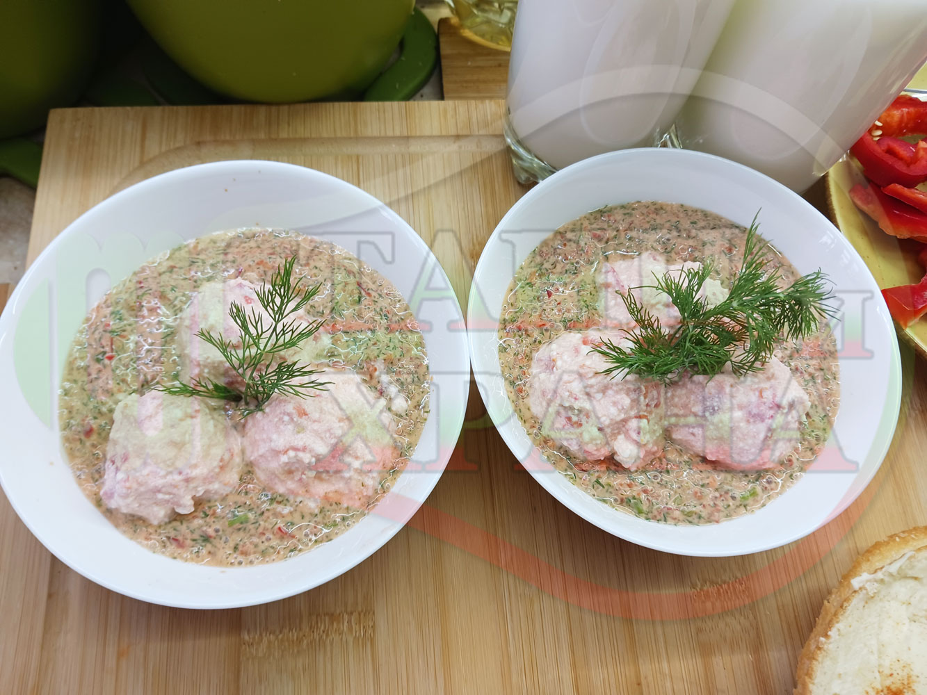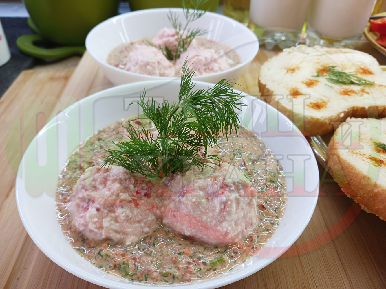 Българска сурова супа "Червеночушковокопърова киселомлечна с БГсирене" приготвена от червени пресни чушки, копър и кисело мляко от България гарнирана с топчета от сиреново доматен крем с домати, чесън и краве бяло сирене - двукомпонентна