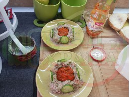 Българска пастетна лютенична сурова салата "Пастетнокраставична с БГсирене" приготвена с пастет и пресни краставици оформена като кладенче напълнено с едросмляна лютеница гарнирана с краве бяло сирене (българско, саламурено)