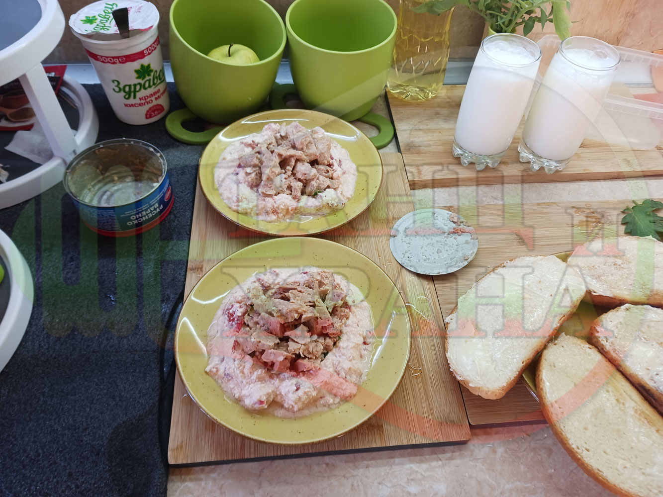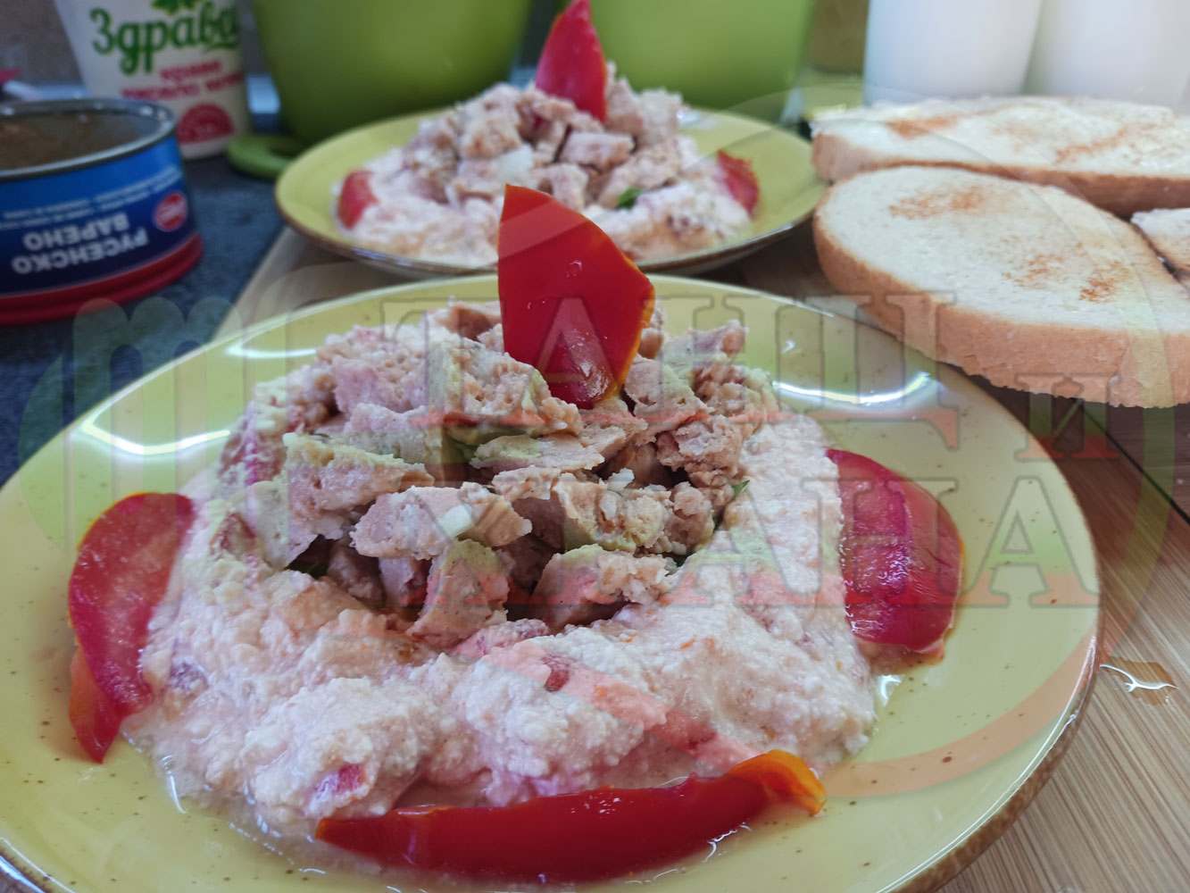 Толкова много обичаме да си хапваме русенско варено и то още от деца, че все спретвам по някое ястие за "норматив". Приготвих салатата от 3 основни продукта и я оформих като кладенче от сиренов доматеночеснов крем от пресни домати и чесън и краве бяло сирене. Напълних салатата с нарязано на парченца русенско варено а листата от домати дообогатиха вкуса на салатата и внесоха свеж елемент заедно с пресния чесън. Русенското варено от своя страна допринесе за характерния български вкус на салатата с кравето бяло сирене (българско саламурено)... Мммм... голяма вкусно, вкусна, вкусотия (вкуснотия). ![]()