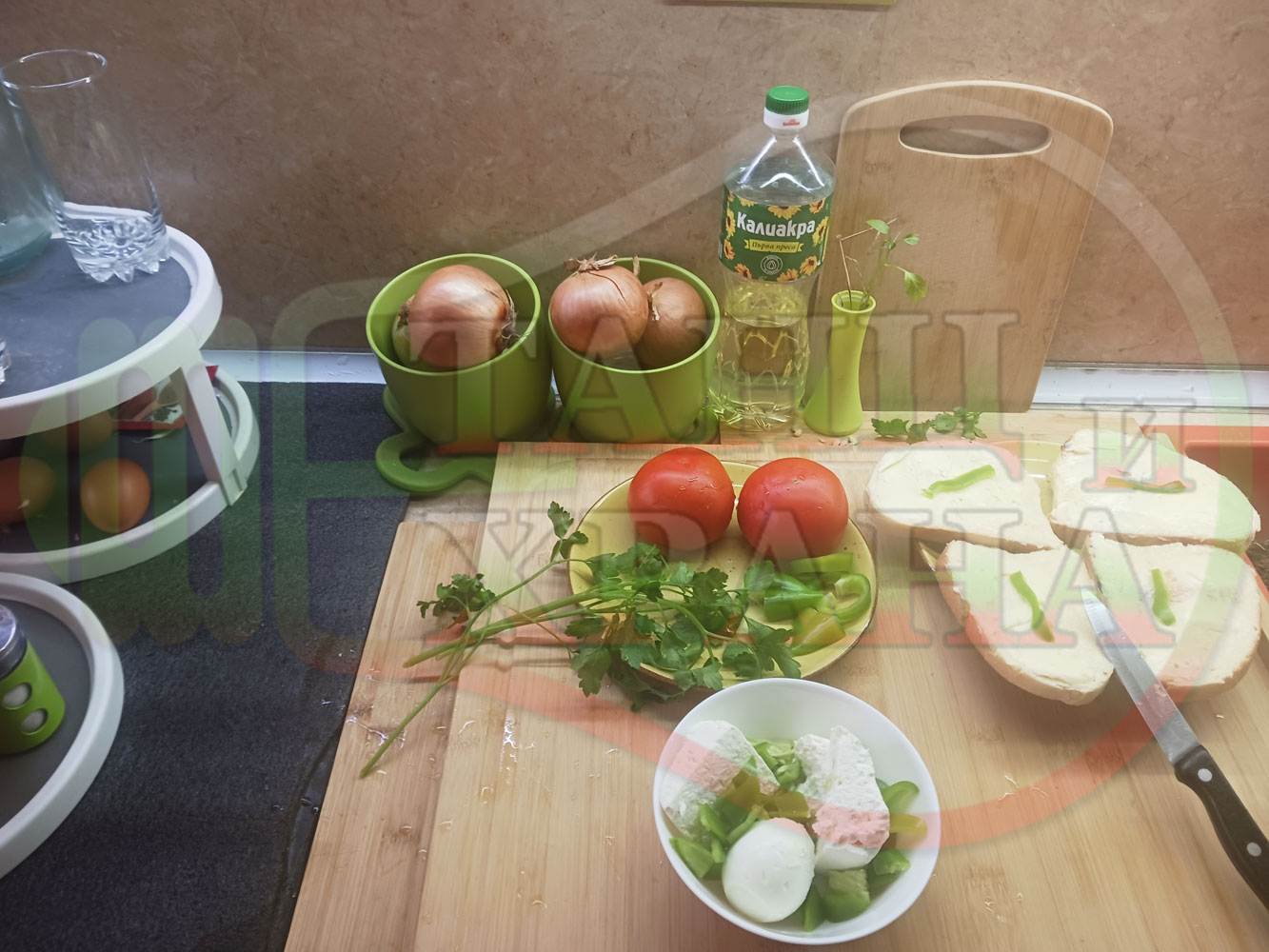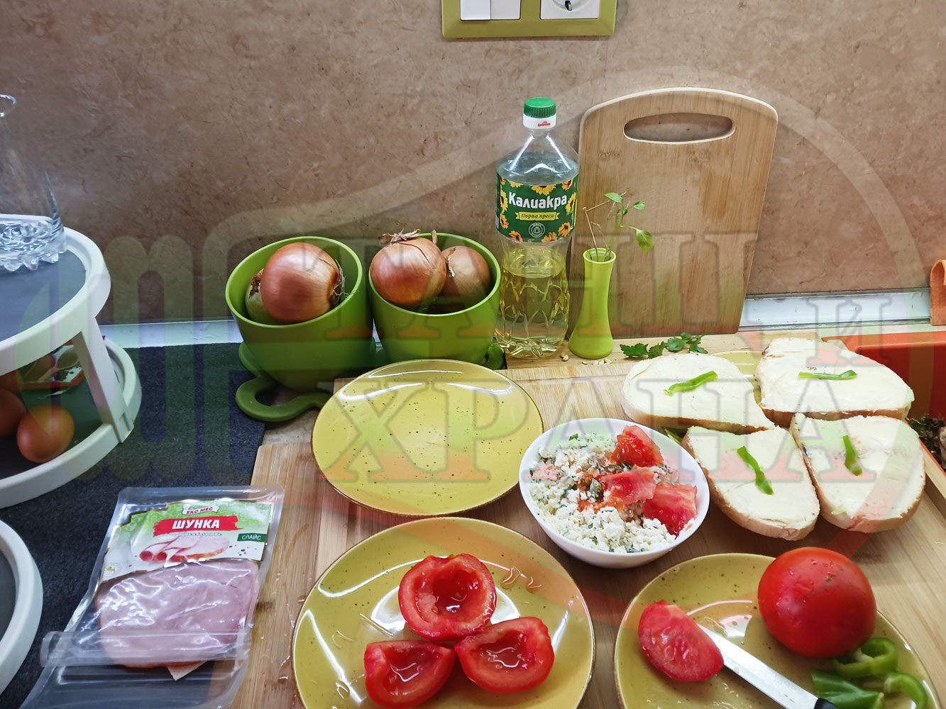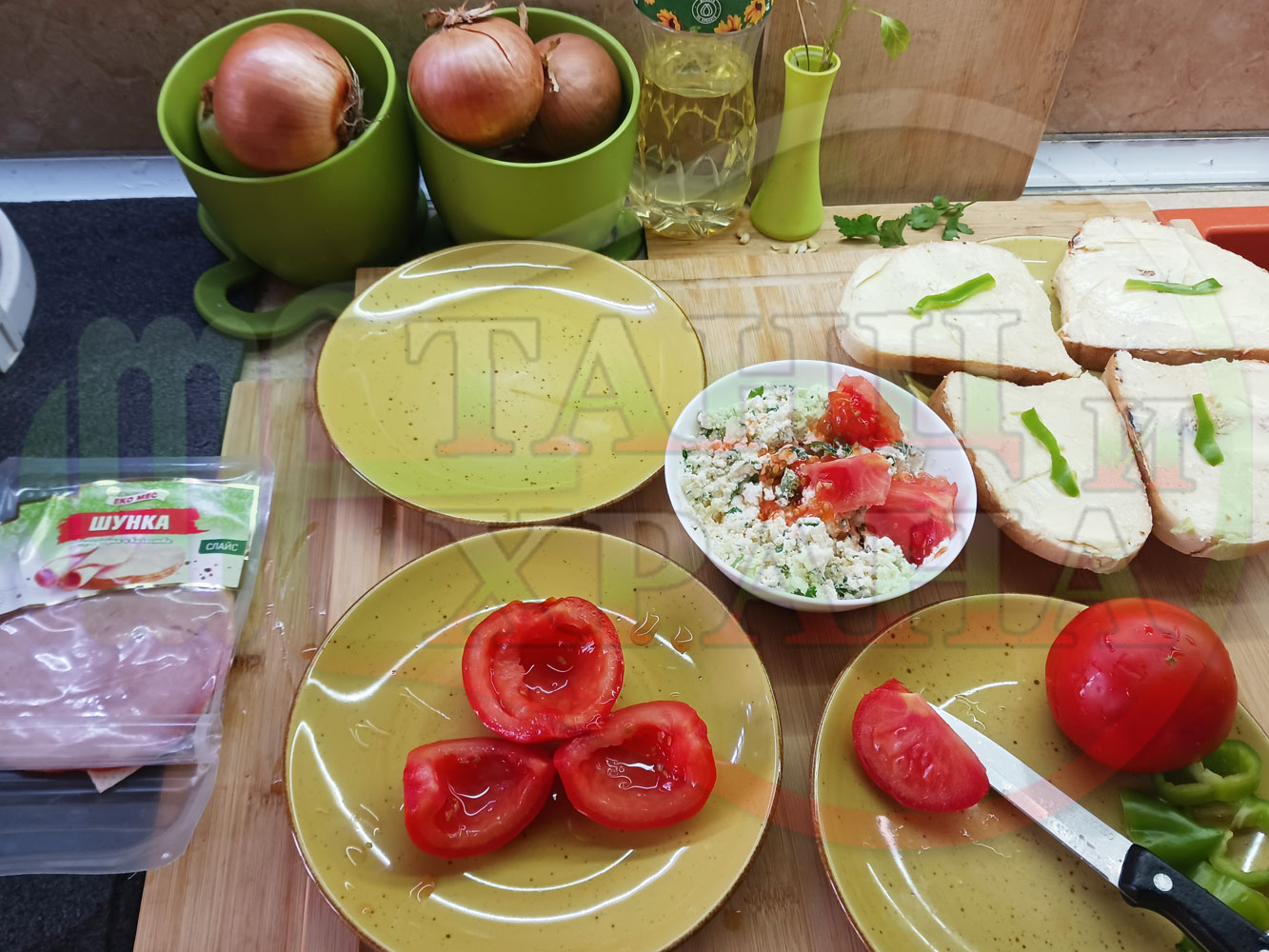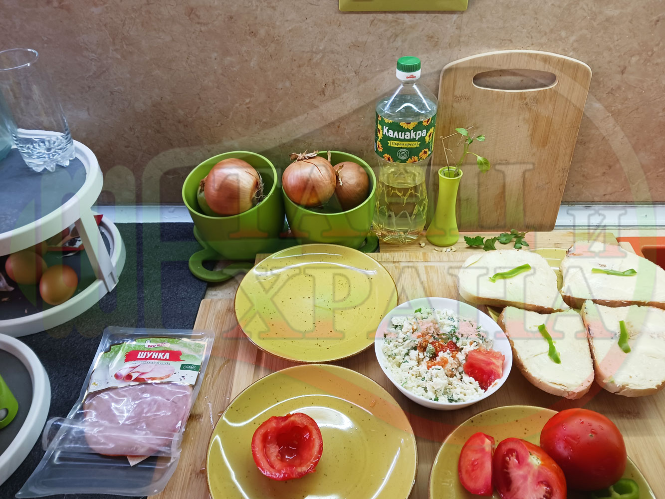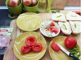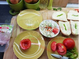 ПРОДУКТИ: Приблизителни количества за българска сурова салата "Пълненодоматена яйченошункова зеленочушкова с БГсирене" приготвена от домати напълнени със сиренов крем с яйца, зелени чушки, магданоз, чесън и краве бяло сирене гарнирана със шунка с кисело мляко от България - двукомпонентна