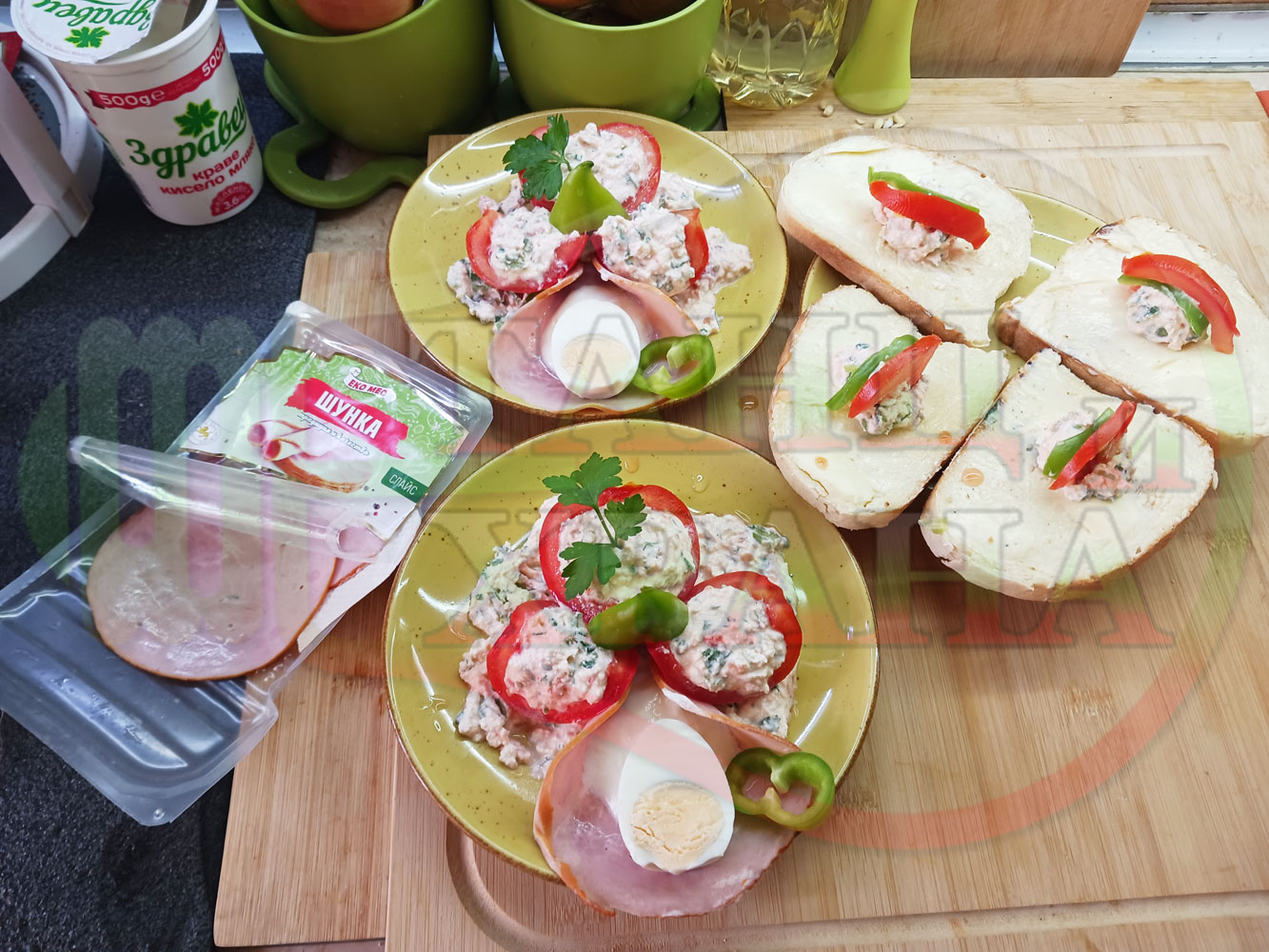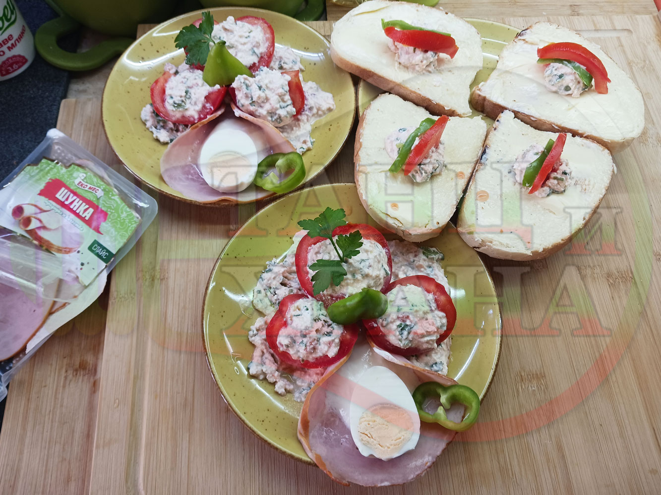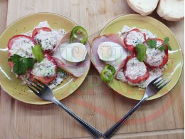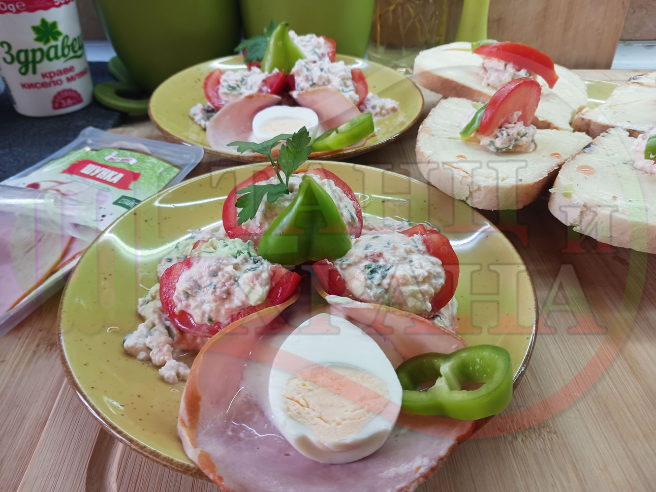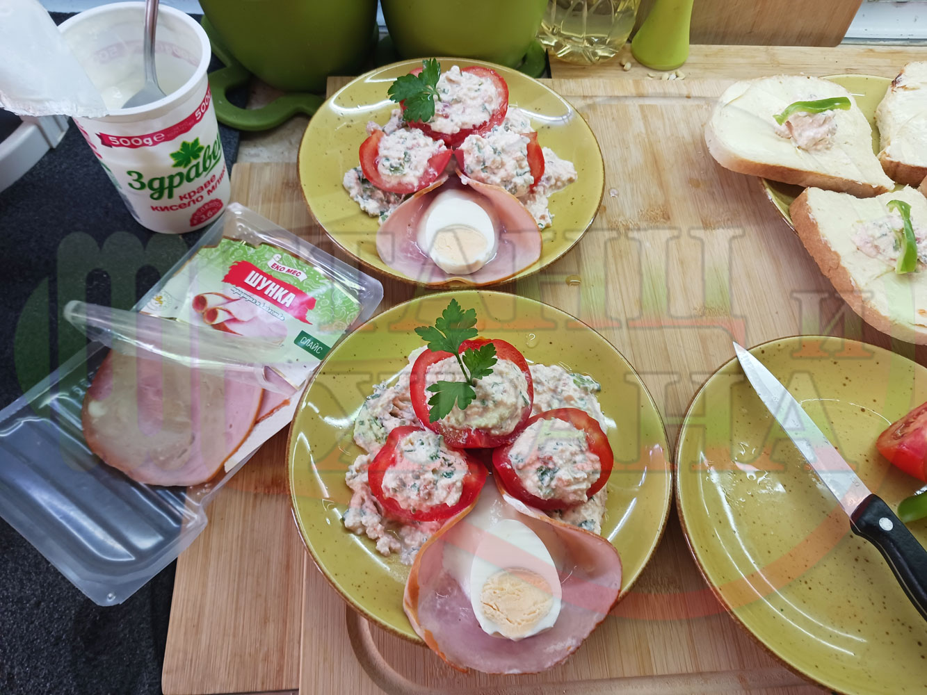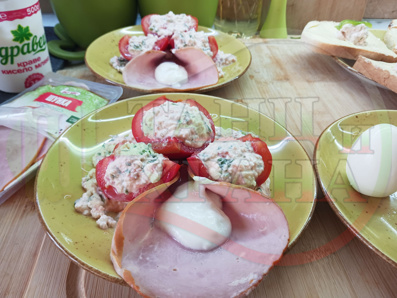 Българска сурова салата "Пълненодоматена яйченошункова зеленочушкова с БГсирене" приготвена от домати напълнени със сиренов крем с яйца, зелени чушки, магданоз, чесън и краве бяло сирене гарнирана със шунка с кисело мляко от България - двукомпонентна
