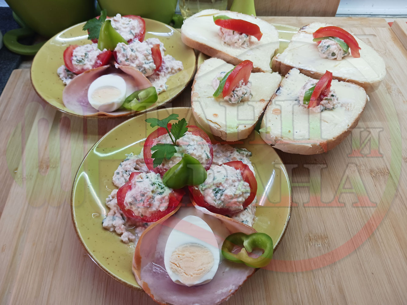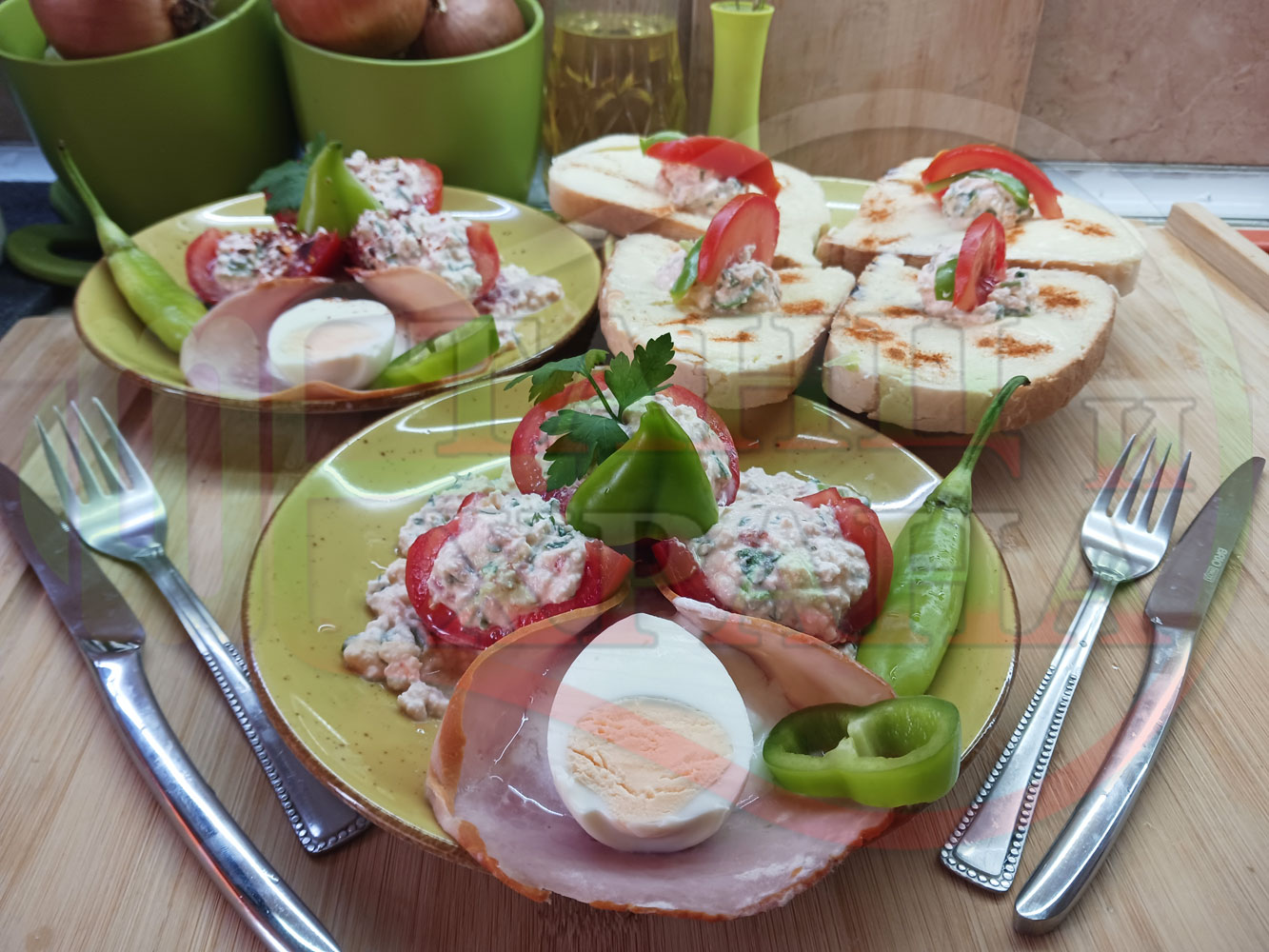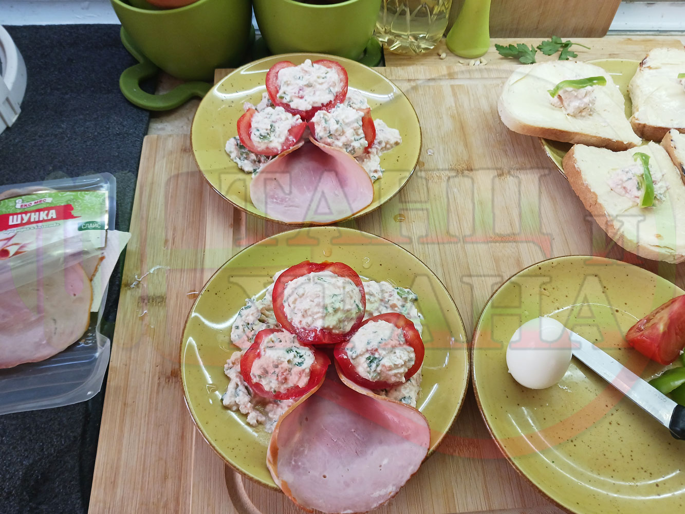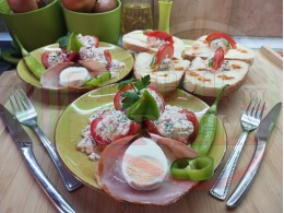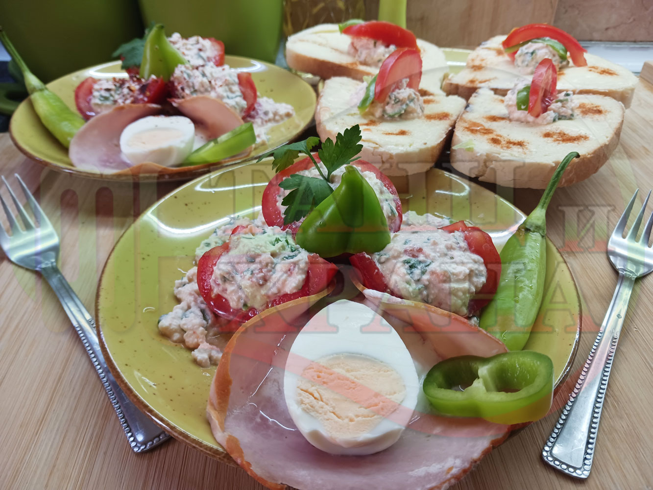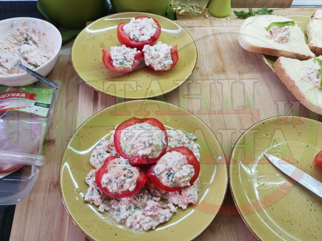Българска сурова салата "Пълненодоматена яйченошункова зеленочушкова с БГсирене" приготвена от домати напълнени със сиренов крем с яйца, зелени чушки, магданоз, чесън и краве бяло сирене гарнирана със шунка с кисело мляко от България - двукомпонентна
