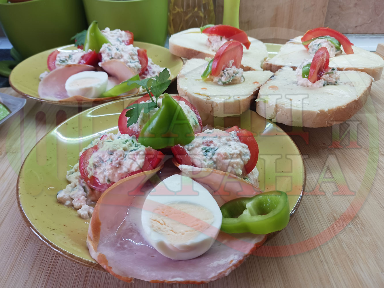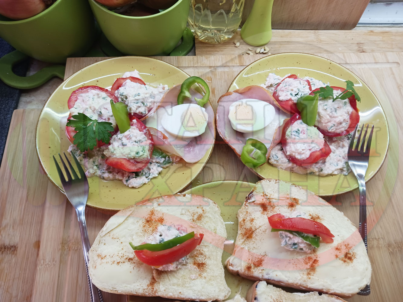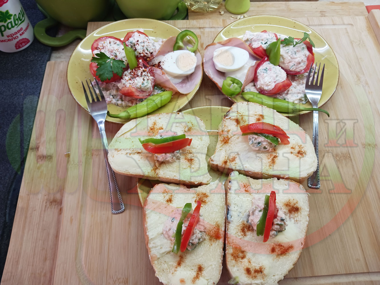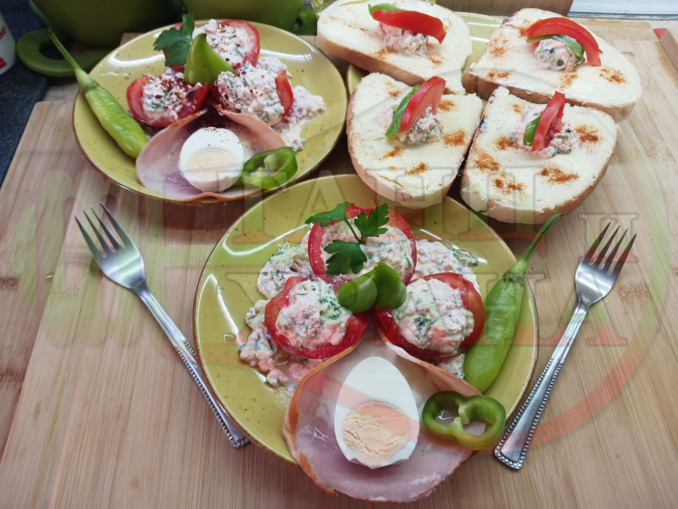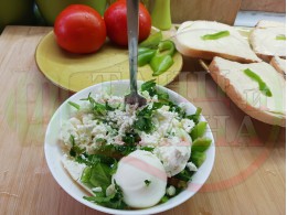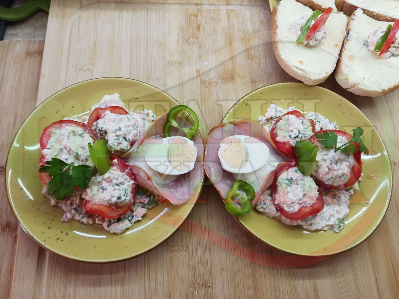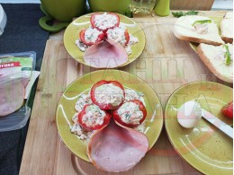 Българска сурова салата "Пълненодоматена яйченошункова зеленочушкова с БГсирене" приготвена от домати напълнени със сиренов крем с яйца, зелени чушки, магданоз, чесън и краве бяло сирене гарнирана със шунка с кисело мляко от България - двукомпонентна
