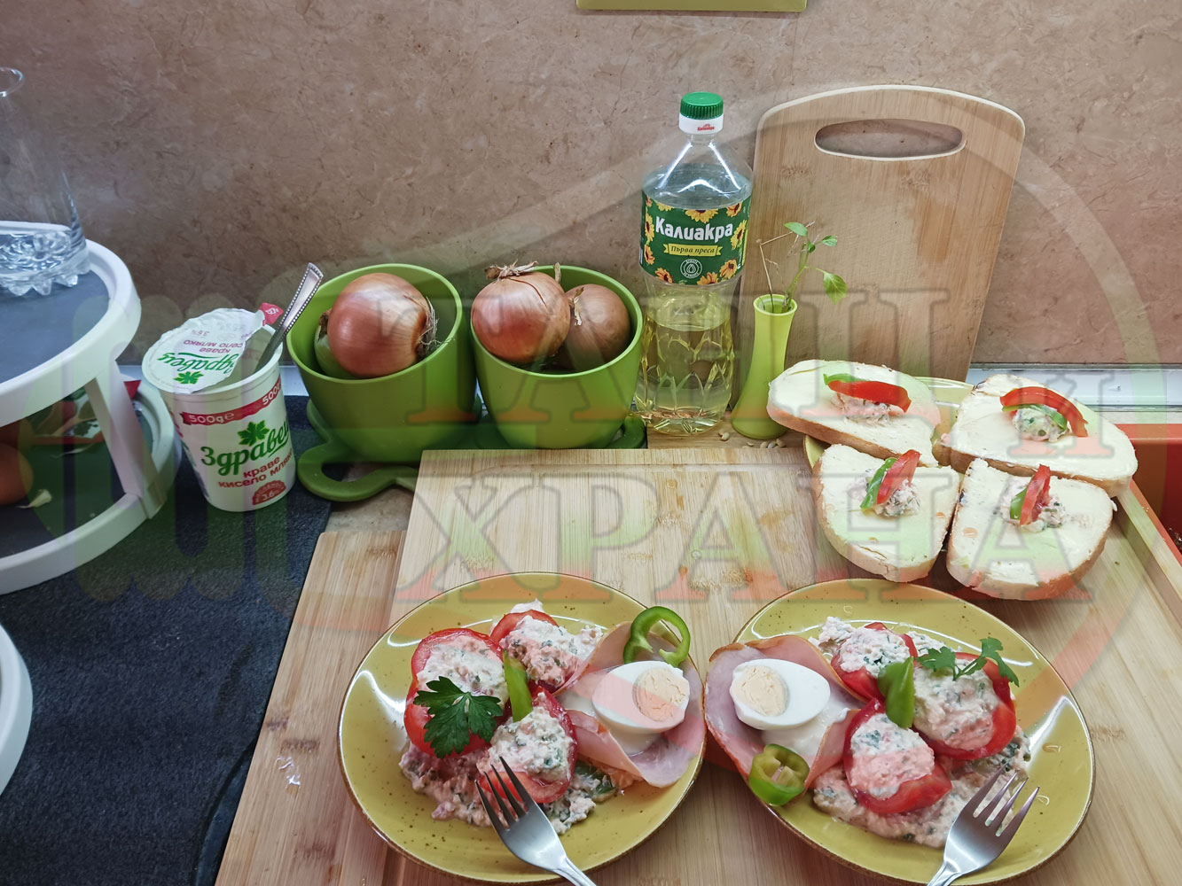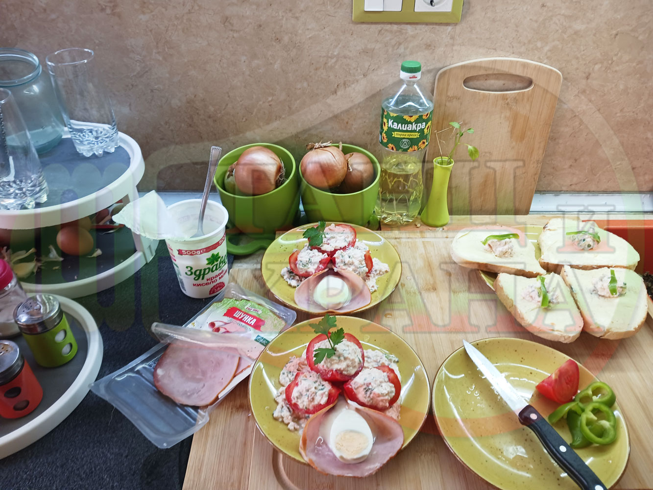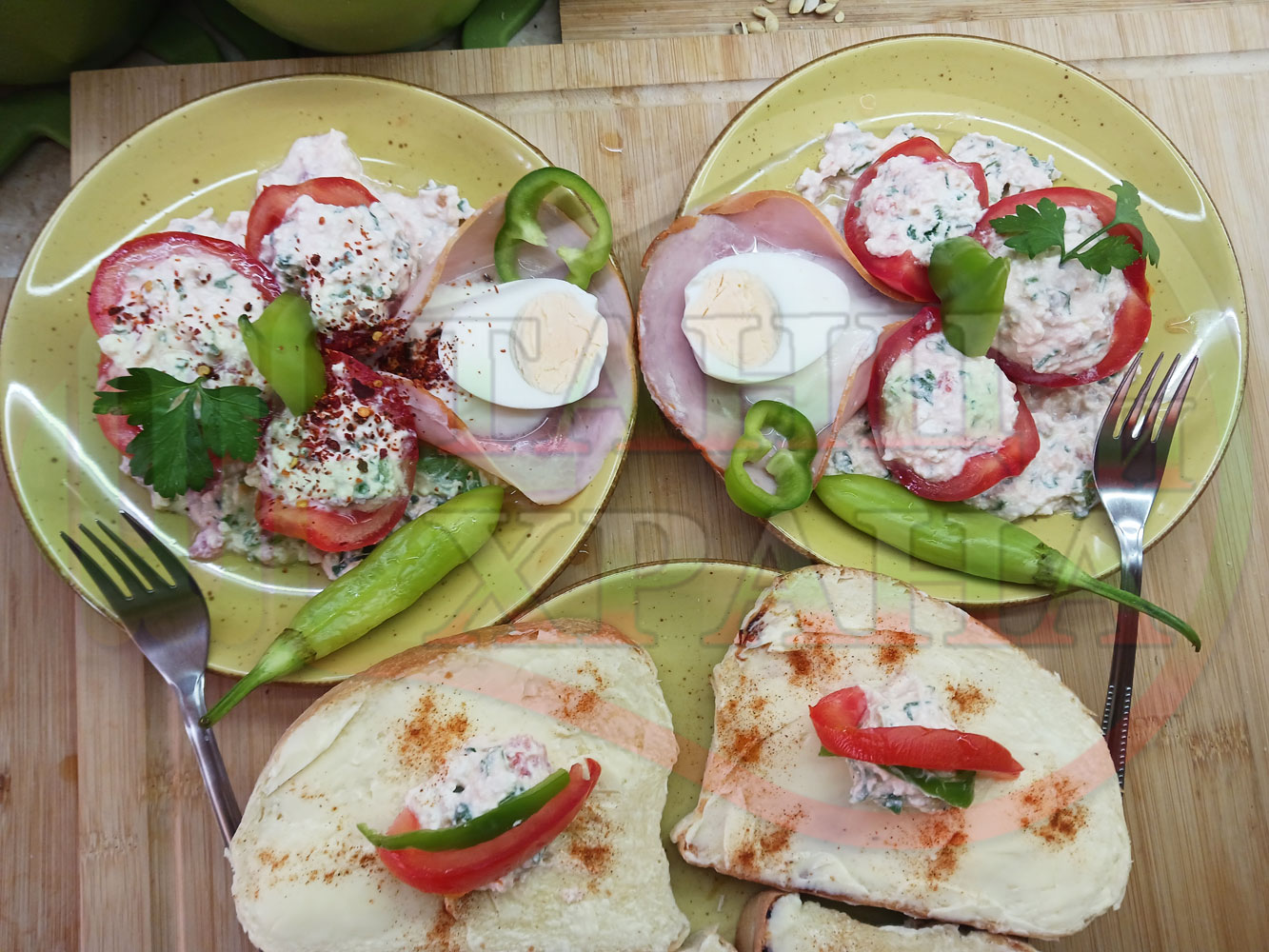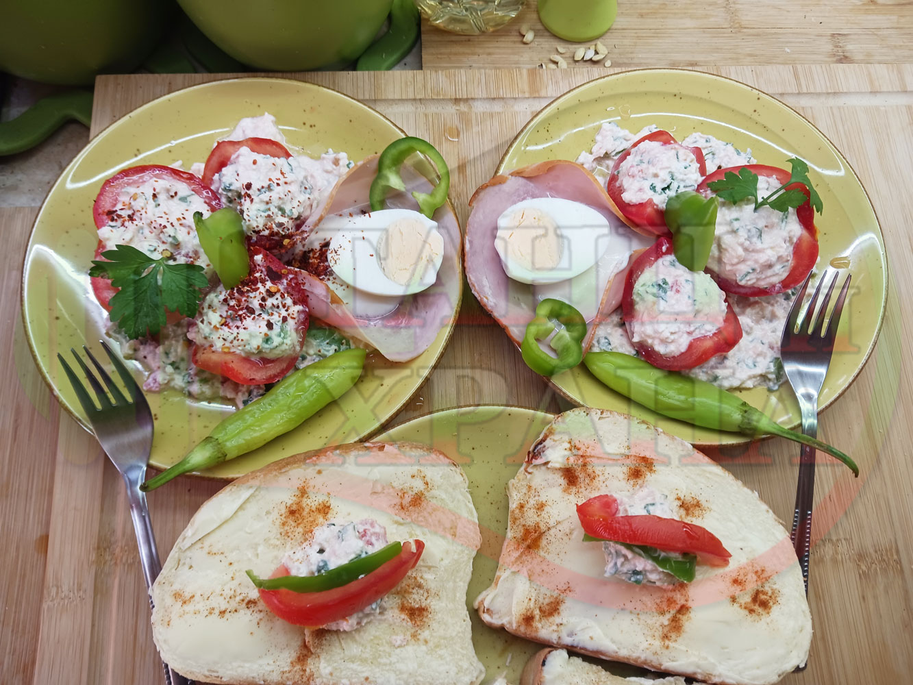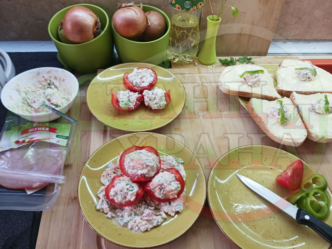 Българска сурова салата "Пълненодоматена яйченошункова зеленочушкова с БГсирене" приготвена от домати напълнени със сиренов крем с яйца, зелени чушки, магданоз, чесън и краве бяло сирене гарнирана със шунка с кисело мляко от България - двукомпонентна