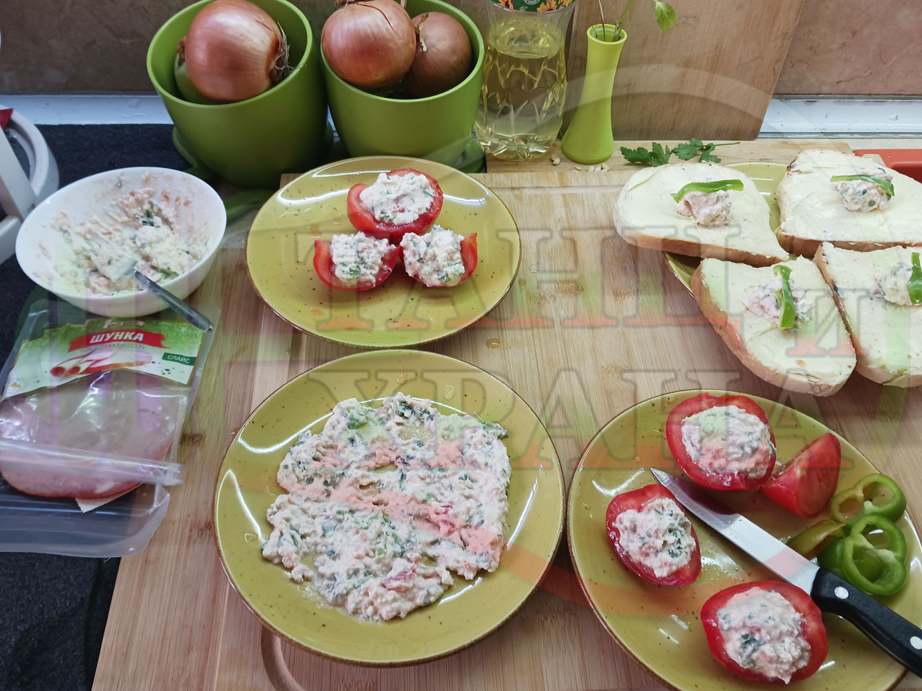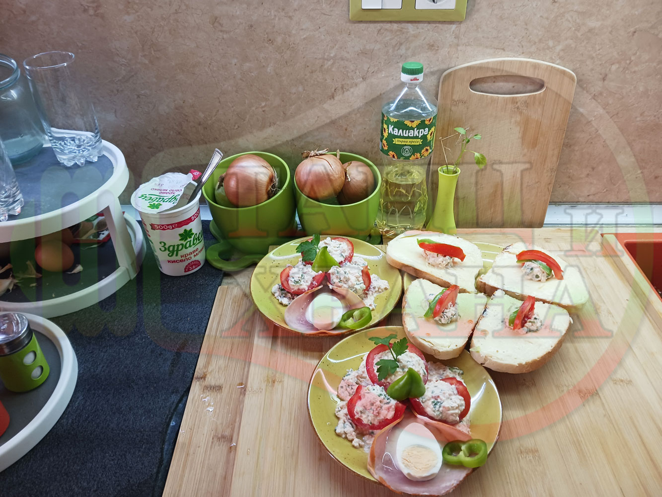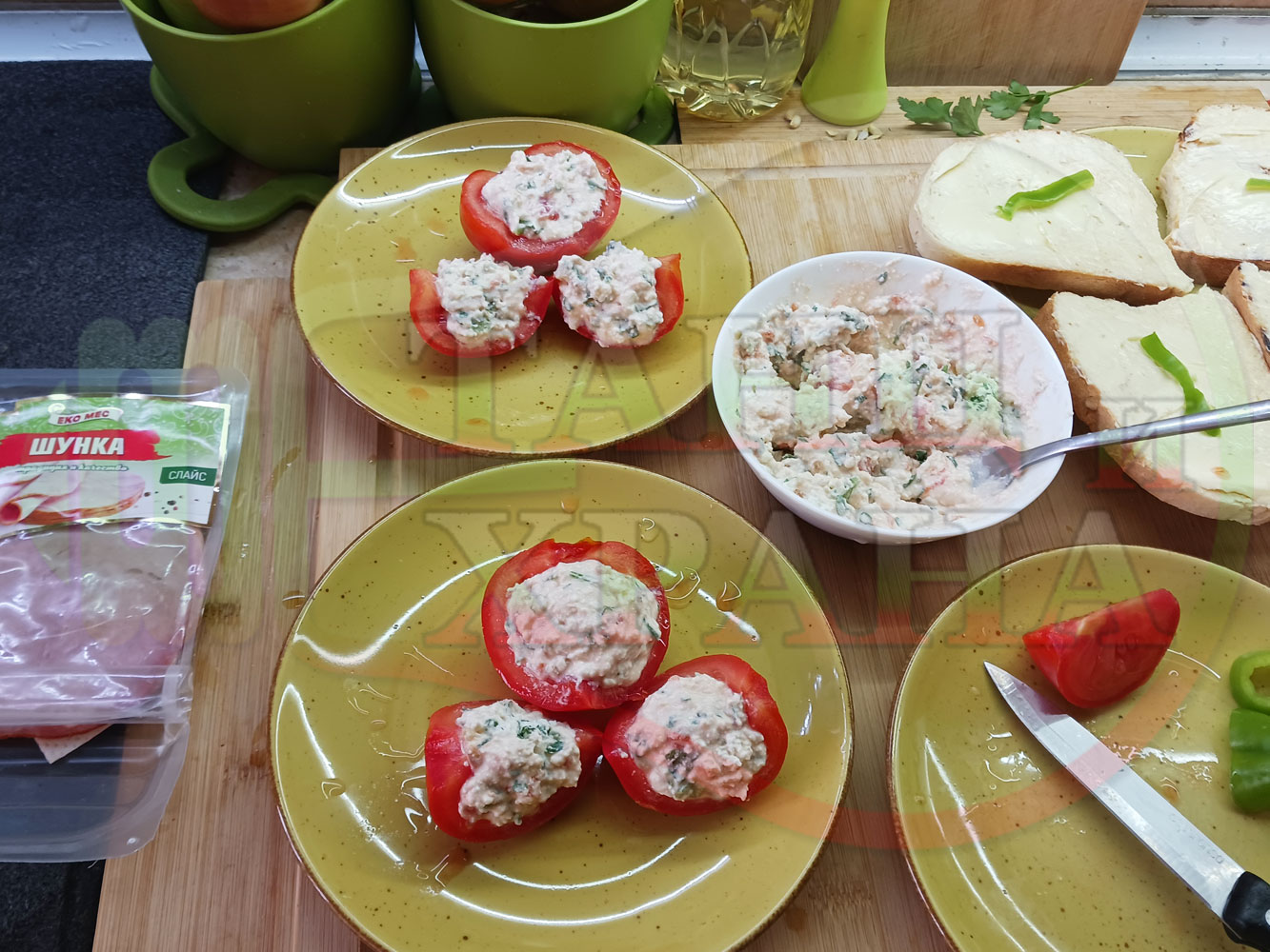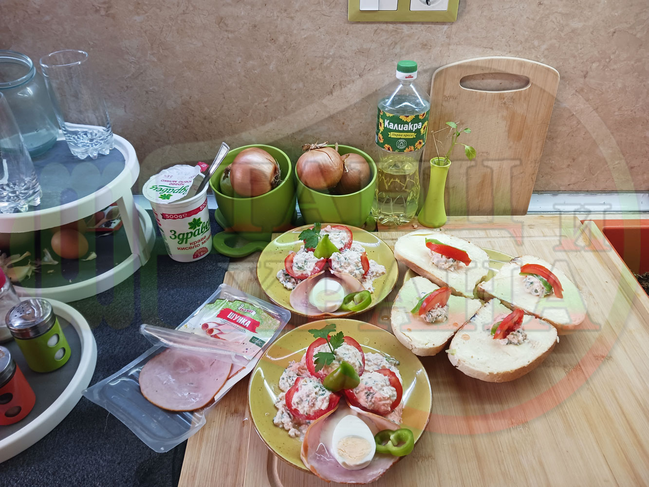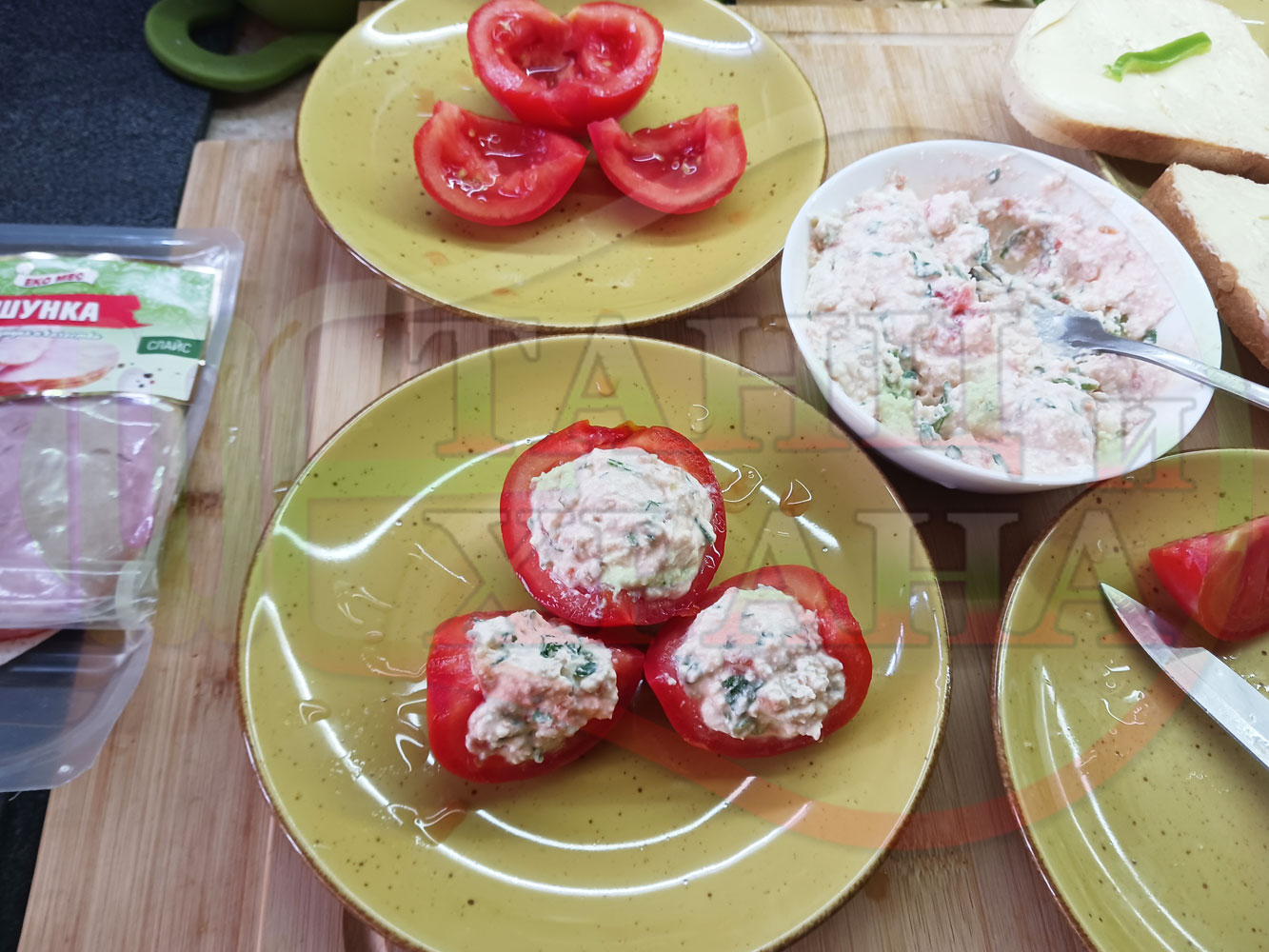 Българска сурова салата "Пълненодоматена яйченошункова зеленочушкова с БГсирене" приготвена от домати напълнени със сиренов крем с яйца, зелени чушки, магданоз, чесън и краве бяло сирене гарнирана със шунка с кисело мляко от България - двукомпонентна