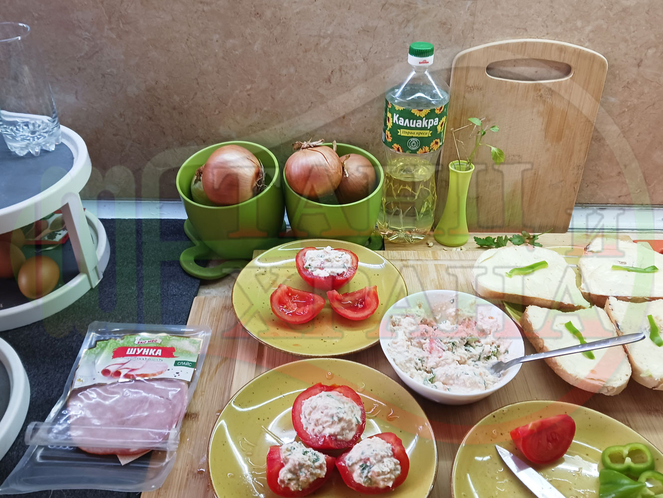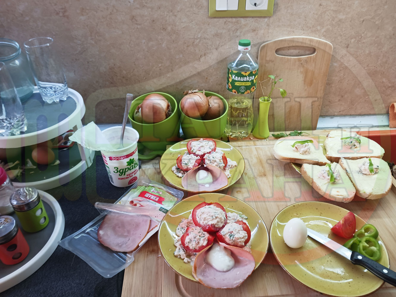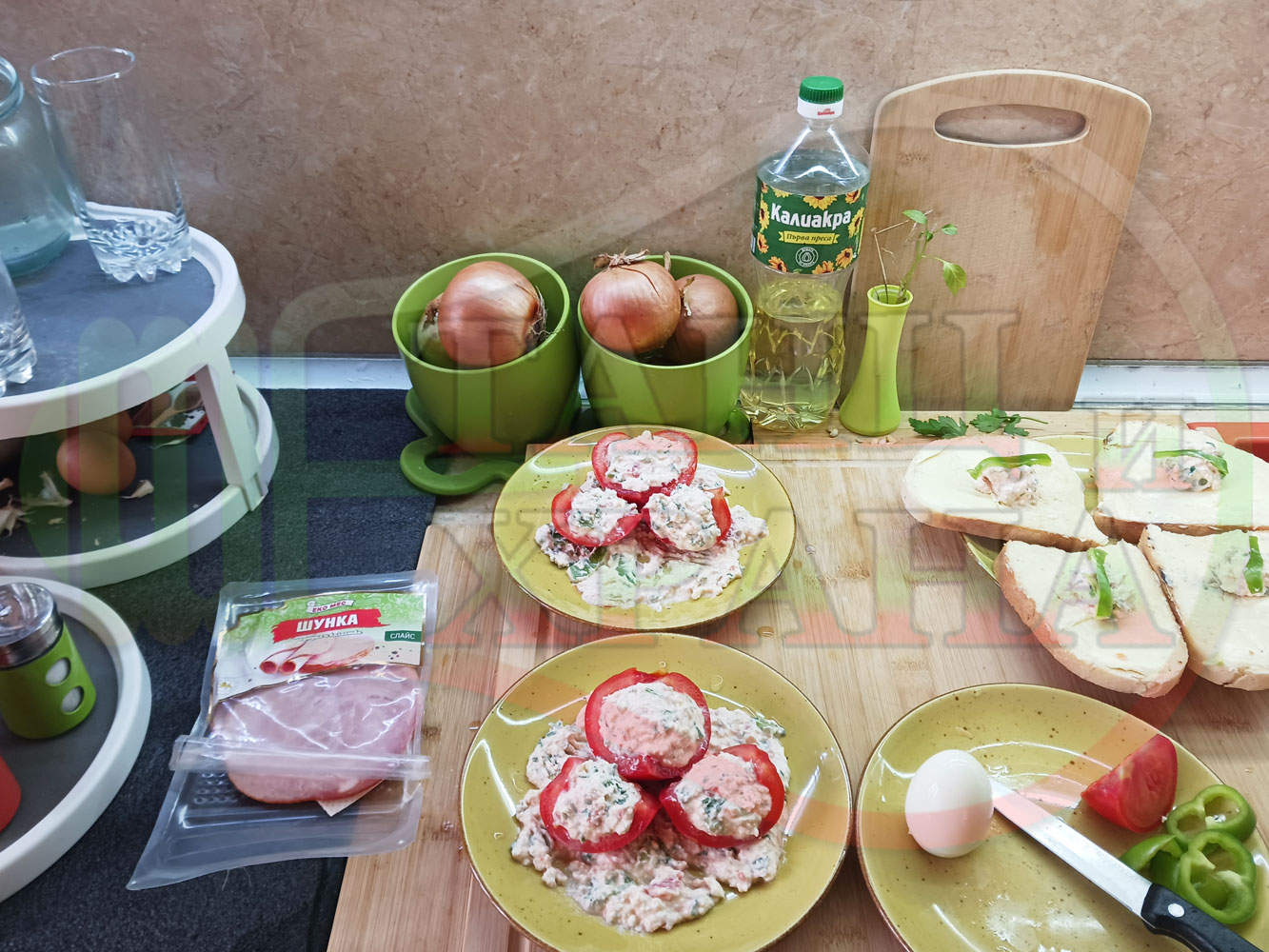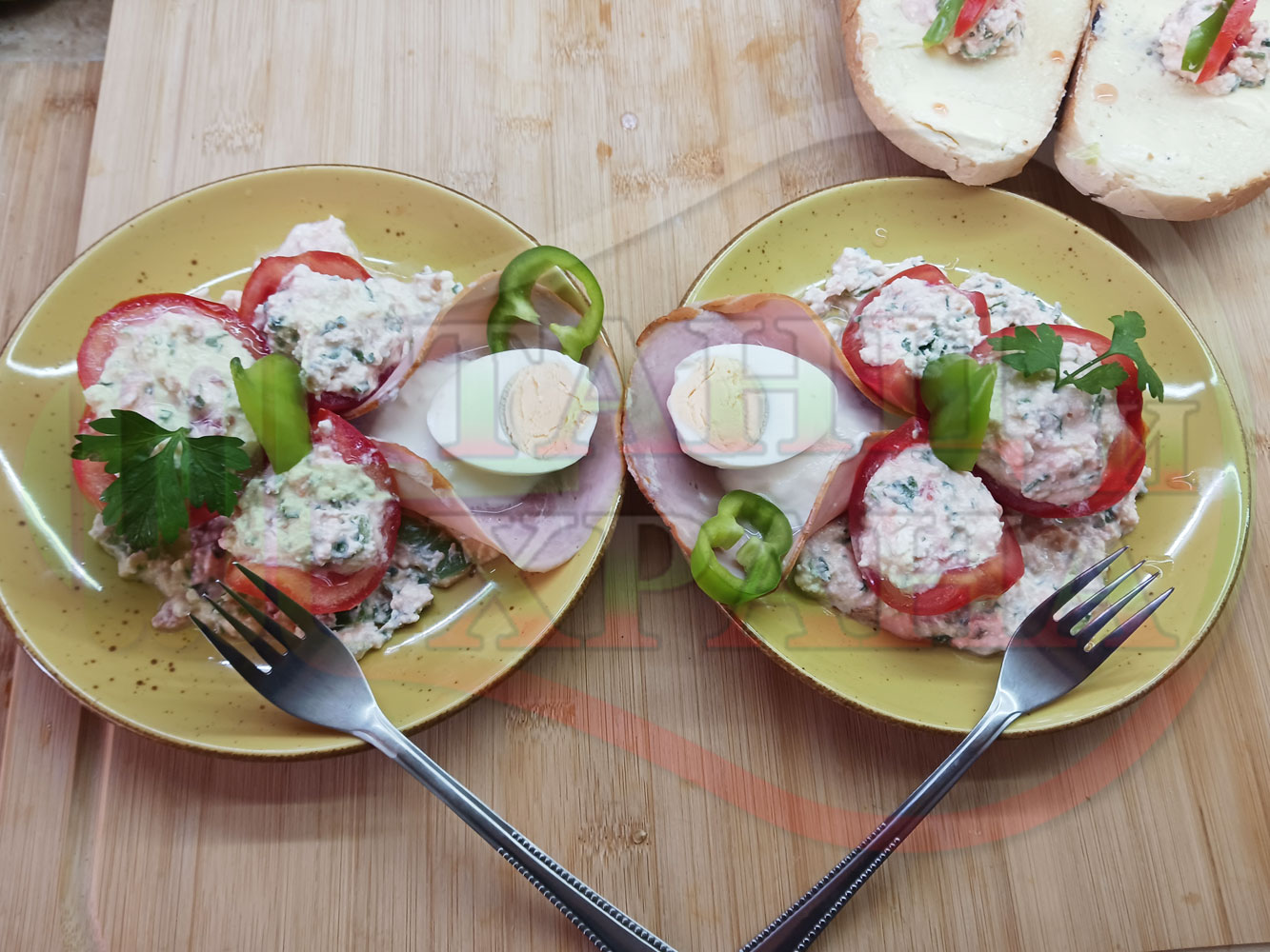 Българска сурова салата "Пълненодоматена яйченошункова зеленочушкова с БГсирене" приготвена от домати напълнени със сиренов крем с яйца, зелени чушки, магданоз, чесън и краве бяло сирене гарнирана със шунка с кисело мляко от България - двукомпонентна