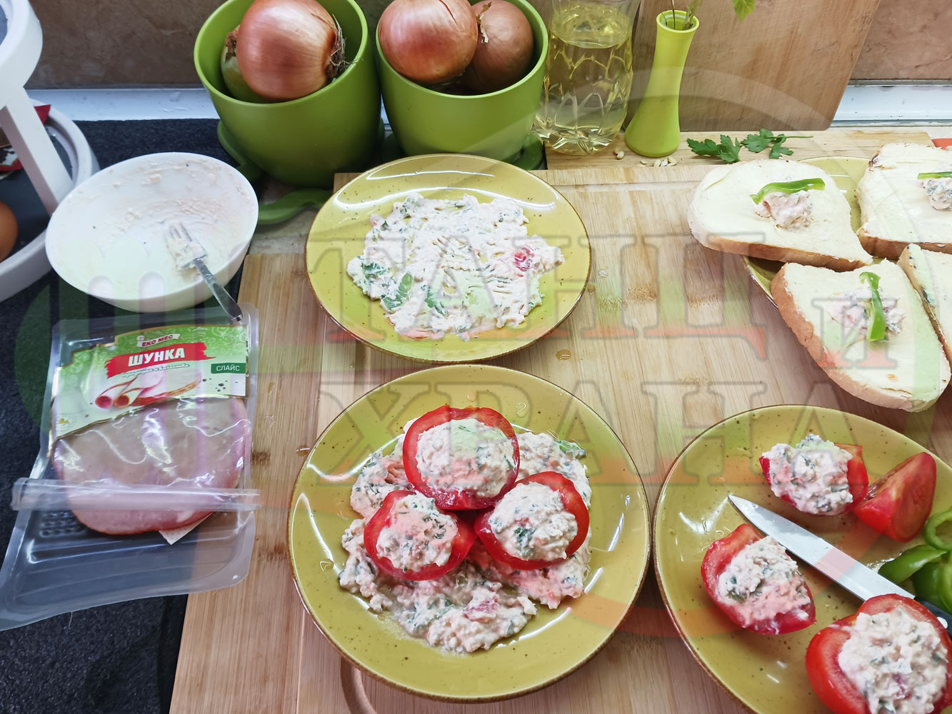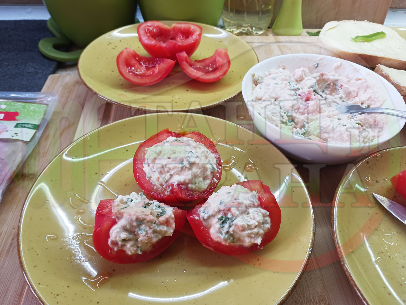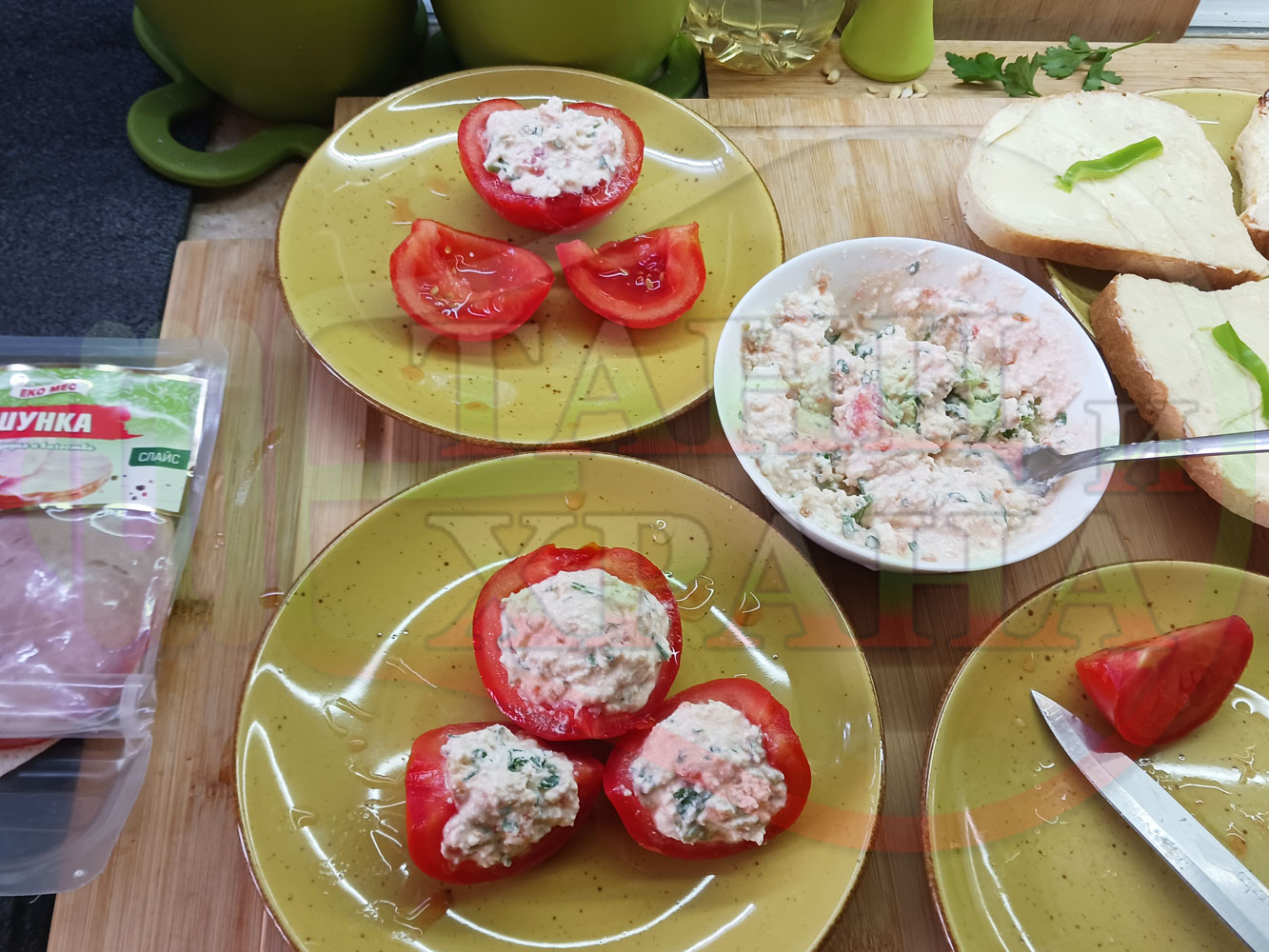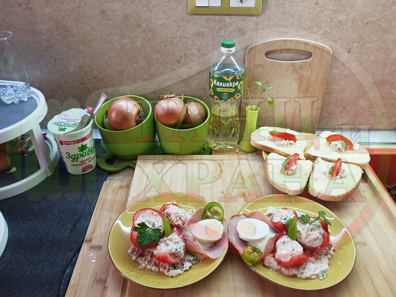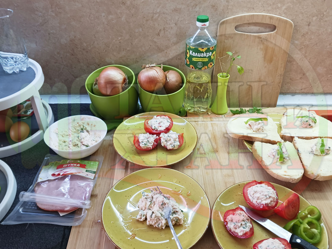 Българска сурова салата "Пълненодоматена яйченошункова зеленочушкова с БГсирене" приготвена от домати напълнени със сиренов крем с яйца, зелени чушки, магданоз, чесън и краве бяло сирене гарнирана със шунка с кисело мляко от България - двукомпонентна