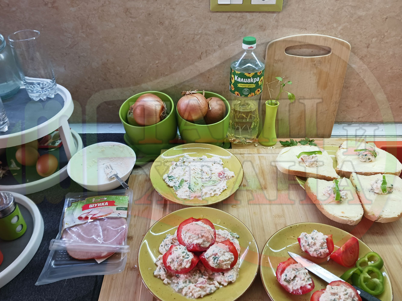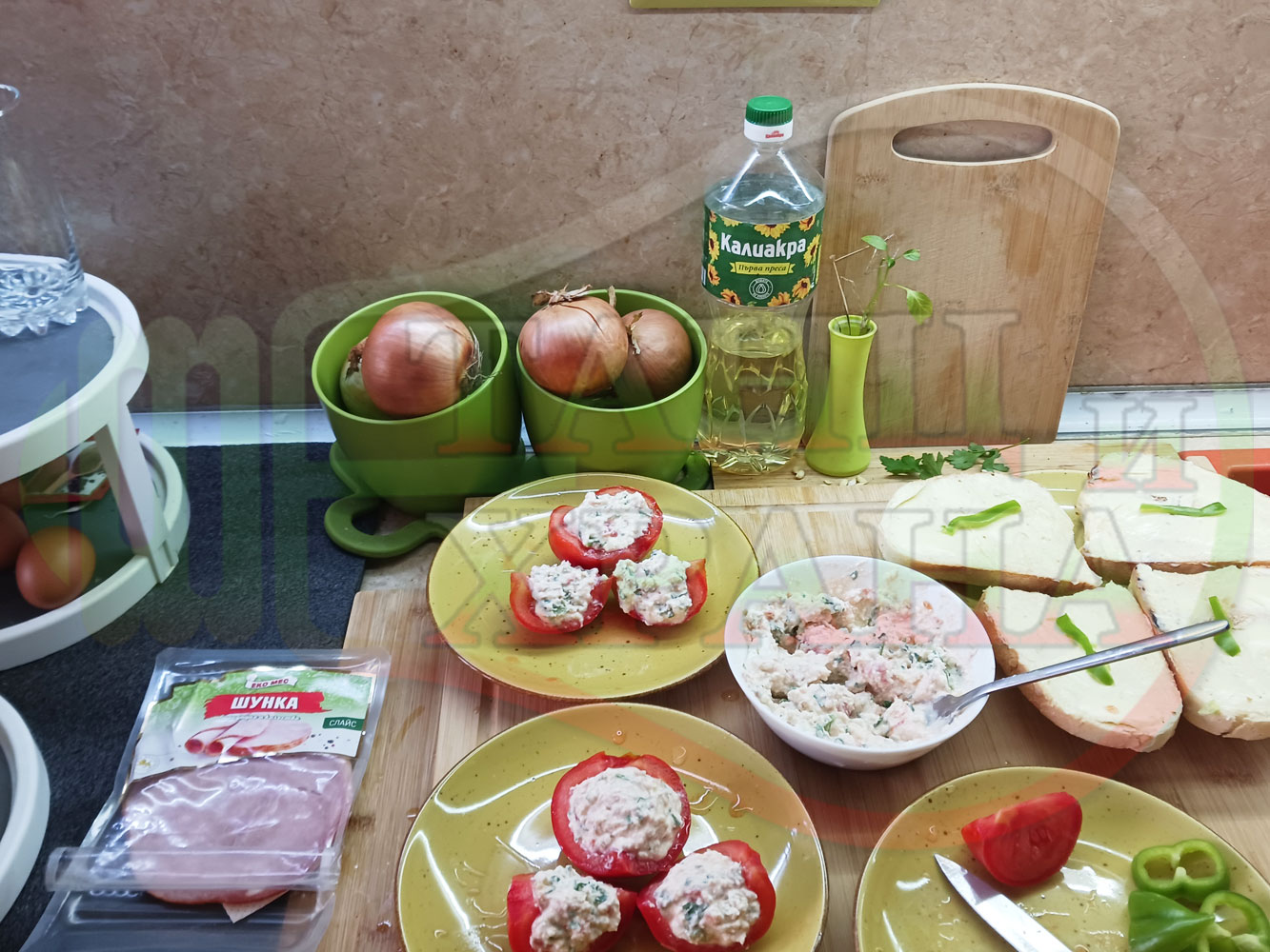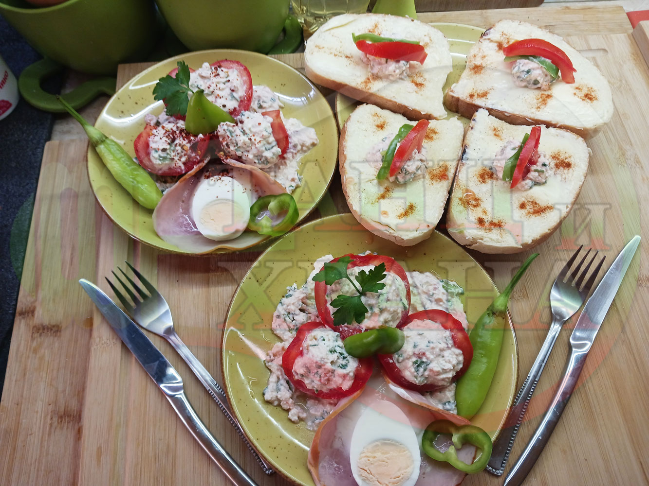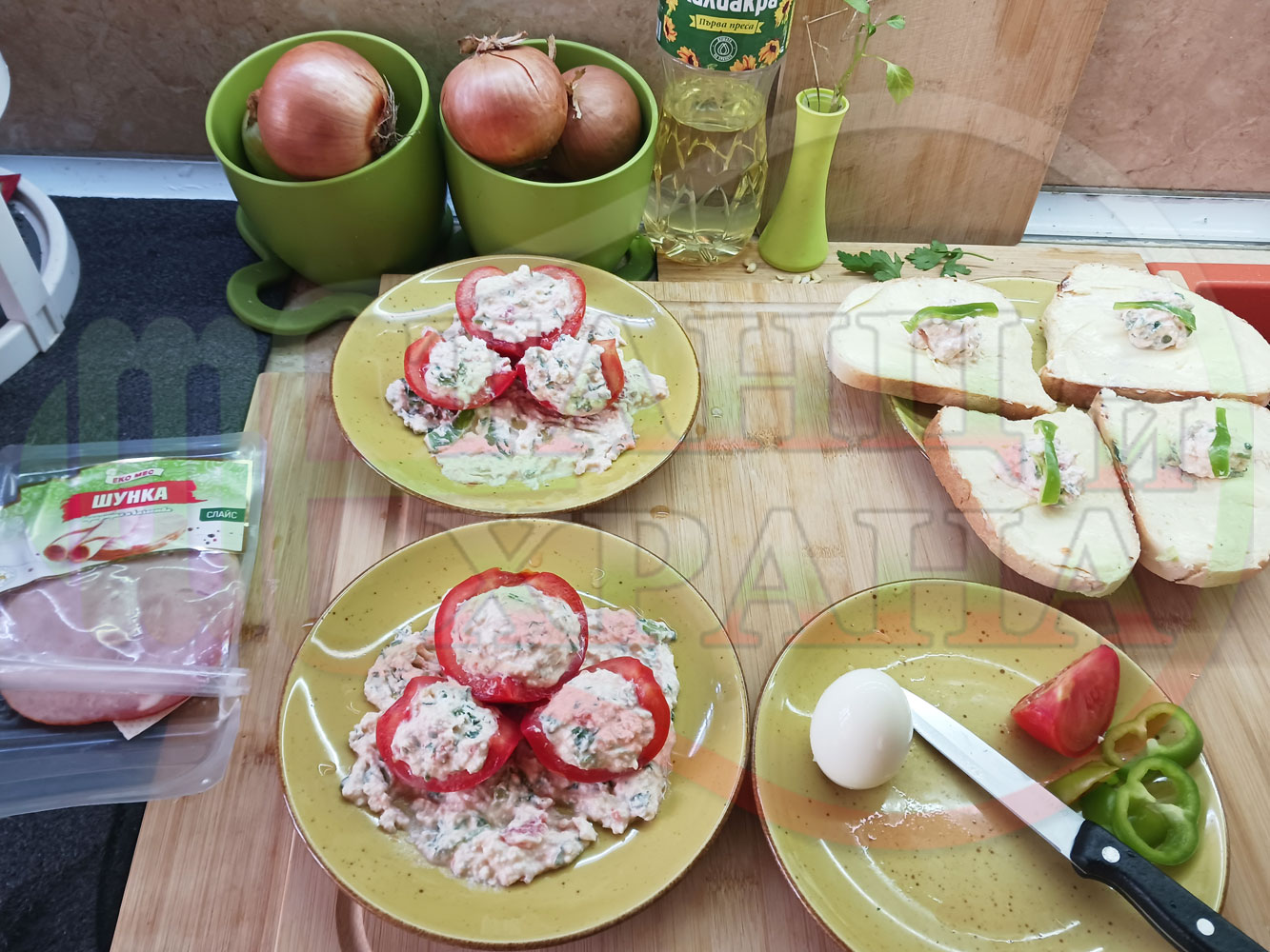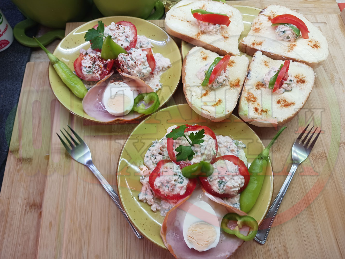 Българска сурова салата "Пълненодоматена яйченошункова зеленочушкова с БГсирене" приготвена от домати напълнени със сиренов крем с яйца, зелени чушки, магданоз, чесън и краве бяло сирене гарнирана със шунка с кисело мляко от България - двукомпонентна