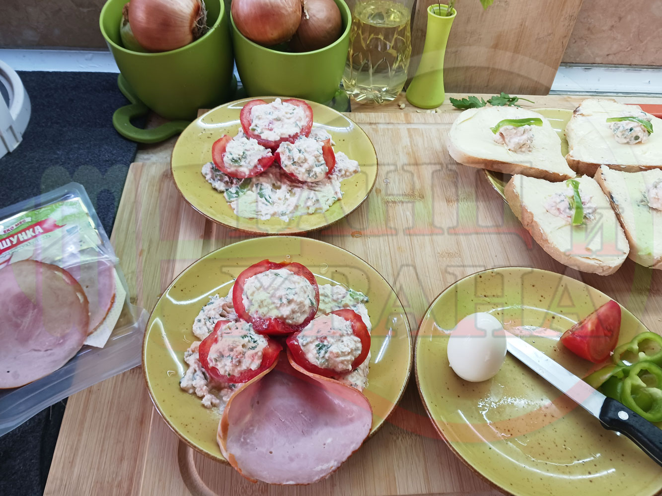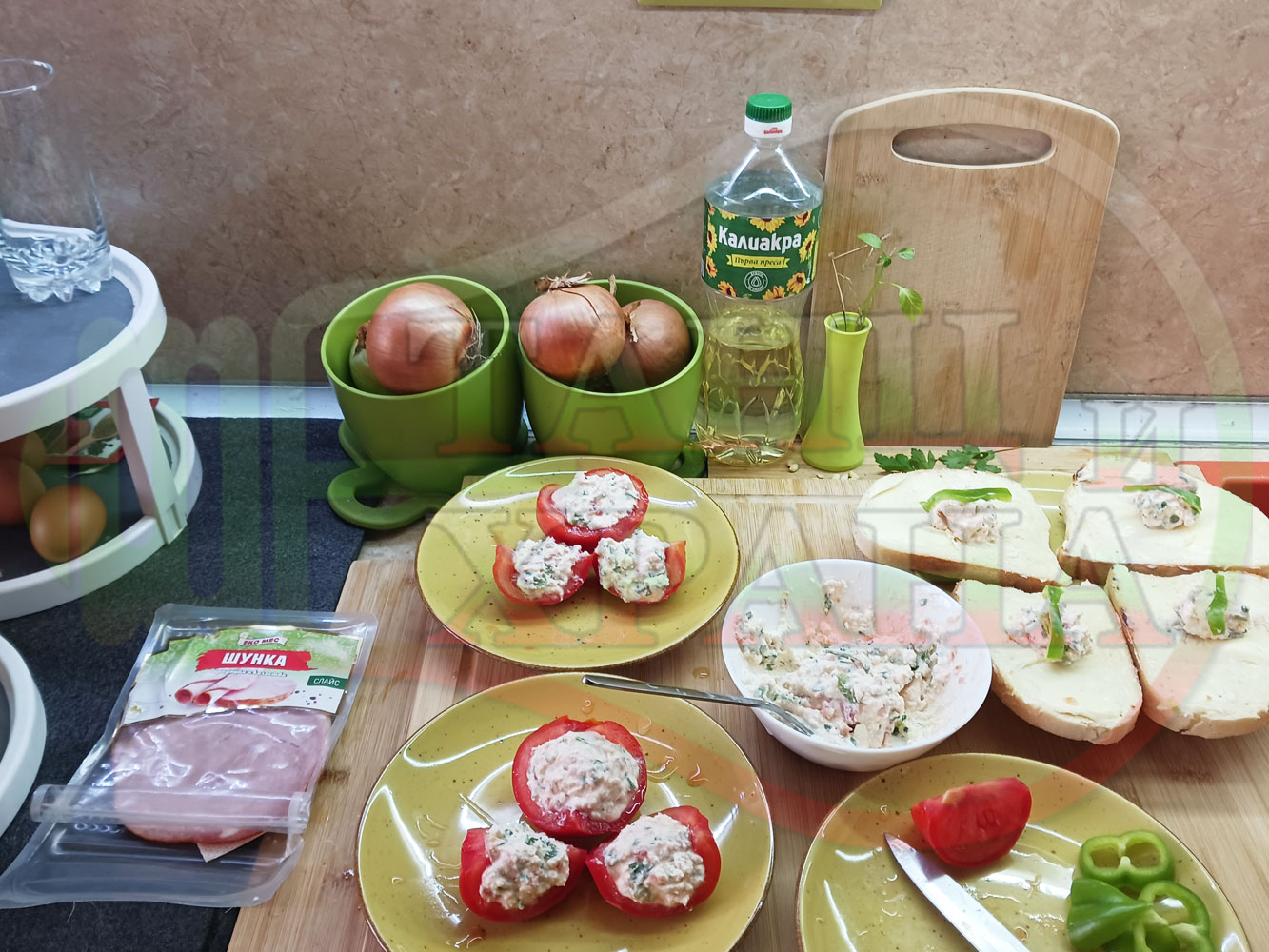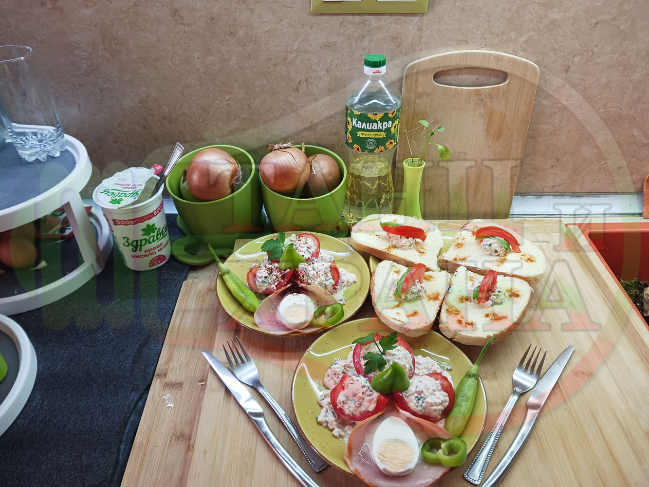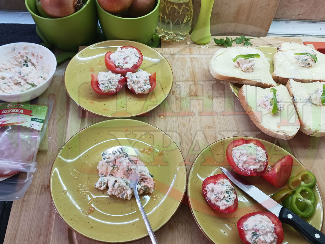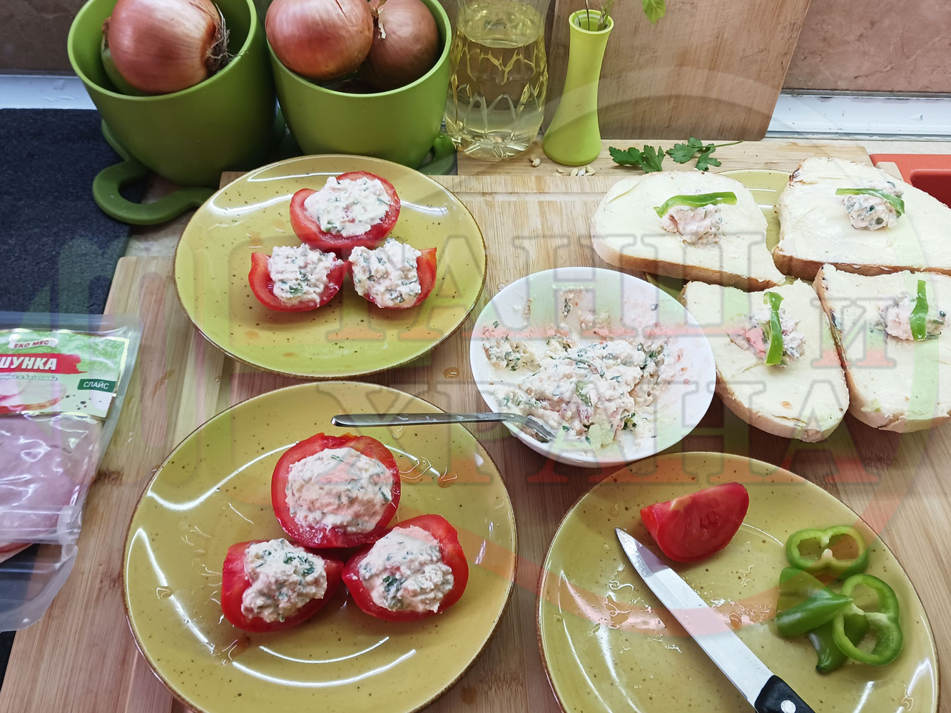 Българска сурова салата "Пълненодоматена яйченошункова зеленочушкова с БГсирене" приготвена от домати напълнени със сиренов крем с яйца, зелени чушки, магданоз, чесън и краве бяло сирене гарнирана със шунка с кисело мляко от България - двукомпонентна