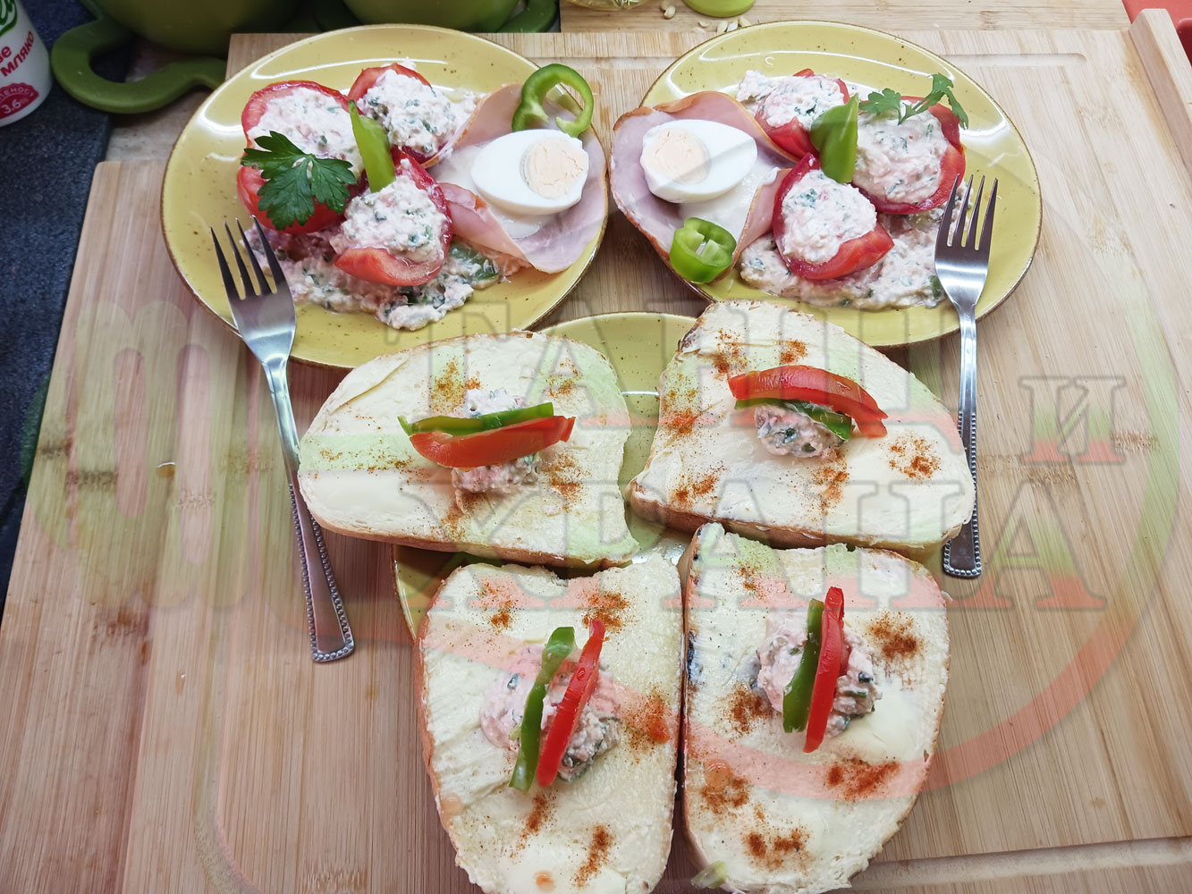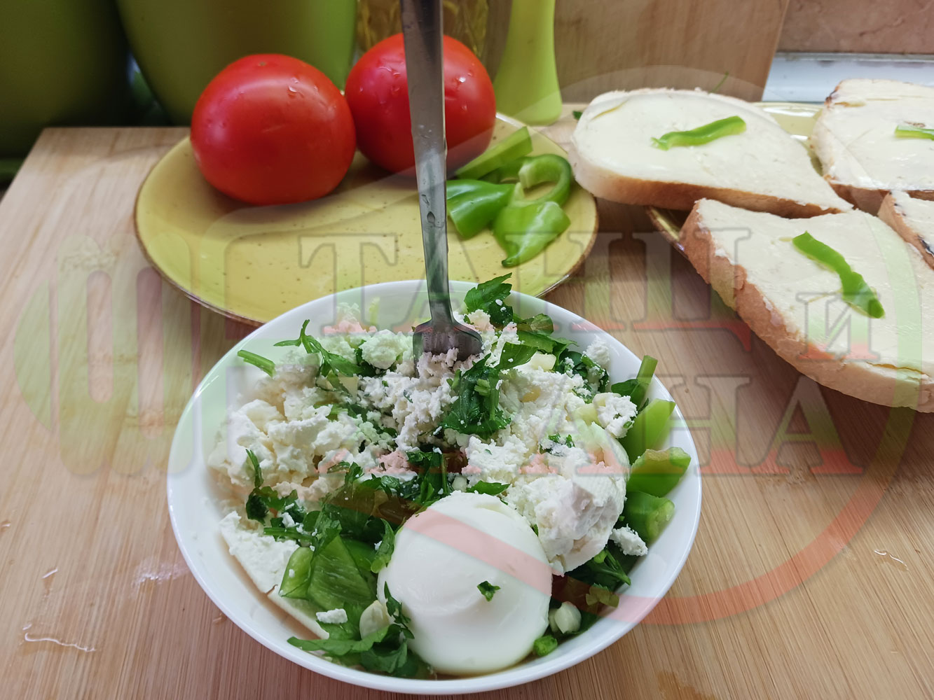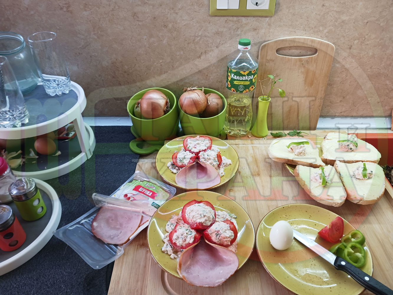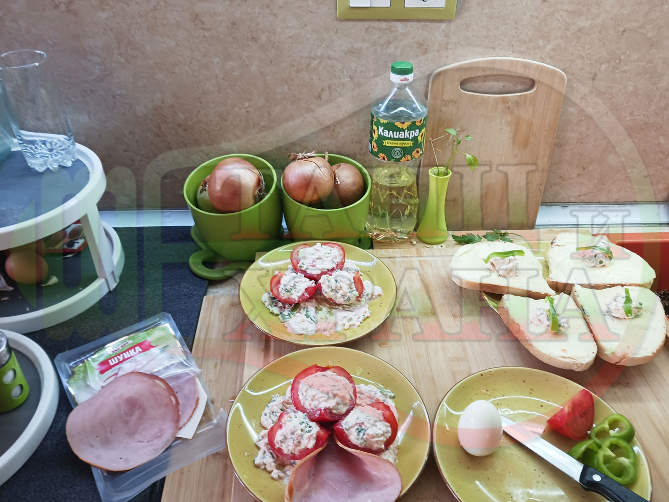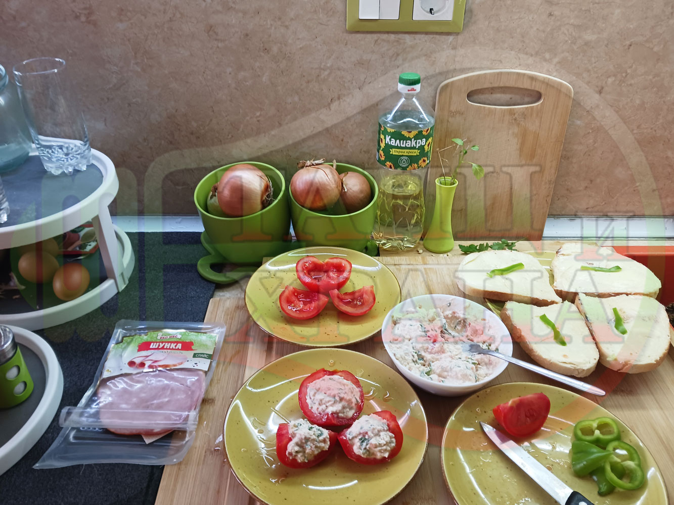 Българска сурова салата "Пълненодоматена яйченошункова зеленочушкова с БГсирене" приготвена от домати напълнени със сиренов крем с яйца, зелени чушки, магданоз, чесън и краве бяло сирене гарнирана със шунка с кисело мляко от България - двукомпонентна