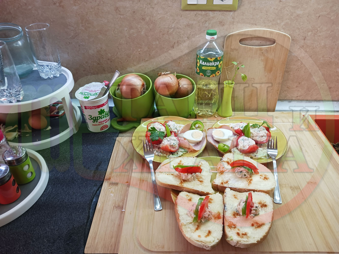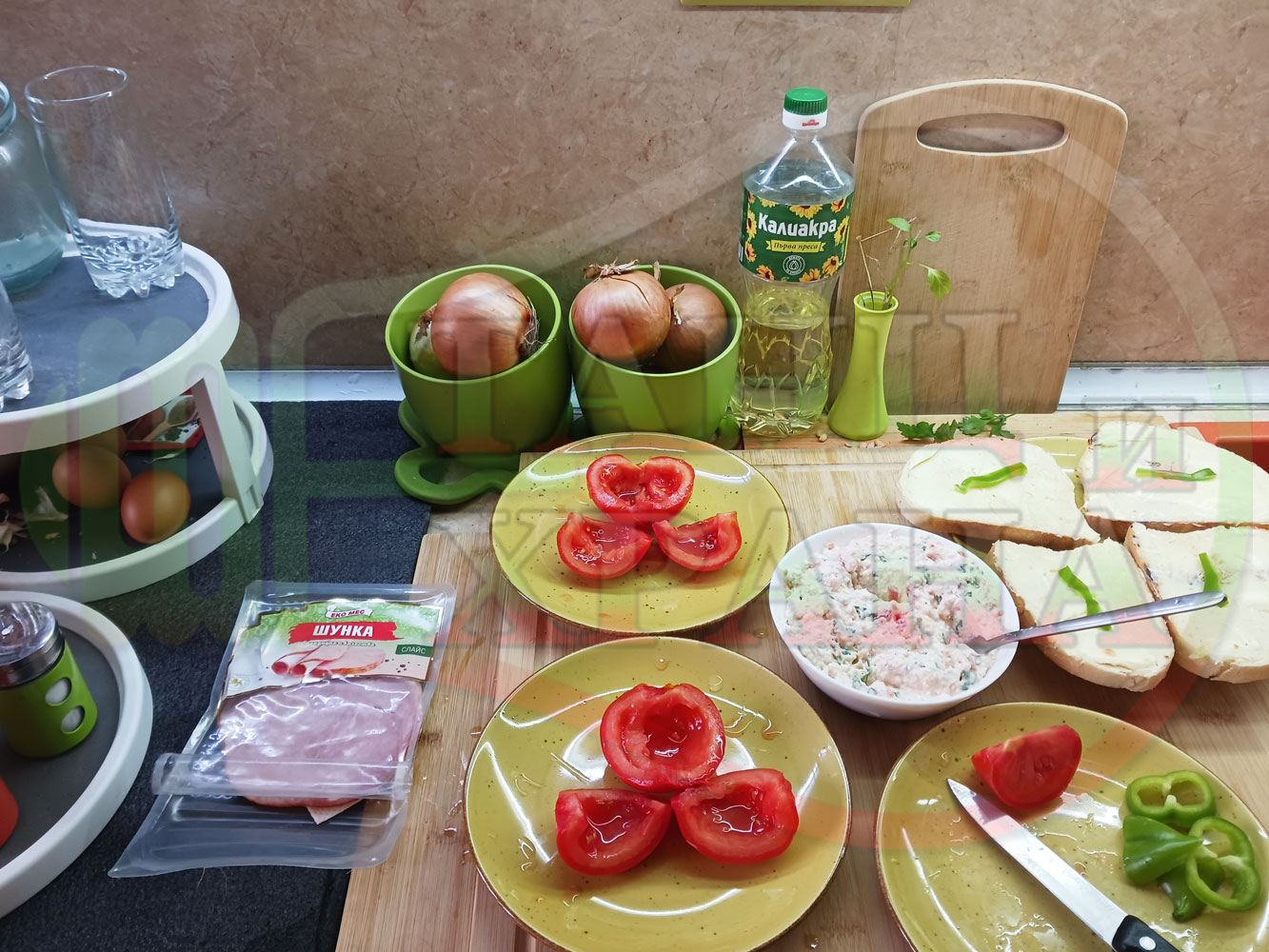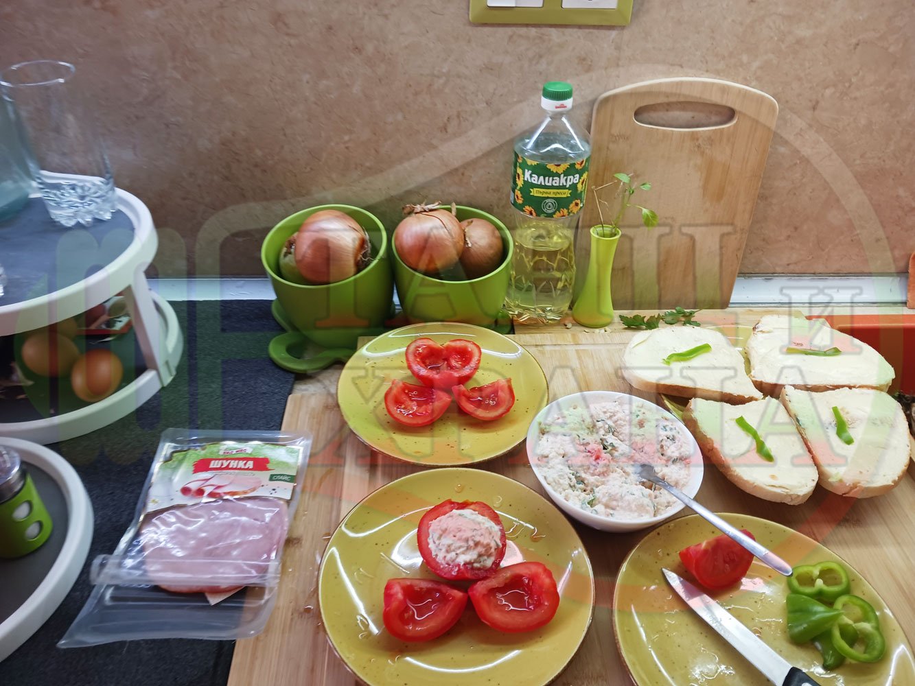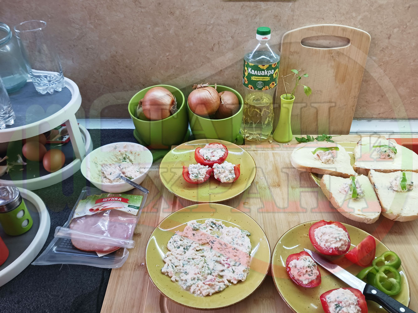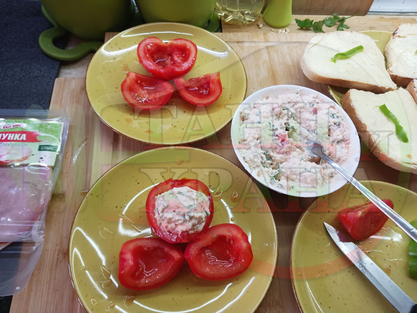Българска сурова салата "Пълненодоматена яйченошункова зеленочушкова с БГсирене" приготвена от домати напълнени със сиренов крем с яйца, зелени чушки, магданоз, чесън и краве бяло сирене гарнирана със шунка с кисело мляко от България - двукомпонентна