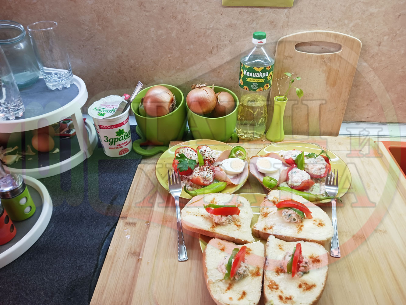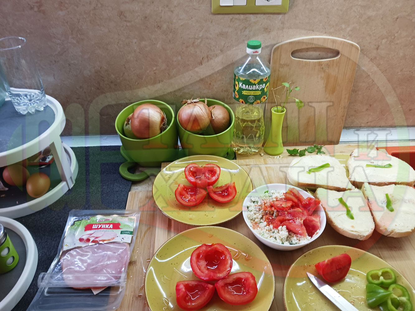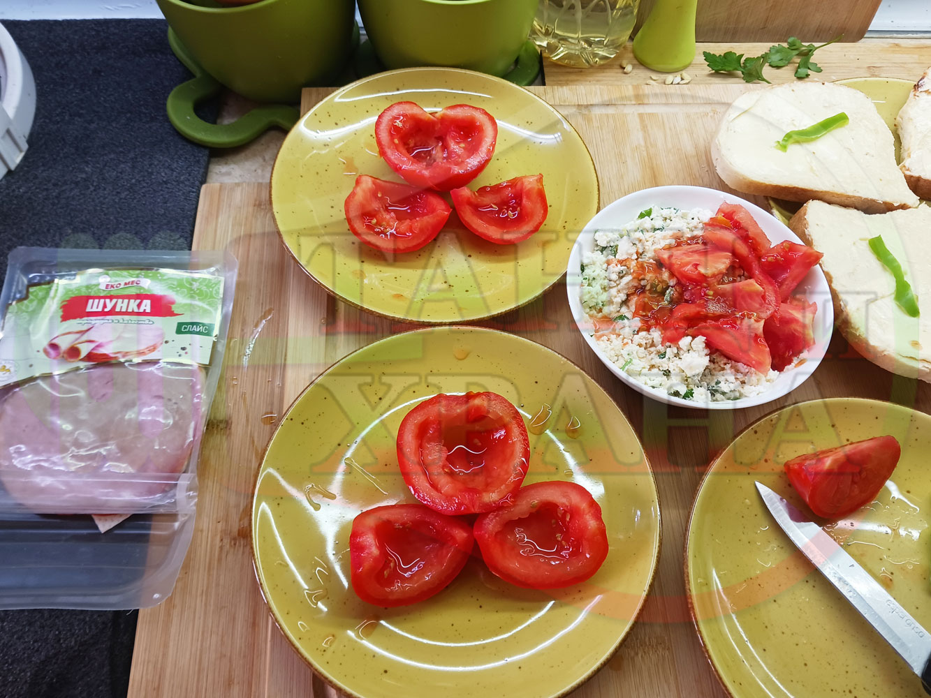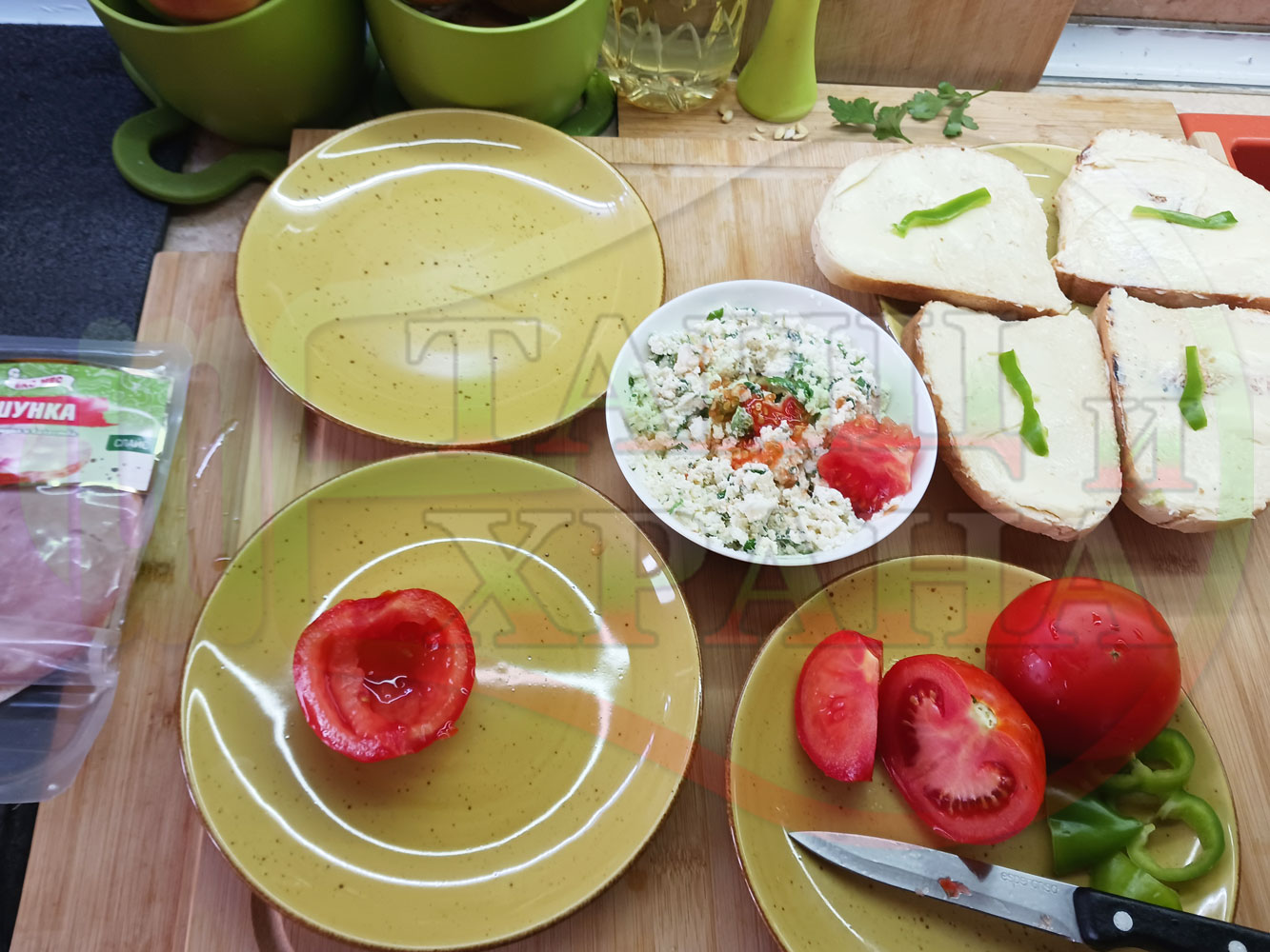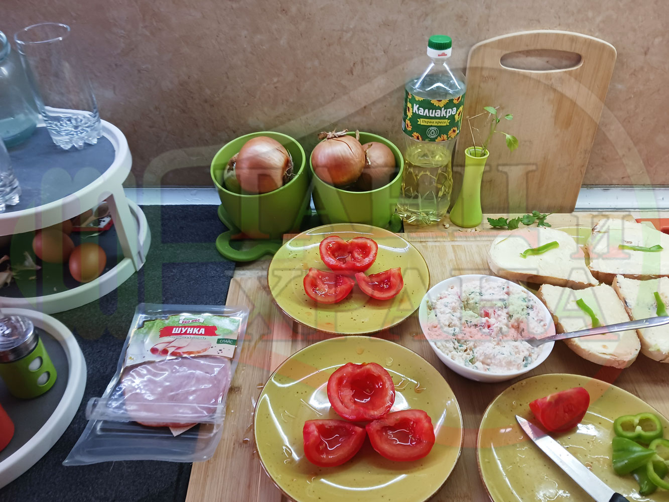 Българска сурова салата "Пълненодоматена яйченошункова зеленочушкова с БГсирене" приготвена от домати напълнени със сиренов крем с яйца, зелени чушки, магданоз, чесън и краве бяло сирене гарнирана със шунка с кисело мляко от България - двукомпонентна
