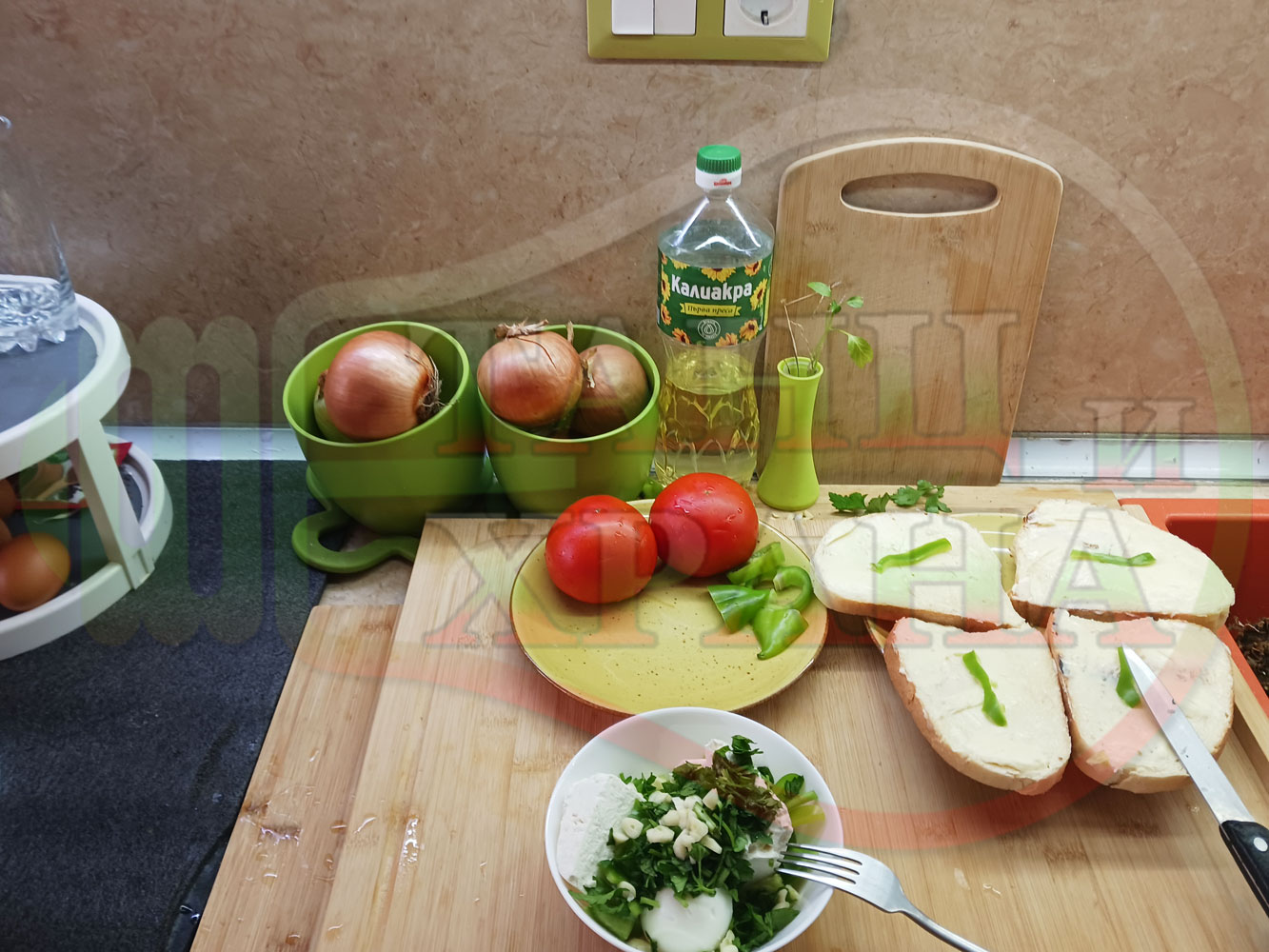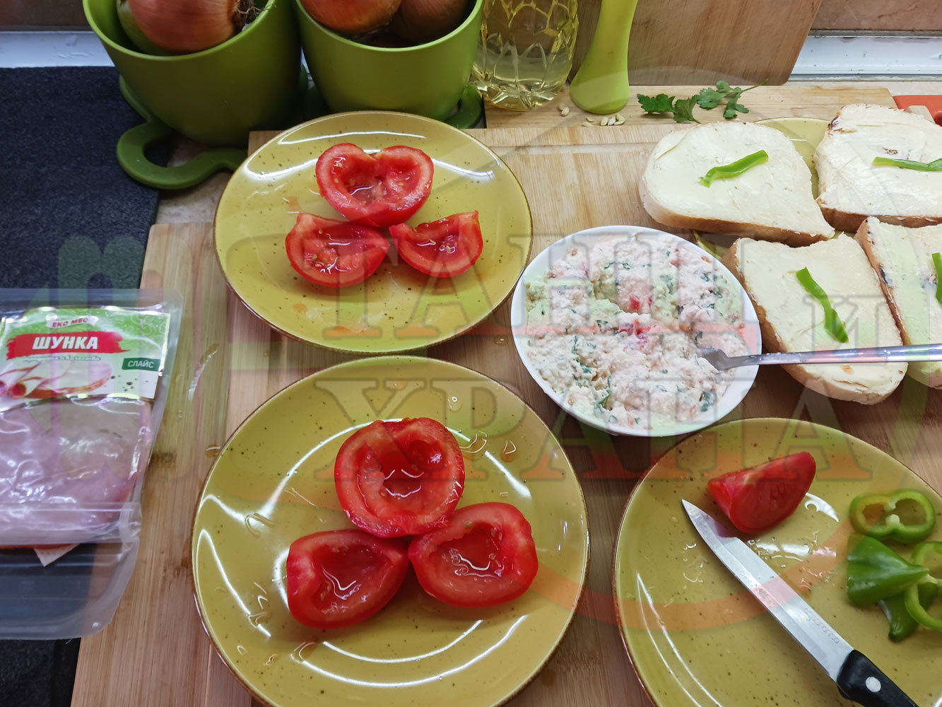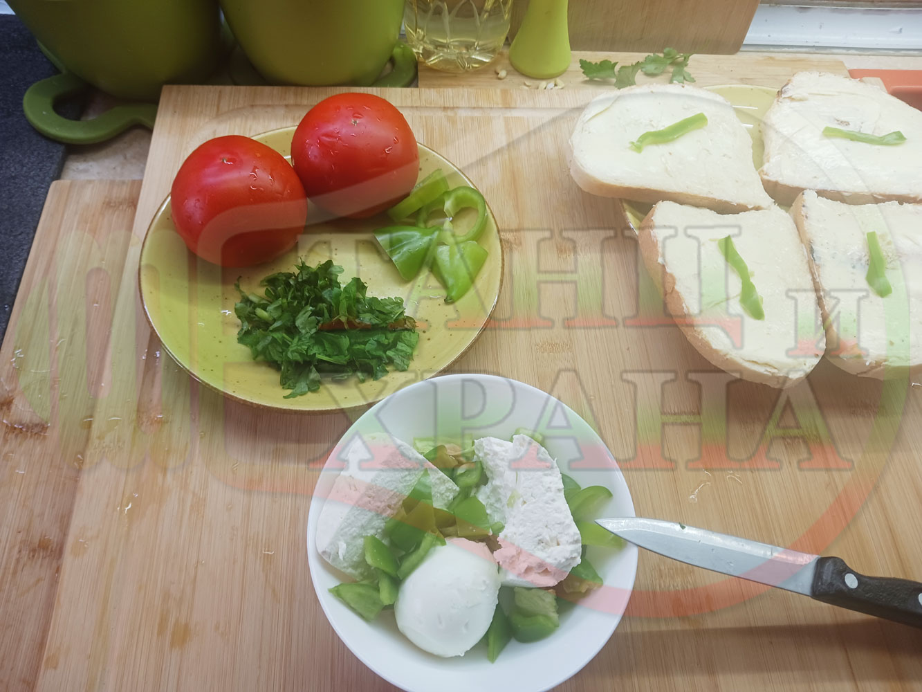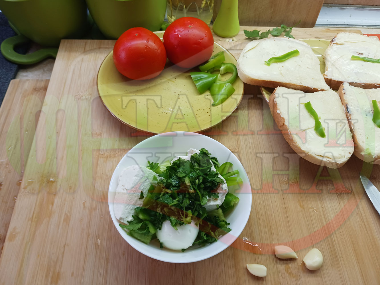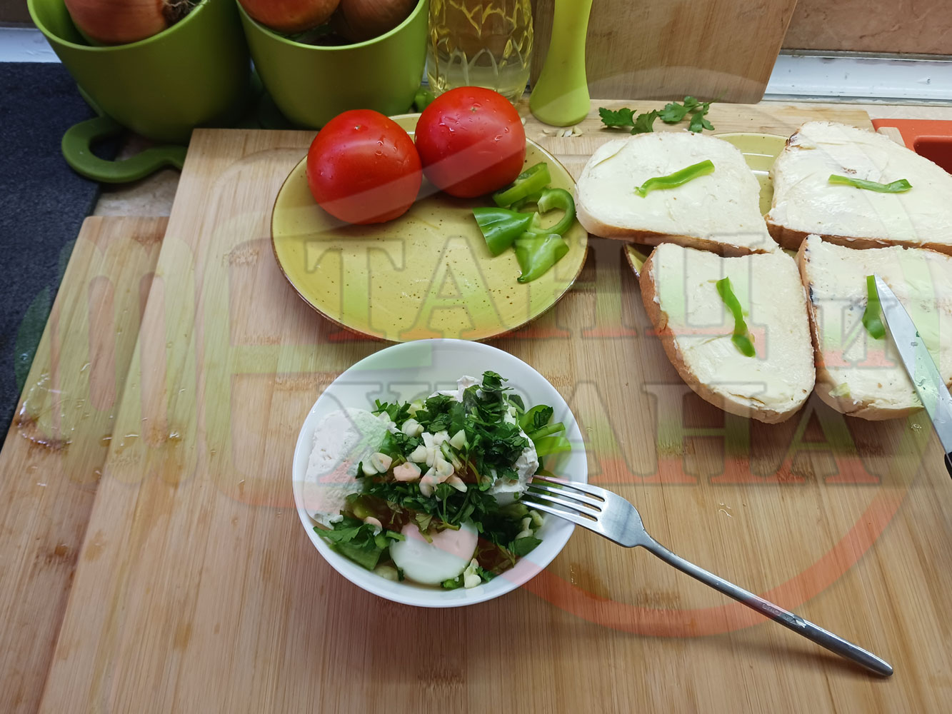 Българска сурова салата "Пълненодоматена яйченошункова зеленочушкова с БГсирене" приготвена от домати напълнени със сиренов крем с яйца, зелени чушки, магданоз, чесън и краве бяло сирене гарнирана със шунка с кисело мляко от България - двукомпонентна