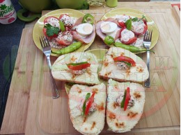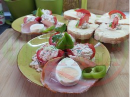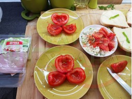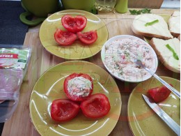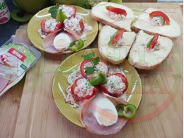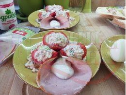 Реших и този път да спретна за закуска полезна българска, сурова салата с пресни пълнени домати. Напълних доматите със сиреново зеленочушков яйчен крем, приготвен със зелени пресни чушки, свеж магданоз, твърдо сварено яйце, стар чесън и българско краве бяло сирене. Добавих към сиреновия крем издълбаната част от доматите и се получи невероятен суров сиренов крем, от който оформих сиренова основа, върху която подредих напълнените домати. Гарнирах с шунката, която навих подобно на "фунии" и ги напълих с по 1 супена лъжица кисело мляко от България и с 1 разпределено за 2-те порции варено яйце. Яйцата обогатяват салатата с така необходимите животински протеини и идеално хармонират с млечни протеини. Мммм... отново се получи голяма вкусно, вкусна, вкусотия (вкуснотия)... с полезната българска бактерия "Лактобацилус Булгарикус" laughing