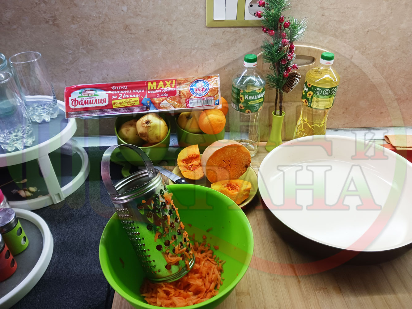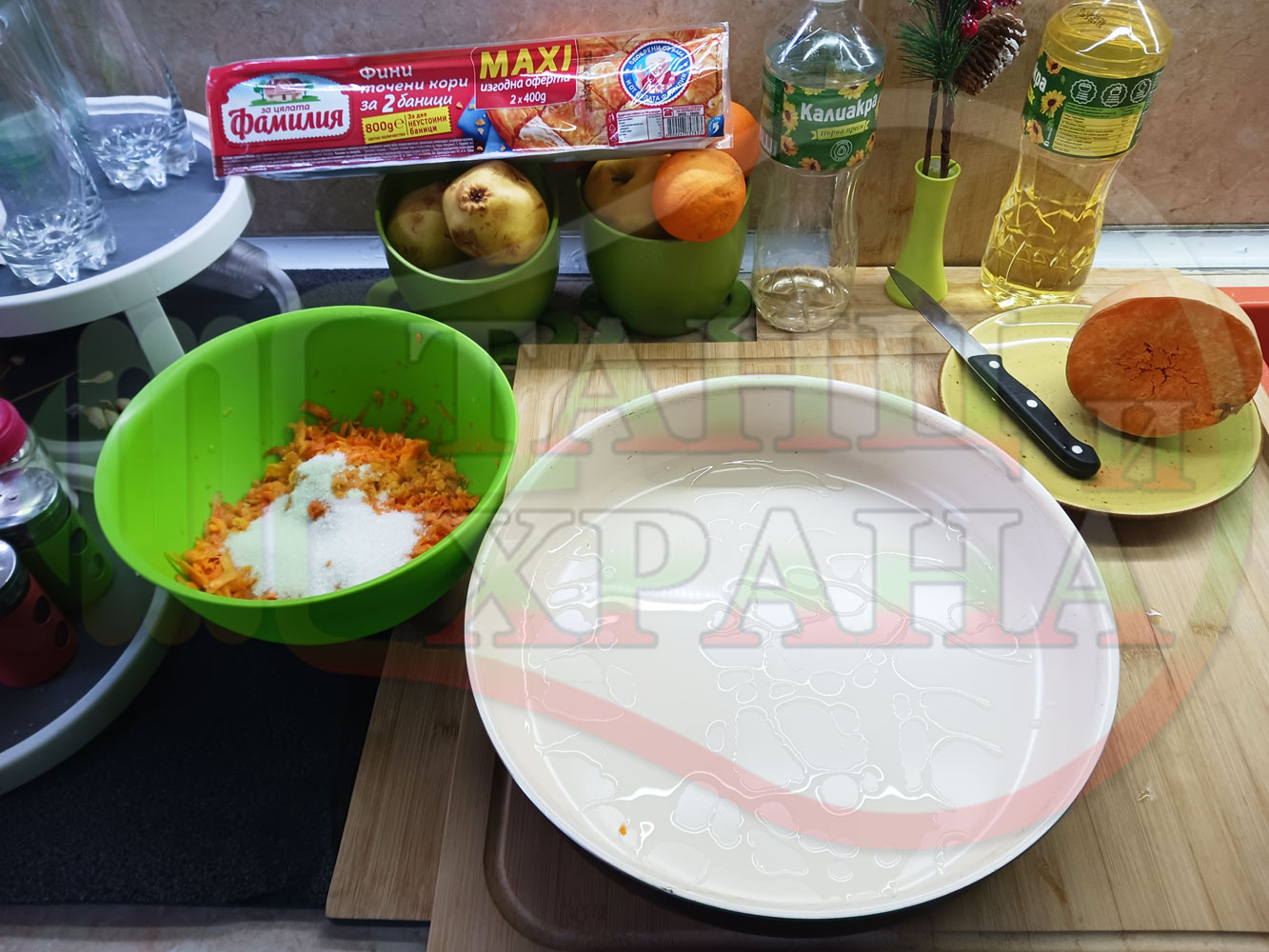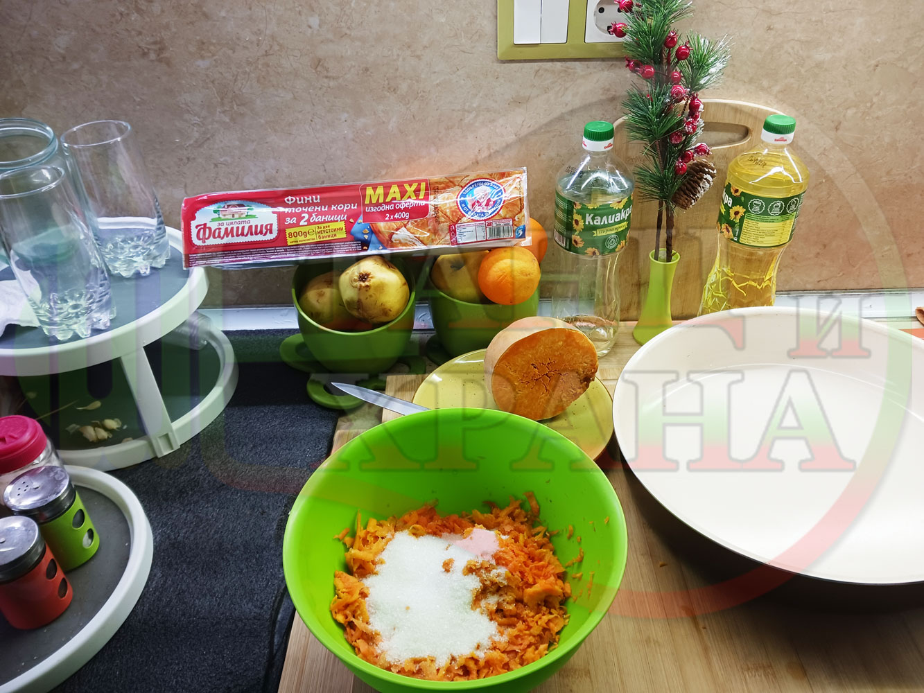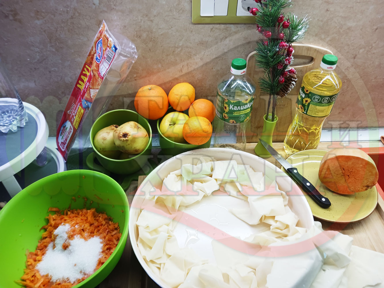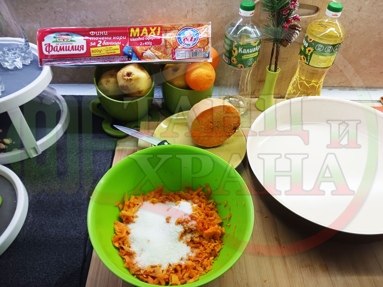ПРОДУКТИ: Приблизителни количества за сладка баница за Бъдни вечер и Коледа 2025 г. "Тиквеноморковена" приготвена от готови кори запечена на фурна с плънка от прясна тиква, моркови, кристална захар и слънчогледово олио подходяща за постещи хора