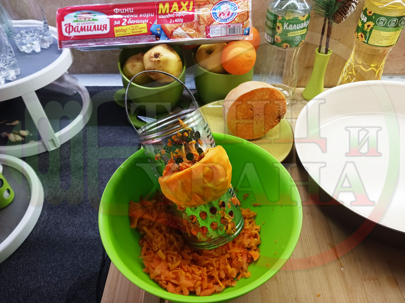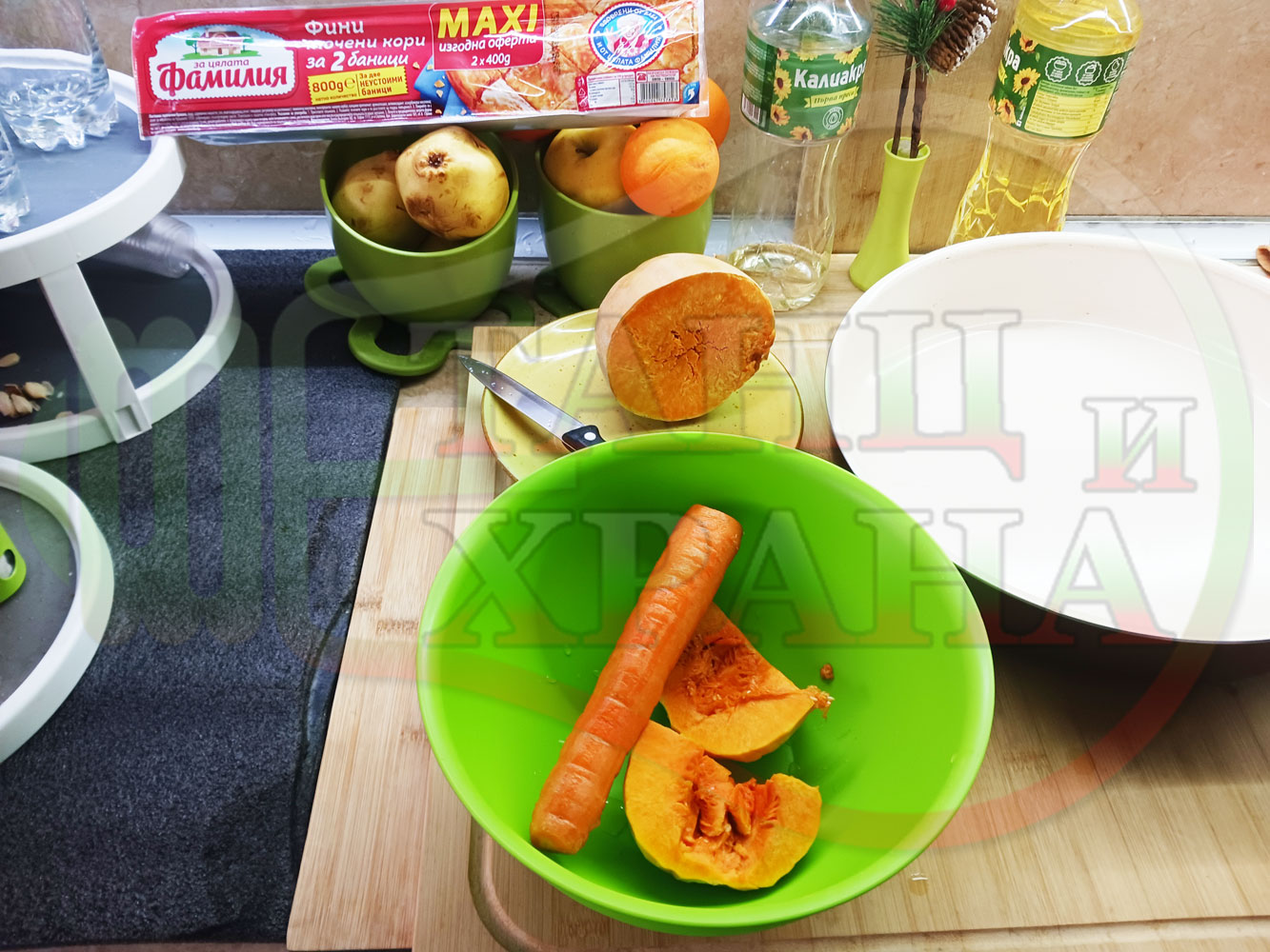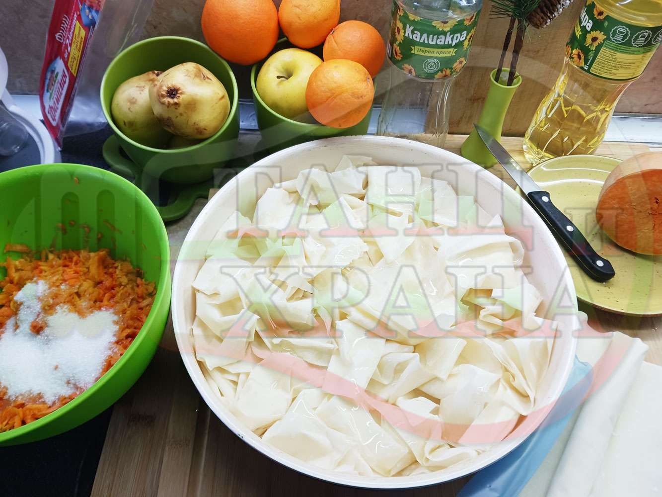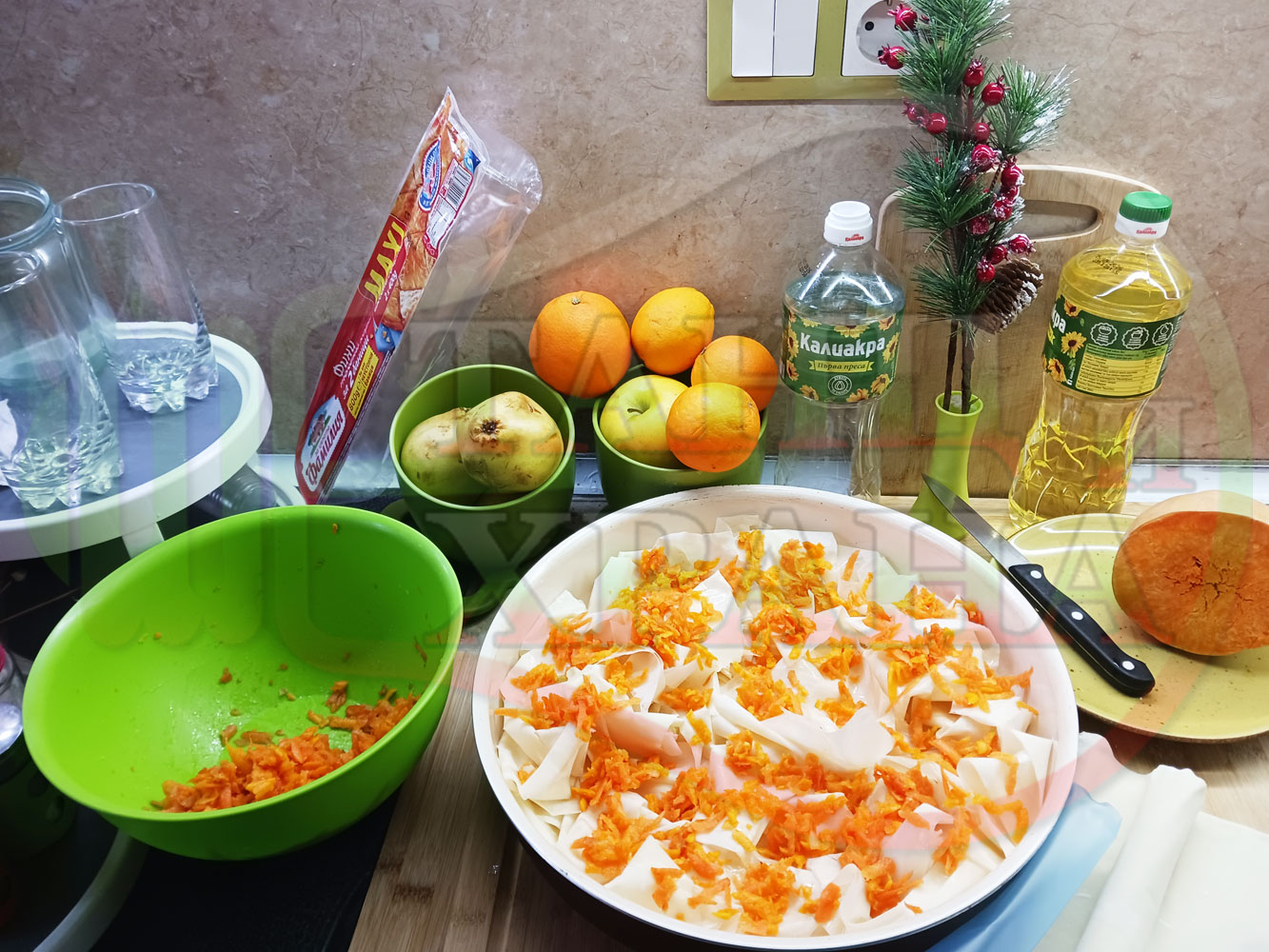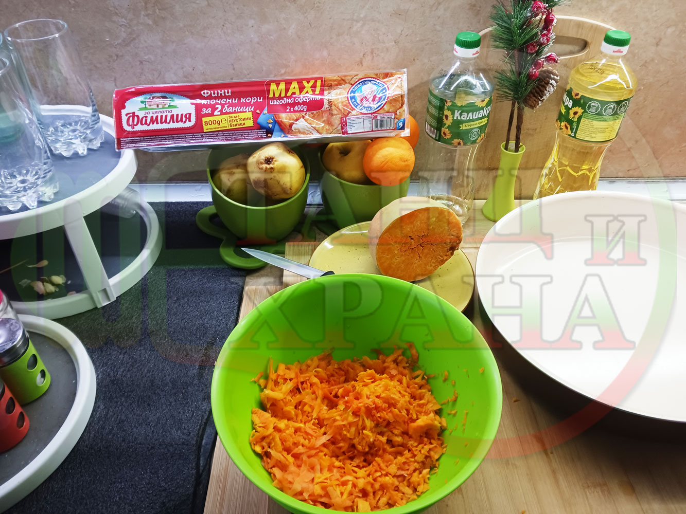 ПРОДУКТИ: Приблизителни количества за сладка баница за Бъдни вечер и Коледа 2025 г. "Тиквеноморковена" приготвена от готови кори запечена на фурна с плънка от прясна тиква, моркови, кристална захар и слънчогледово олио подходяща за постещи хора
