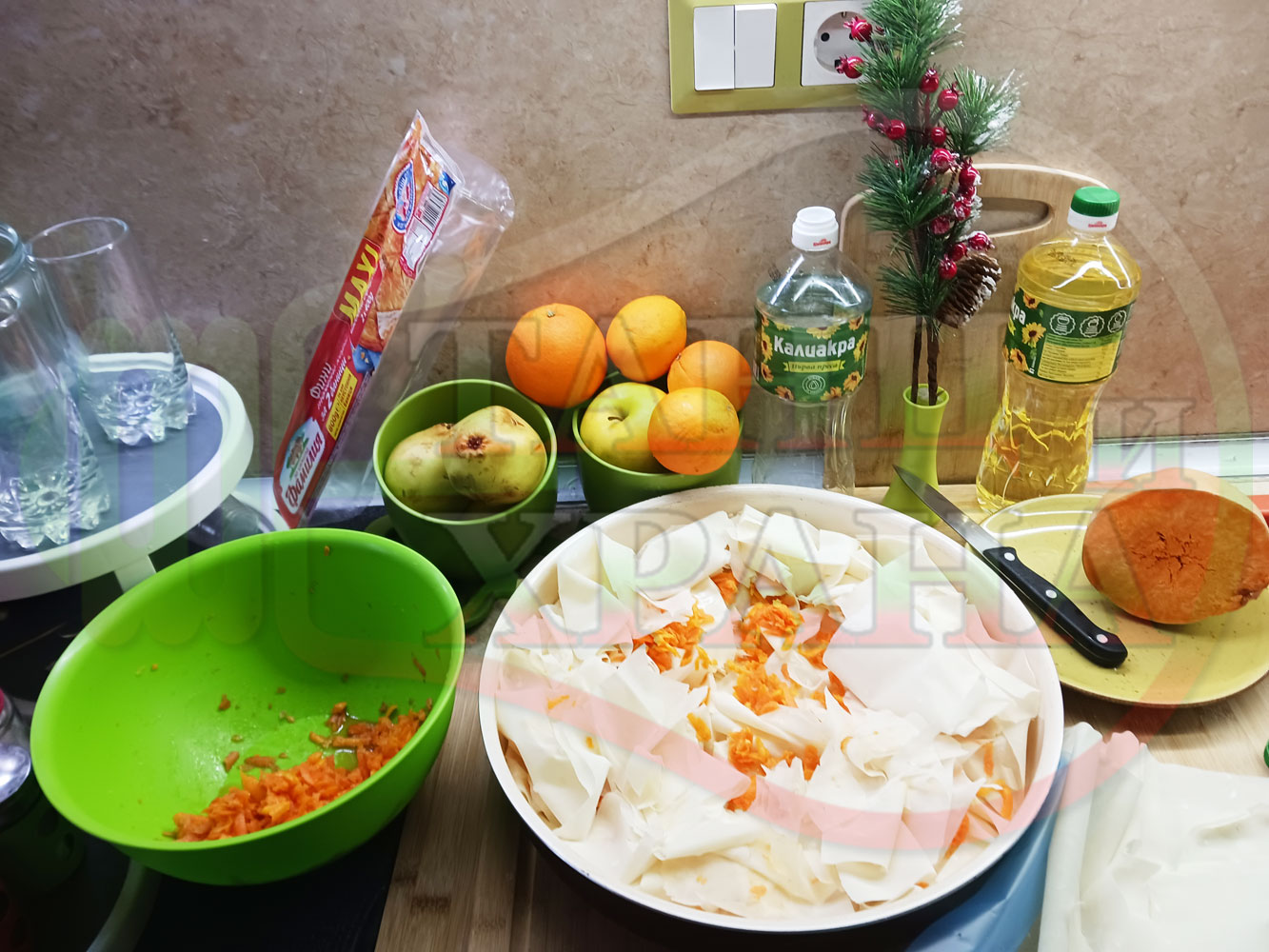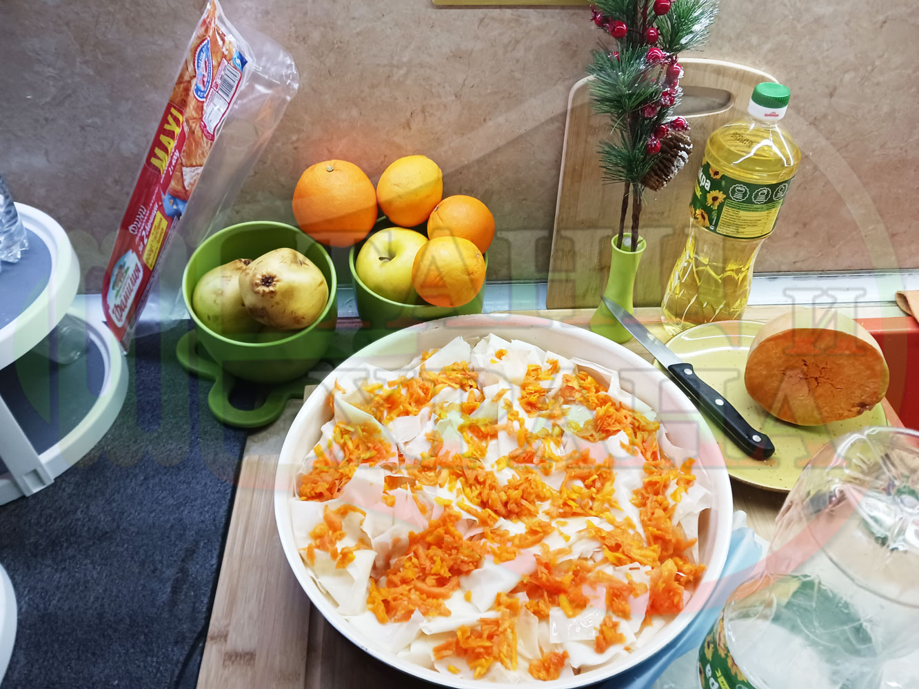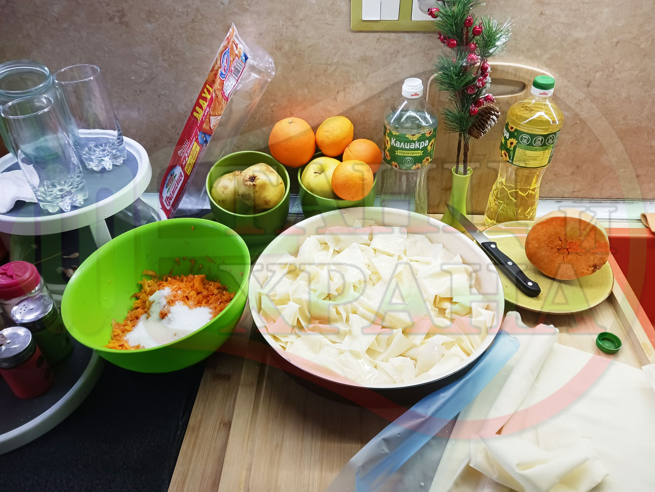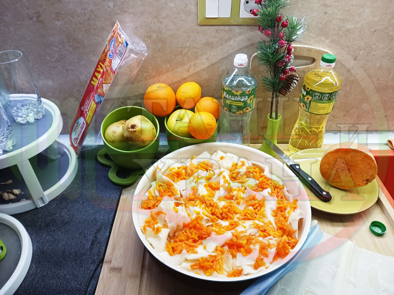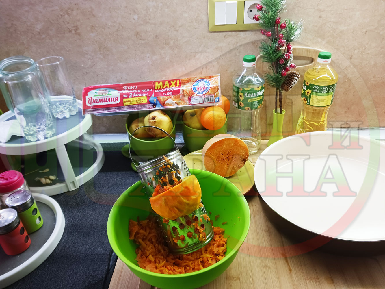 ПРОДУКТИ: Приблизителни количества за сладка баница за Бъдни вечер и Коледа 2025 г. "Тиквеноморковена" приготвена от готови кори запечена на фурна с плънка от прясна тиква, моркови, кристална захар и слънчогледово олио подходяща за постещи хора