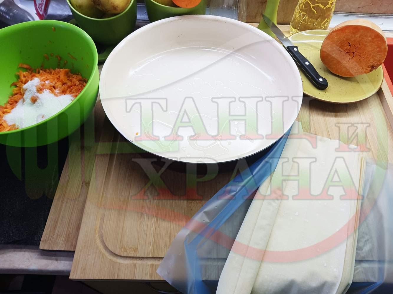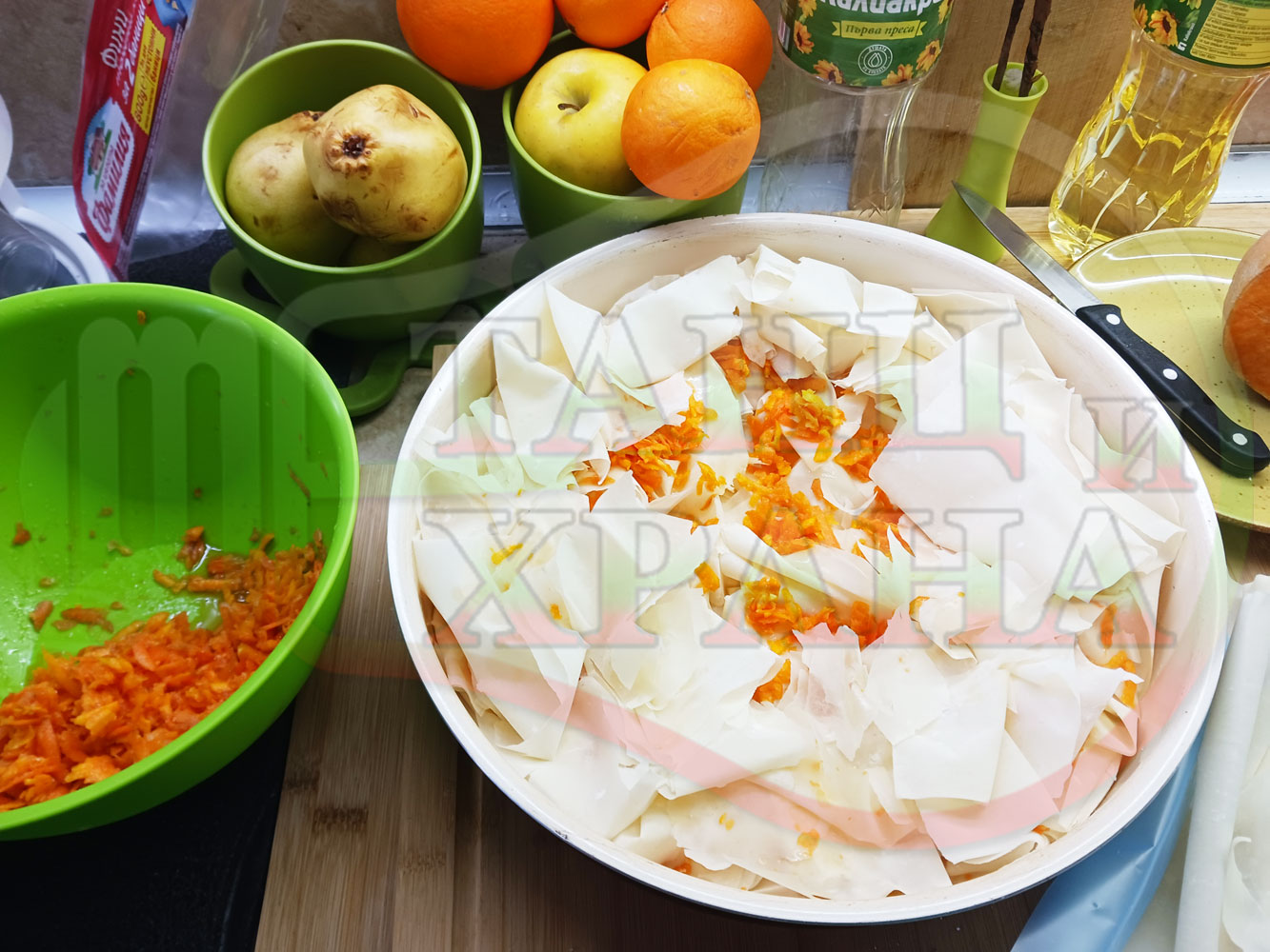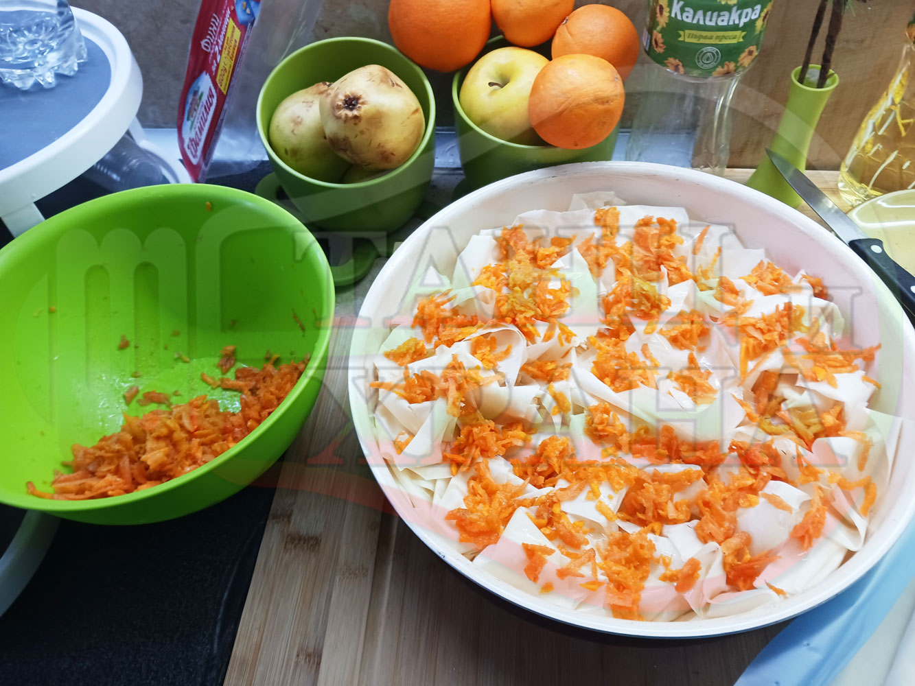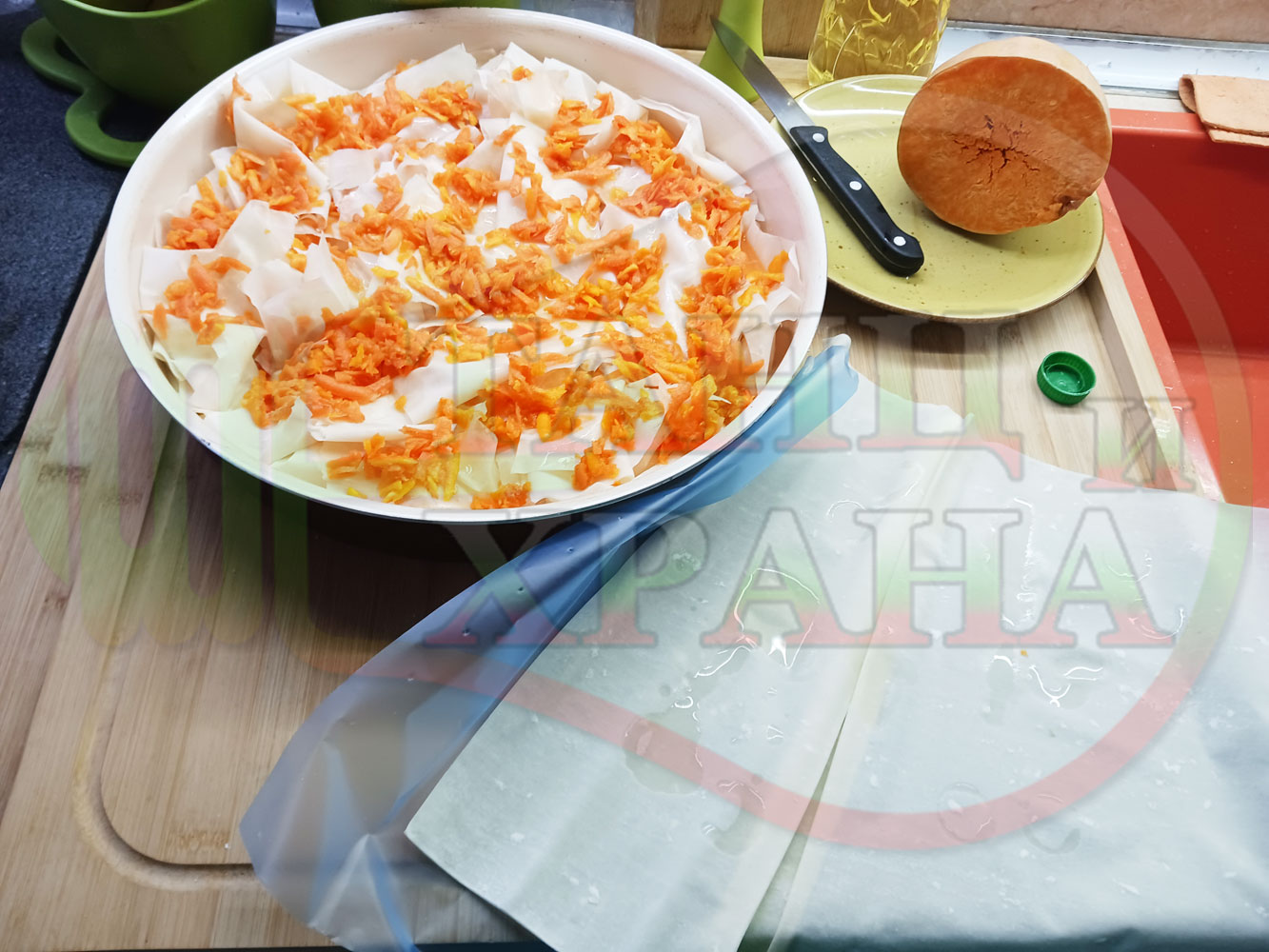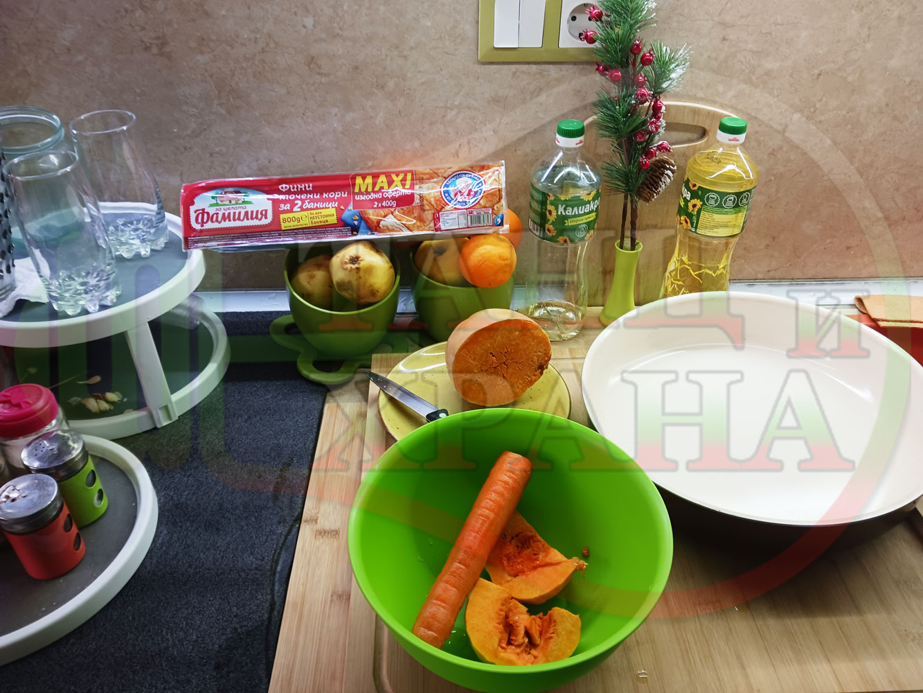 ПРОДУКТИ: Приблизителни количества за сладка баница за Бъдни вечер и Коледа 2025 г. "Тиквеноморковена" приготвена от готови кори запечена на фурна с плънка от прясна тиква, моркови, кристална захар и слънчогледово олио подходяща за постещи хора