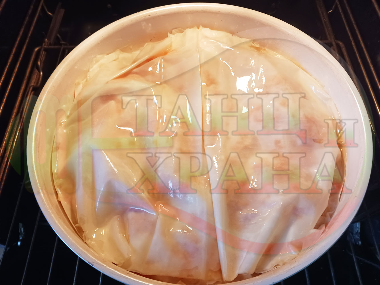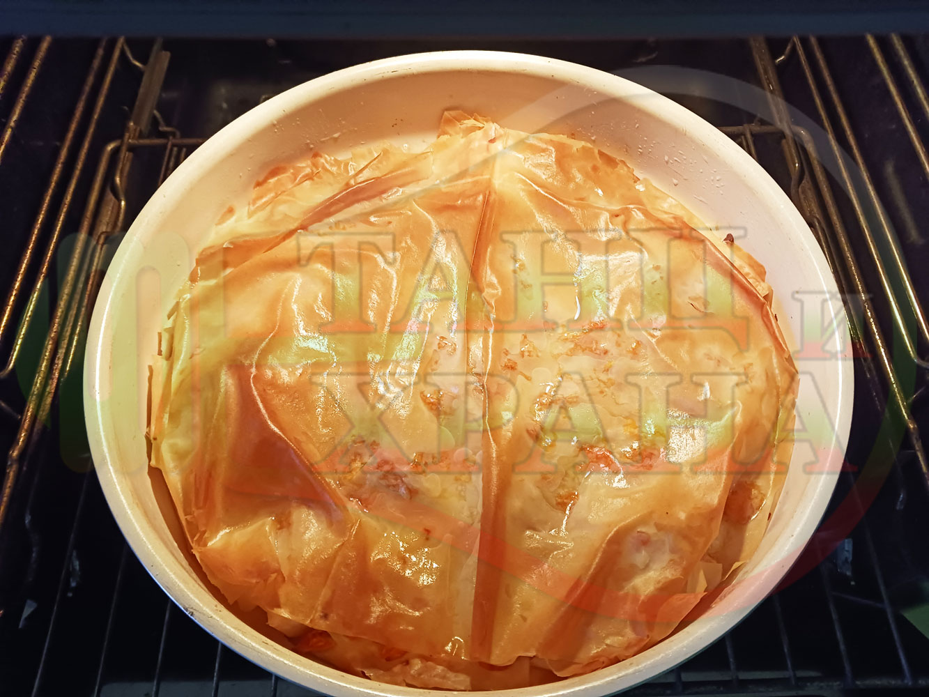 Поставете тавата с баницата на средната скара и по-далече от горния реотан, за по-добро и равномерно изпичане (или я изпечете под друг вид ястие, в случай че приготвяте няколко ястия наведнъж).