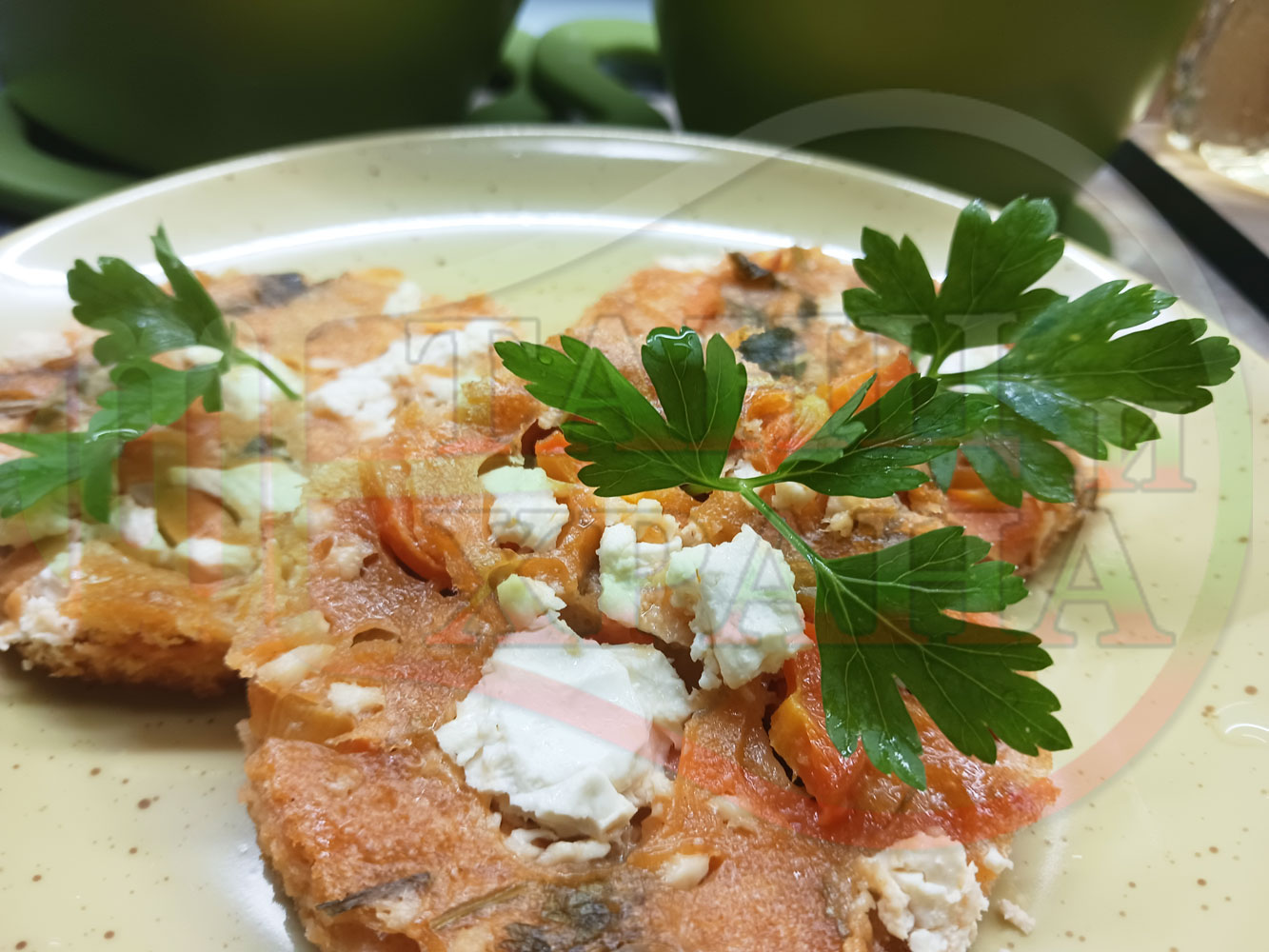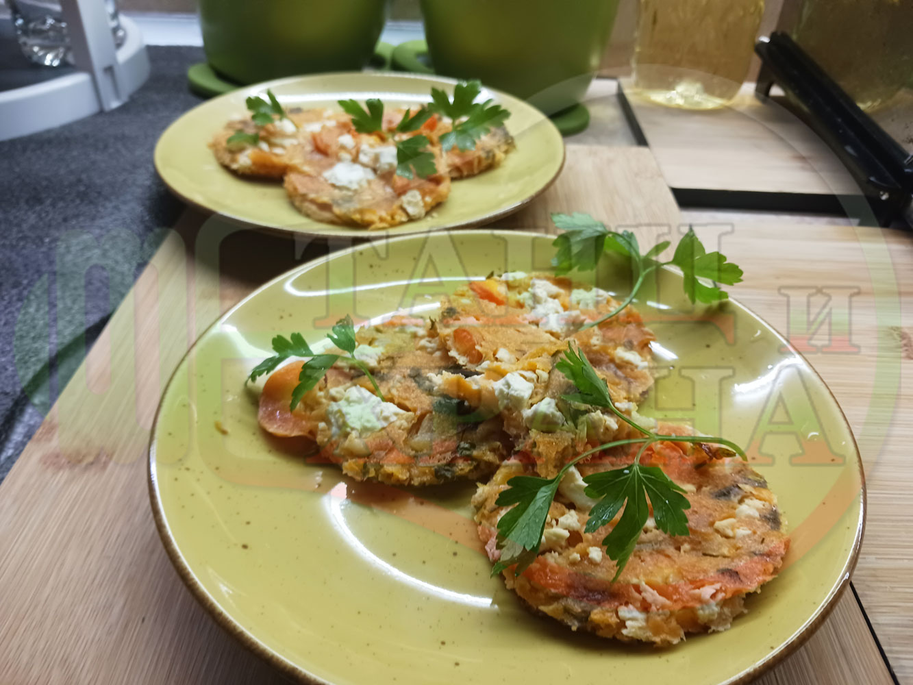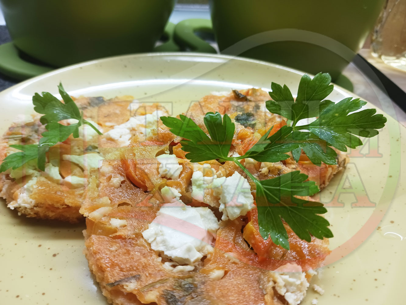 Бухтени палачинки "Морковени с БГсирене" запечени на фурна с краве бяло сирене (българско, саламурено), пресни моркови, червен сладък пипер, краве масло и свеж магданоз омесени с яйца и едросмляна лютеница