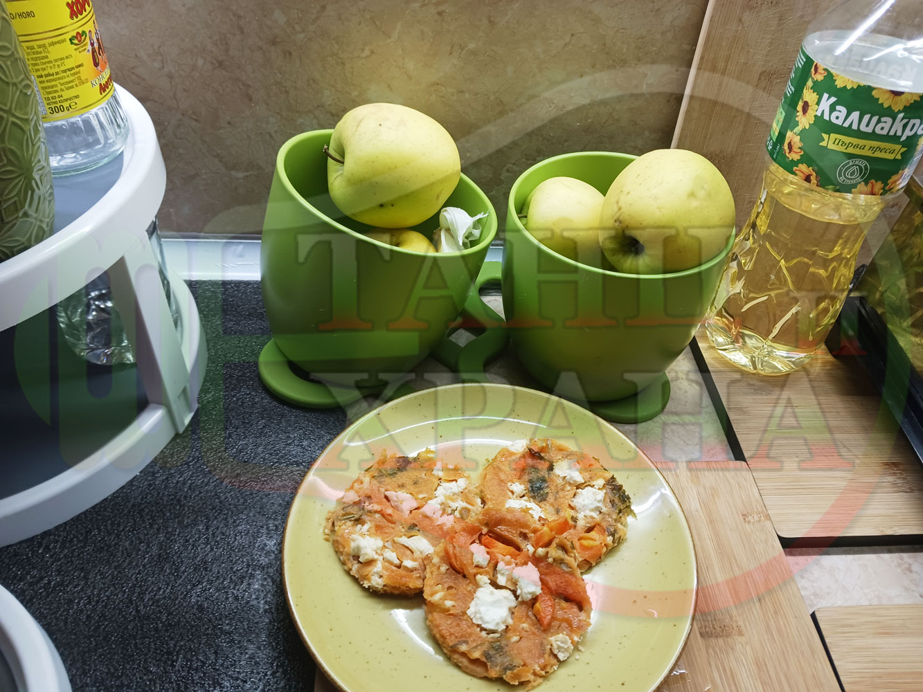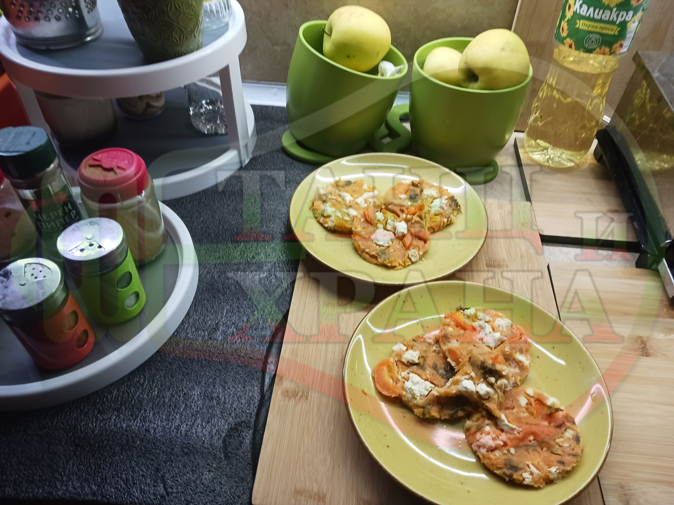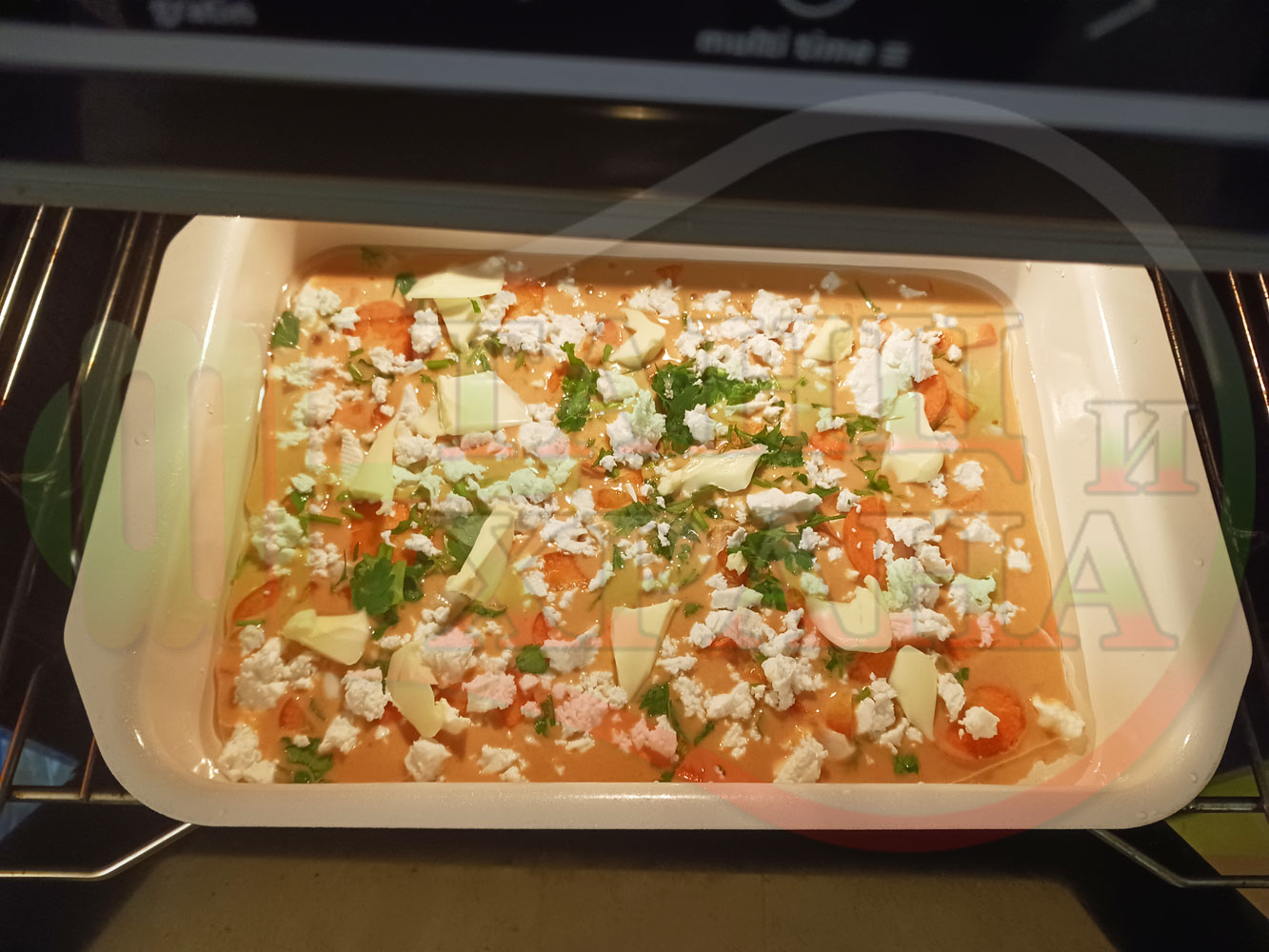 Бухтени палачинки "Морковени с БГсирене" запечени на фурна с краве бяло сирене (българско, саламурено), пресни моркови, червен сладък пипер, краве масло и свеж магданоз омесени с яйца и едросмляна лютеница