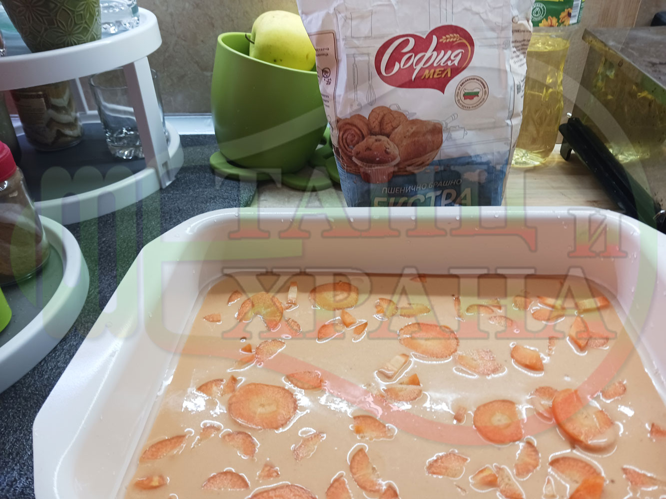Изсипете бухтеното тесто в намазана с олио тава за печене и подредете измития и нарязан на кръгчета морков. Надробете кравето бяло сирене върху моркова, поръсете с червения сладък пипер и измития и нарязан на едро магданоз и добавете кравето масло, нарязано на тънки парченца. Поставете тавата в предварително загрятата фурна (загрейте я за поне 5 минути). Запечете на фурна без вентилатор на 180 градуса за около 50 минути.