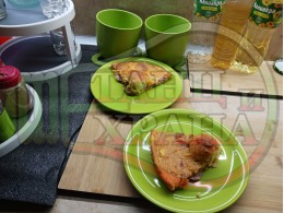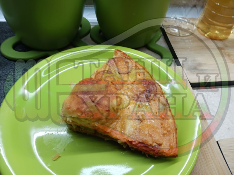 Питки от брашно в бухтена пита с наденица, лютеница, краве бяло сирене, млечен кашкавал и яйца
