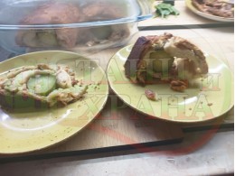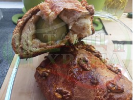 Козуначено руло "Краставично с орехи" приготвено с плънка от цяла краставица и орехи омесено с прясно мляко и яйца гарнирано със сурови орехи