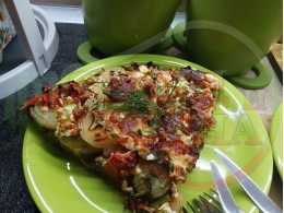 Плоска солена торта "Луканкова с краставици и сирене" гарнирана с лютеница, луканка, краве бяло сирене, домати, кромид лук, копър и кашкавал омесена с яйца