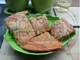 Солен кекс "Тиквеносемков с лютеница" приготвен и изпечен на фурна с плънка от печени тиквени семки омесен с прясно краве мляко и яйца за закуска