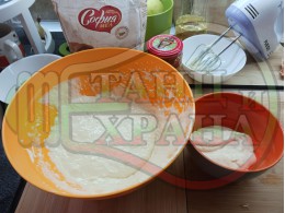 Разбийте яйцата в купа с вилица или миксер. Добавете захарта, солта, олиото и прясното мляко и разбийте. Сипете брашното и бакпулвера и разбийте до получаване на средно гъста смес за кексово тесто. От така получената смес отделете около 150 гр..