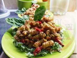 Български вити макарони "Червеночушкови киселомлечни с БГсирене" приготвени на фурна с краве бяло сирене (българско, саламурено) гарнирани в кладенче с червени пресни чушки, магданоз и зелен лук напълнено с кисело мляко от България - двукомпонентни