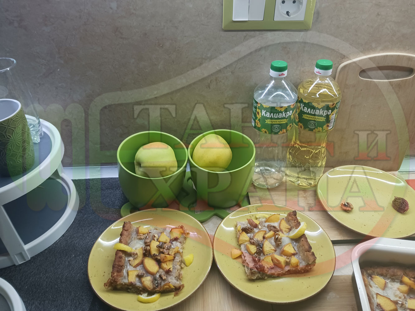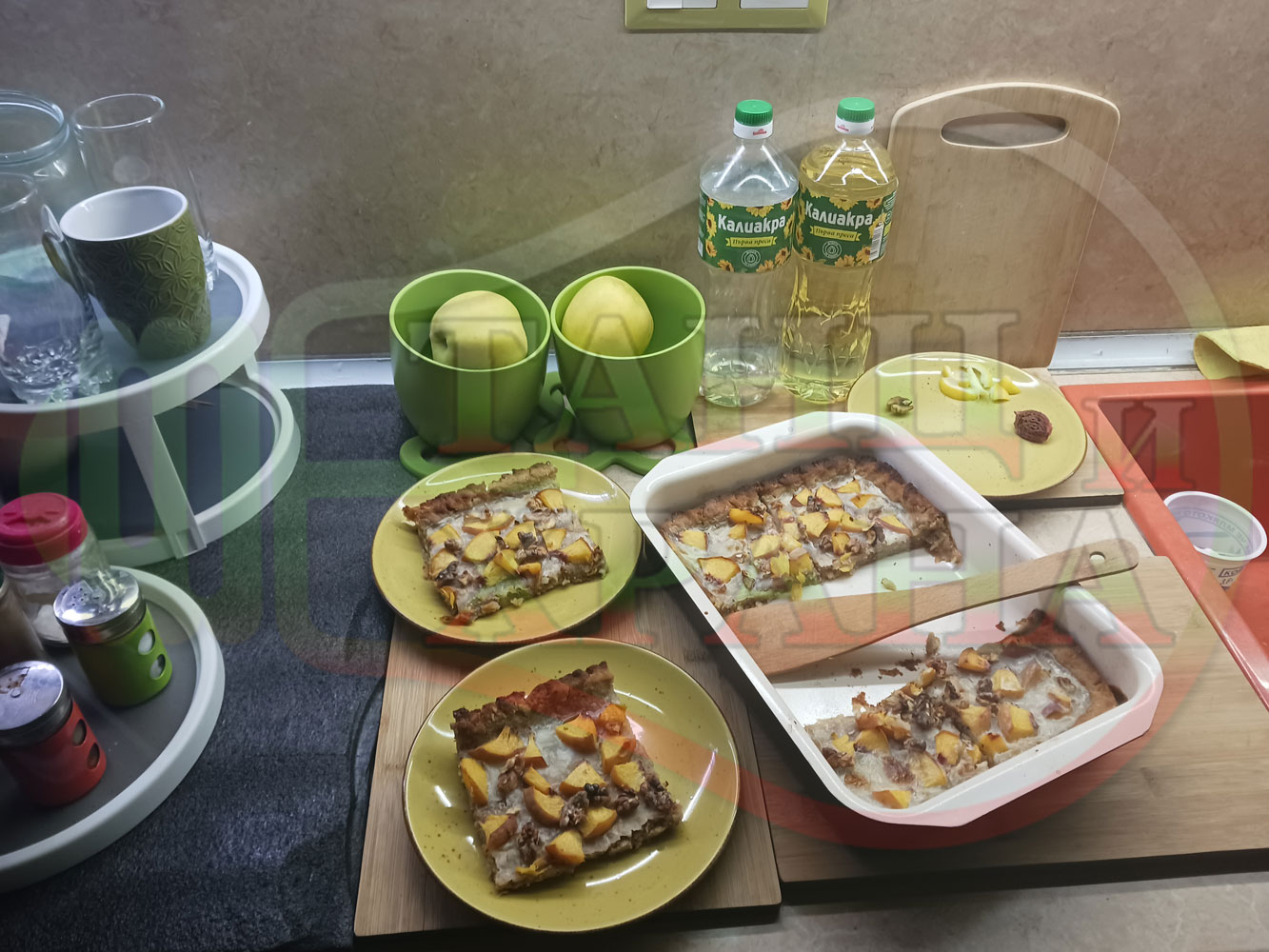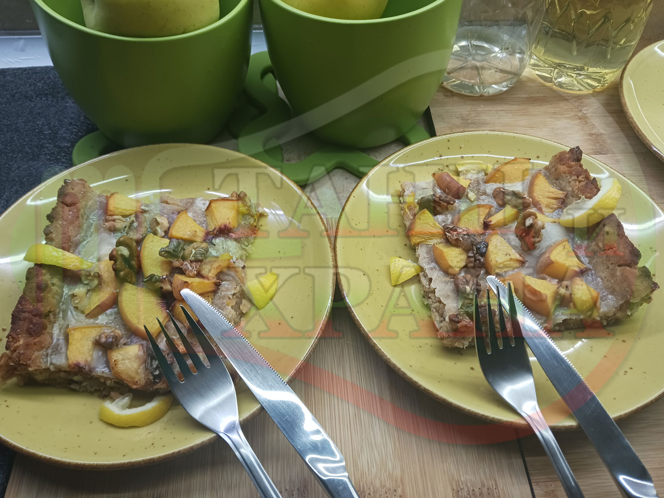 Хлебна плодова пита "Прасковорехи" омесена от хляб с билков чай от липа, прясно мляко и лимонова кора изпечена на фурна с плънка от ванилово нишесте с пресни праскови и сурови орехи