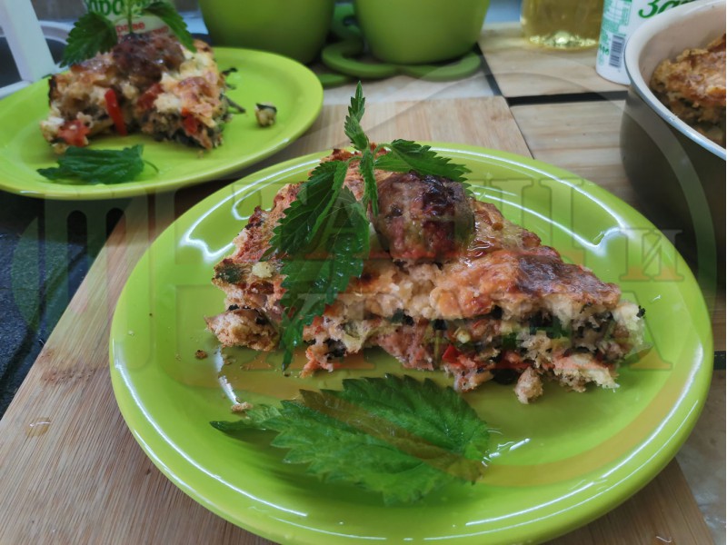 Многопластова хлебна баница с кайма "Каймяни кюфтенца с коприва" запечена на фурна със свежа коприва, домати, кромид лук, стар чесън, червен сладък пипер и яйчено млечна заливка с кисело мляко от България