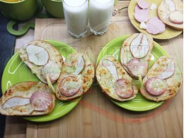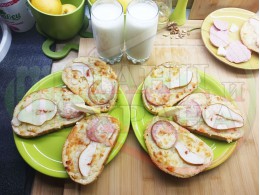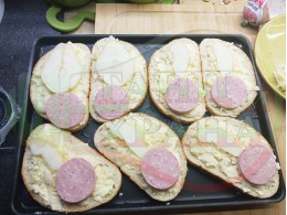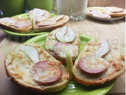 Български филийки "Кашкаваленокрушови камчиевосаламени" запечени на фурна с краве масло, пикантен чеснов салам и плънка от кашкавалено крушов крем с млечен кашкавал и пресни круши