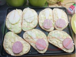 Ммммм..., в кухнята се носи аромат на запечени на фурна български филийки с масло, пикантен чеснов салам и плънка от кашкавалено крушов крем, приготвен с млечен кашкавал и пресни круши. Филийките се получиха доста вкусни, хрупкави с ронлива коричка и топящи се в устата при хапване, носещи полезността от млечните протеини на кашкавала и кравето масло в идеална комбинация с плодовия, нежен сок от крушата, дообогатен с леко пикантната чеснова нотка от любимия ни от детството салам. Отново спретнах невъобразима вкусно, вкусна, вкусотия (вкуснотия). ![]()
