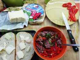 Спретнах превъзходни, хрупкави филийки, запечени на фурна с яйчено саздърмова плънка, приготвена с яйца, деликатесна саздърма, червени пресни чушки, магданоз и чесън. Ммммм... в кухнята се носи аромат на запечено краве масло и леко карамелизирани червени пиперки в идеална хармония със соковете на саздърмата. Отново се получи невероятна вкусно, вкусна, вкусотия (вкуснотия). ![]()