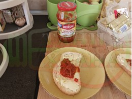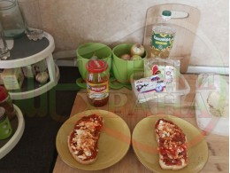 ПРОДУКТИ: Приблизителни количества за препечени на тостер филии, намазани с масло, лютеница и краве сирене