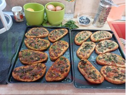 Вкусни и хрупкави филийки, изпечени на фурна с плънка от яйца, свежа коприва, млечен кашкавал и топено сирене.