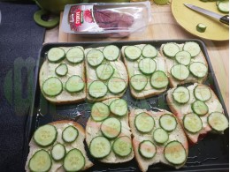 Запекох филийките на фурна без да приготвям яйчена или яйчено млечна плънка с яйца и с прясно или българско кисело мляко. Спретнах вкусни филийки с три основни продукта и в кухнята се носи аромат на запечени краставици с манастирски суджук и млечен кашкавал. Кашкавалът се разтича и се разтяга "на конци" с лека, едва доловима хрупкавост на места.