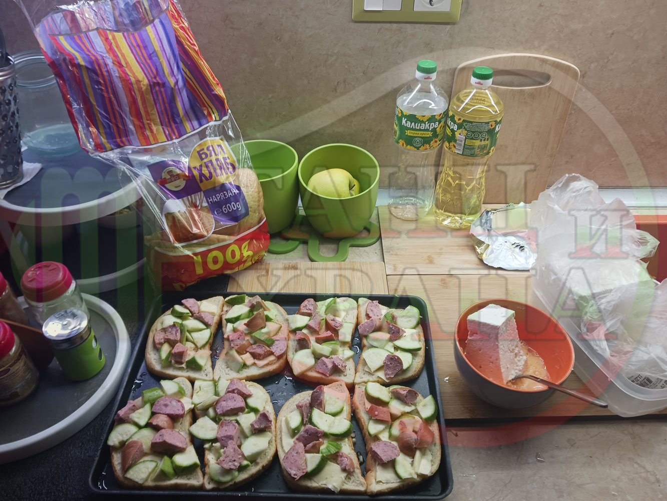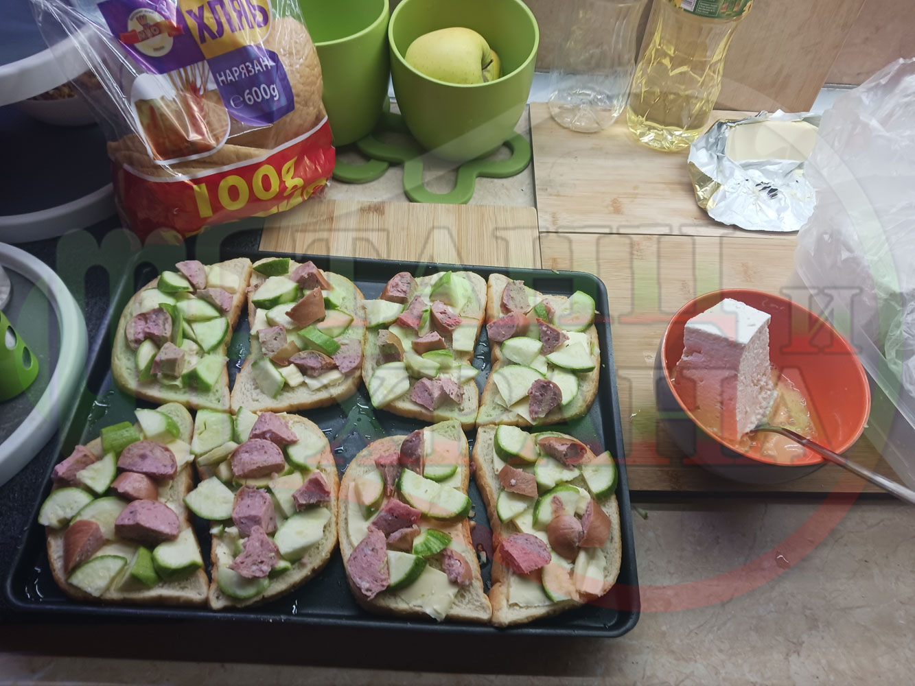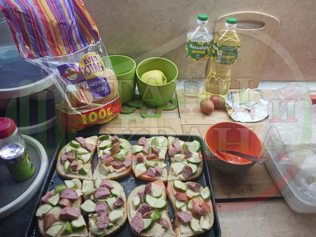 Сипете слънчогледовото олио в тава за печене и го размажете равномерно с четка или чрез накланяне на тавата във всички посоки. Подредете филийките хляб и поставете по няколко тънки резенчета краве масло върху всяка филийка. Измийте тиквичката и наденицата и обелете наденицата от тънката обвивка. Нарежете тиквичката и наденицата на средни по големина парченца и ги подредете върху всяка филийка (маслото може да не го размазвате равномерно).