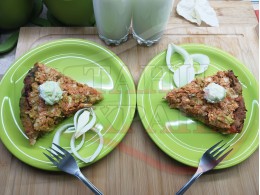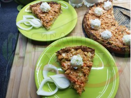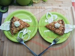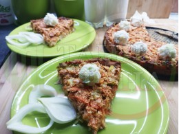 Отрежете по едно парче от тортата и го поставете в центъра на чиниите. Украсете порциите с лучената сърцевина от кромид лука и със зелевите пресни листа (оформете и украсете порциите по ваше желание и усмотрение).