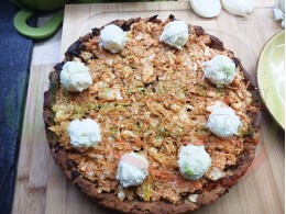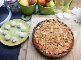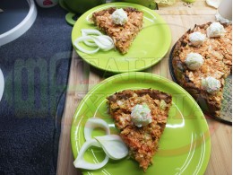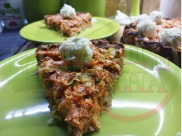Българска хлебна торта "Зелева филежарена" омесена от хляб с прясно зеле, кромид лук, зелени пресни чушки, жарено филе и кисело мляко от България сурово гарнирана със сиреново зелев крем с червен сладък пипер и краве бяло сирене - двукомпонентна
