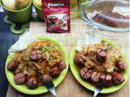 Българска зелева яхния "Пряснозелева родопсконаденицова лютенична" сварена и запечена на фурна с родопска наденица, пресен зелен лук, свеж магданоз и едросмляна лютеница