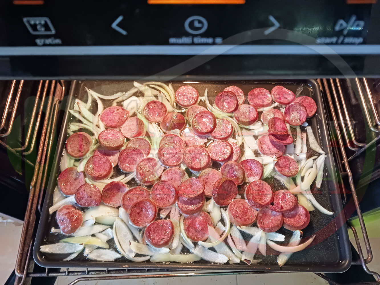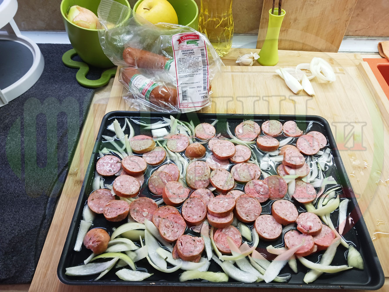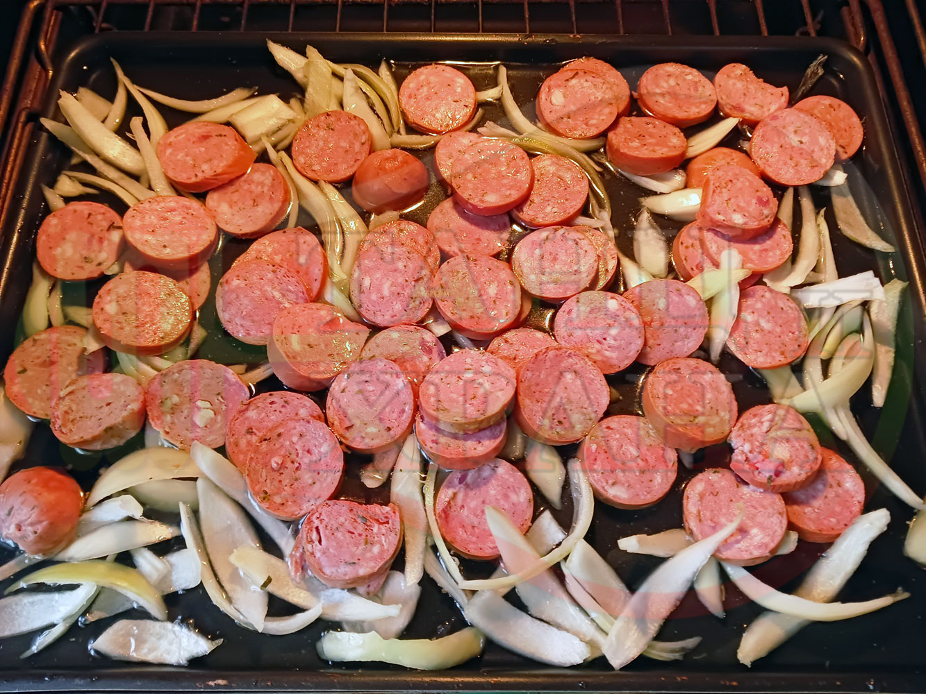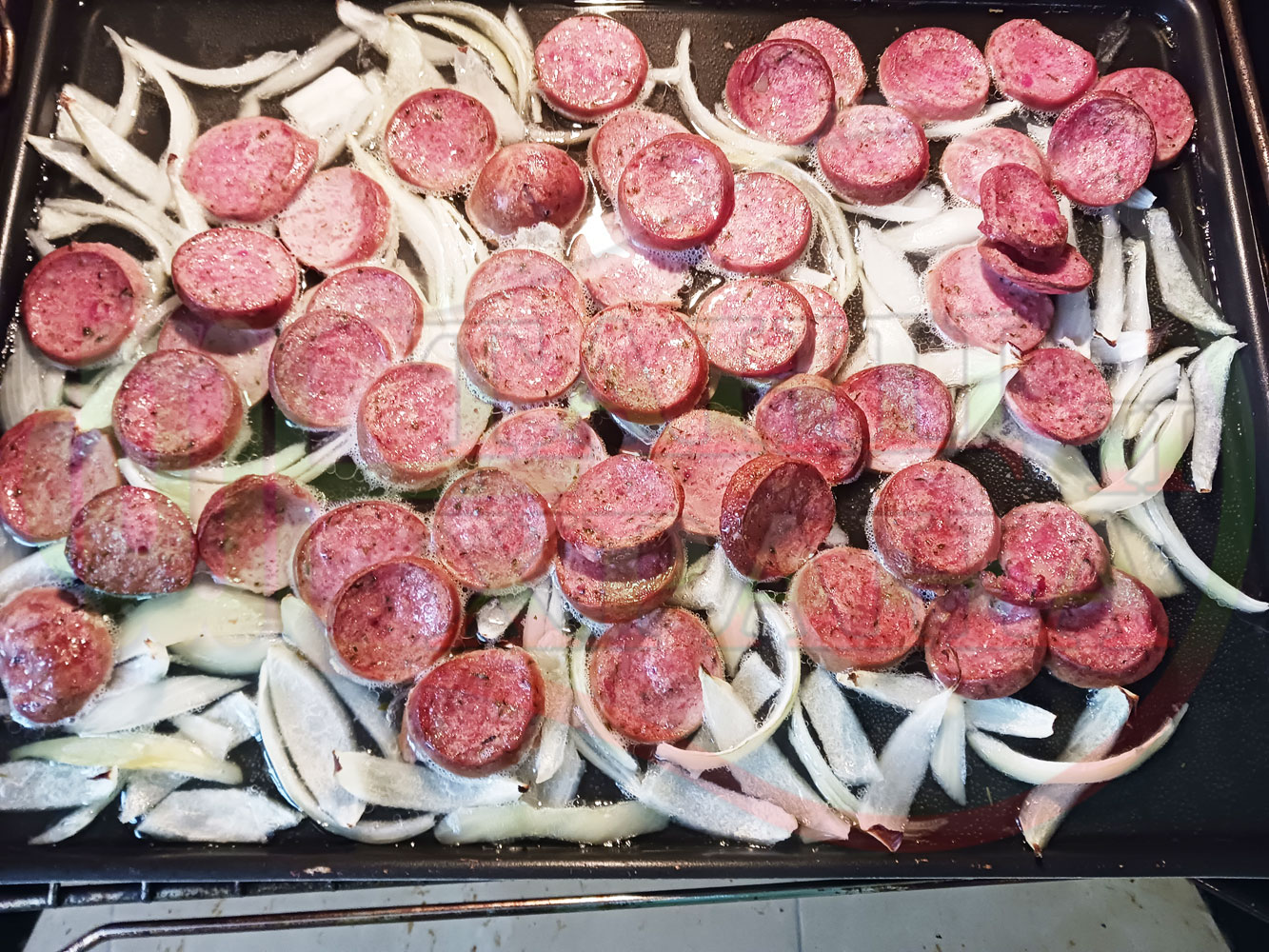 ВНИМАНИЕ: Фурните са различни и съответно времето за сваряване и запичане е ориентировъчно. Наблюдавайте процеса на запичане и при необходимост, покрийте с хартия или фолио за печене. Разбърквайте лука и обръщайте често наденицата за да се изпече равномерно.