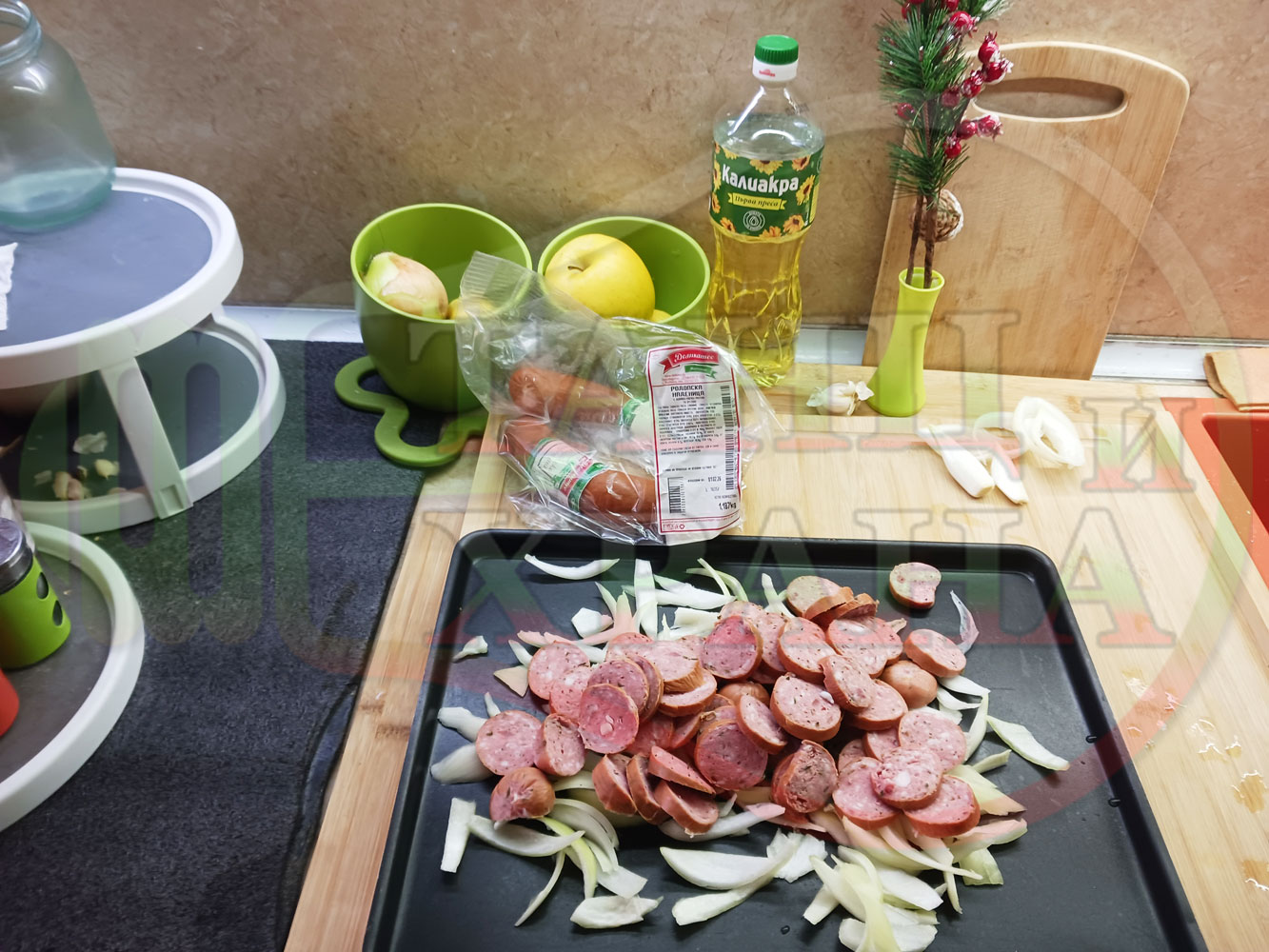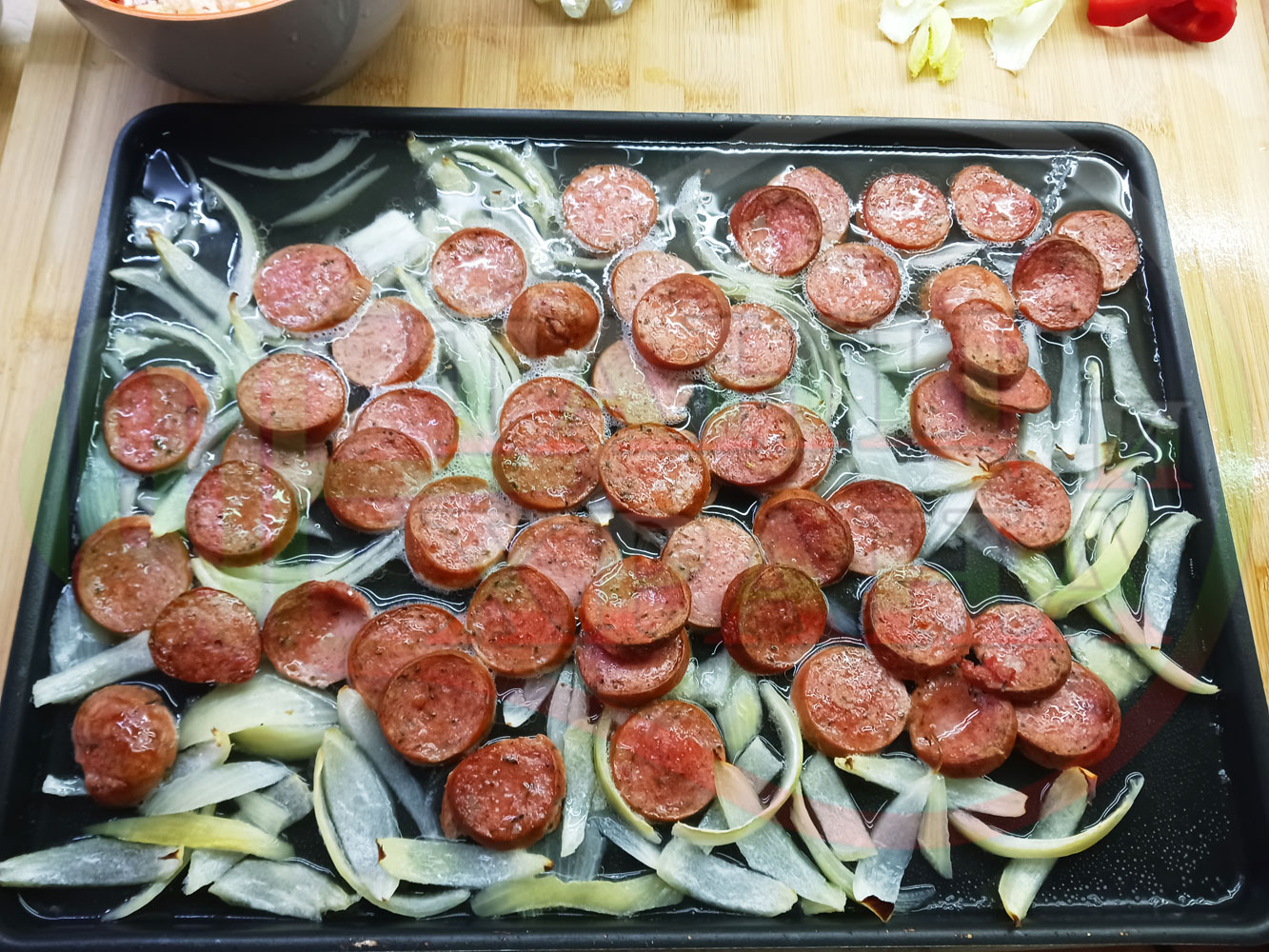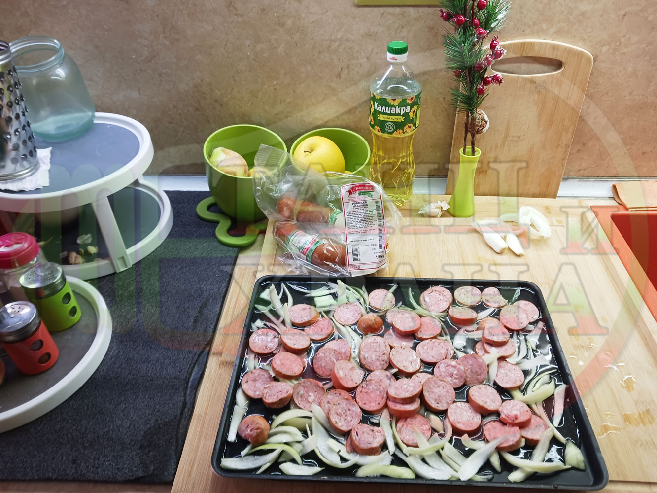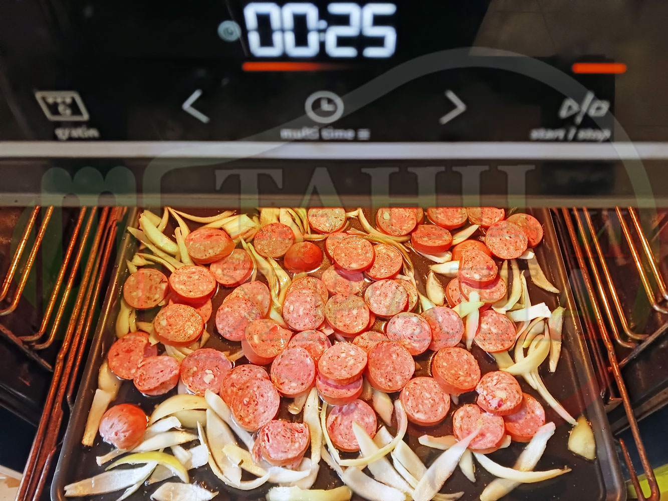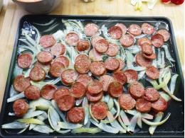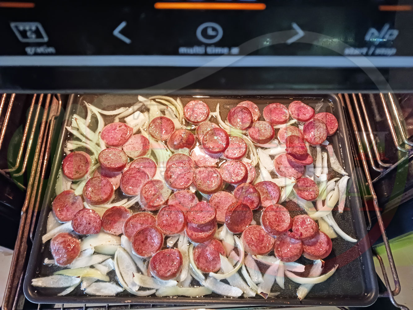 ВНИМАНИЕ: Фурните са различни и съответно времето за сваряване и запичане е ориентировъчно. Наблюдавайте процеса на запичане и при необходимост, покрийте с хартия или фолио за печене. Разбърквайте лука и обръщайте често наденицата за да се изпече равномерно.