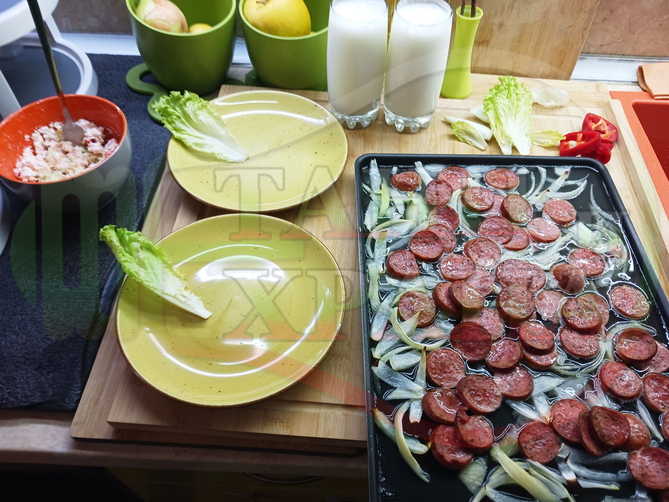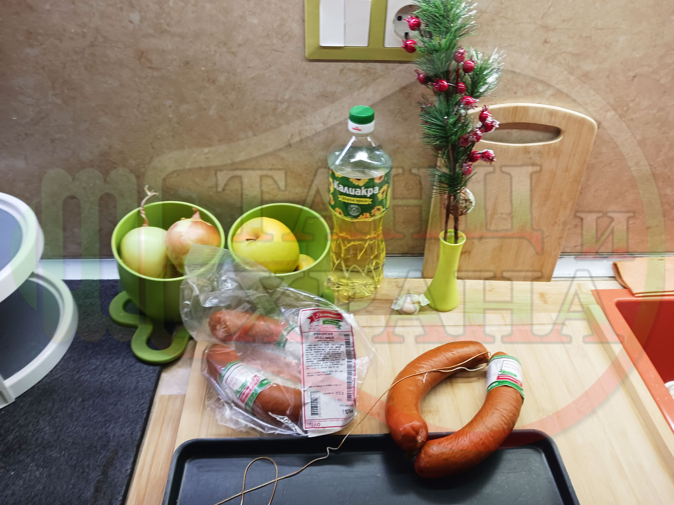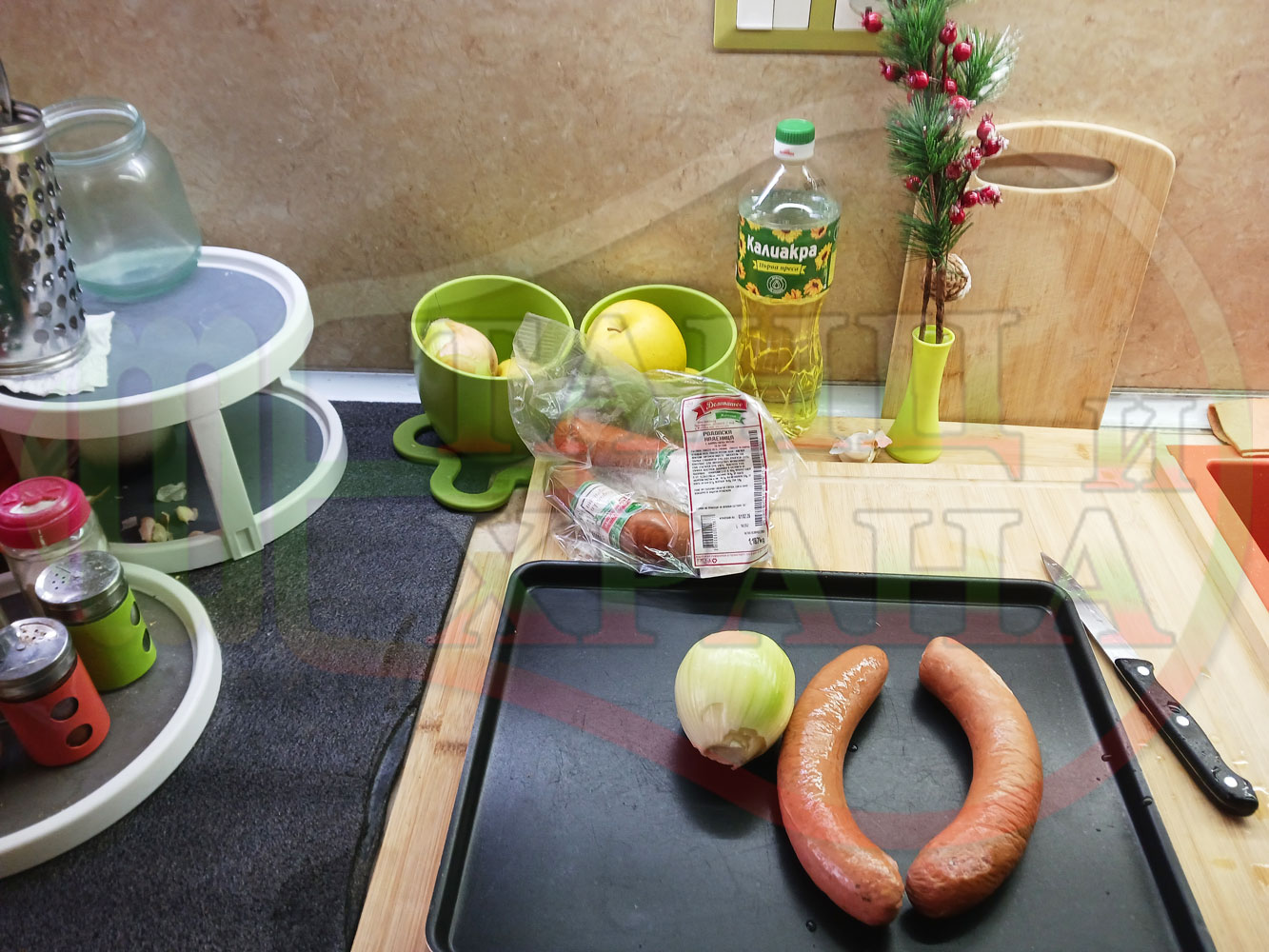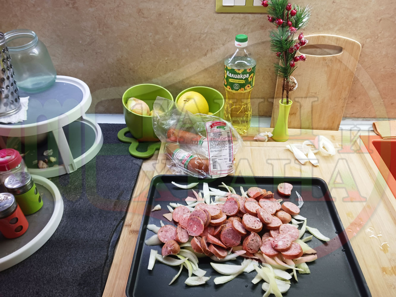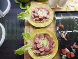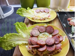 ВНИМАНИЕ: Фурните са различни и съответно времето за сваряване и запичане е ориентировъчно. Наблюдавайте процеса на запичане и при необходимост, покрийте с хартия или фолио за печене. Разбърквайте лука и обръщайте често наденицата за да се изпече равномерно.