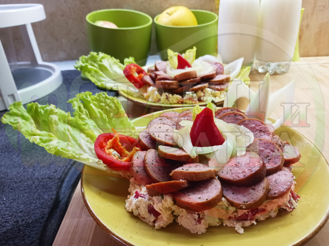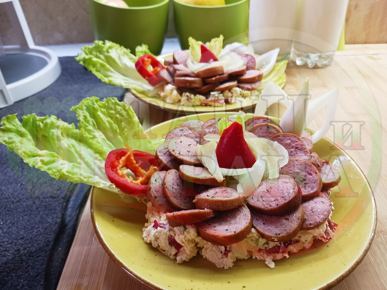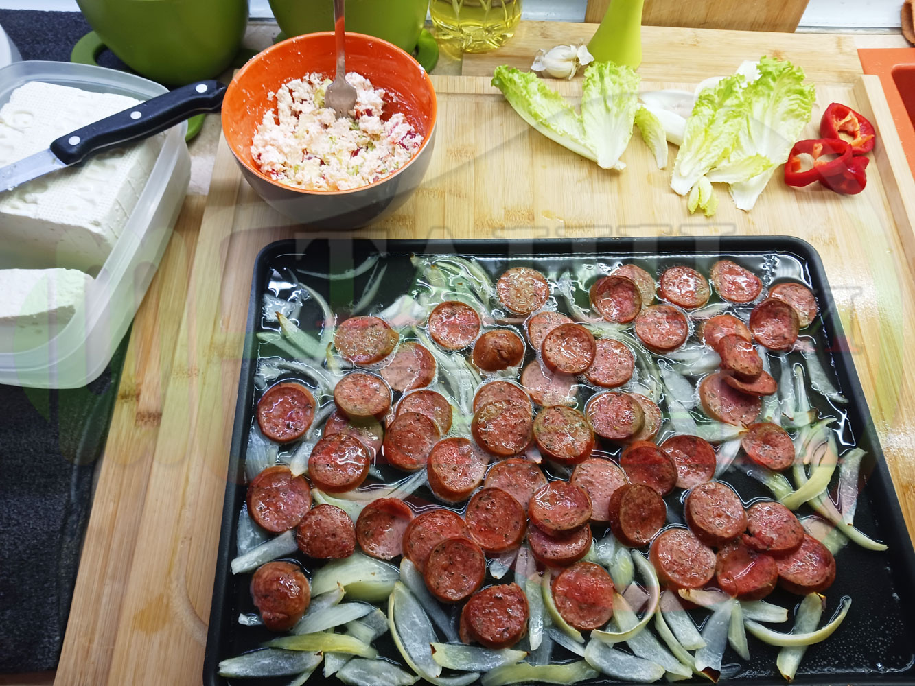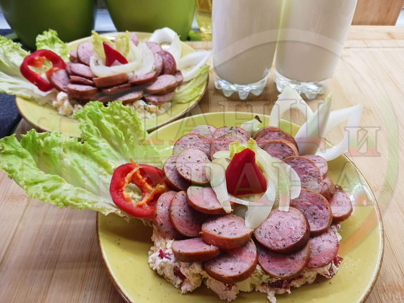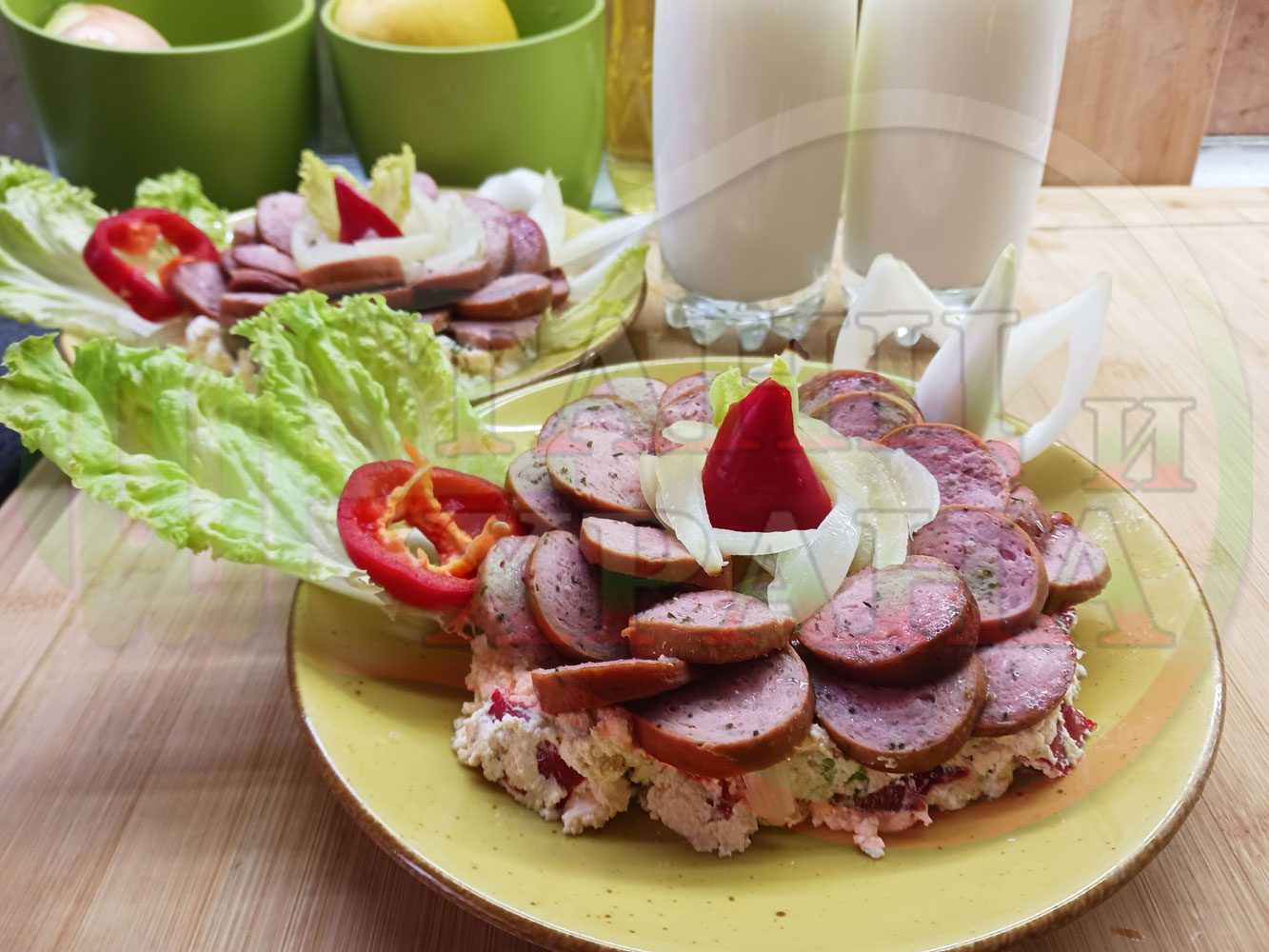 Българска лучена яхния "Родопсконаденицова пиперковомарулена с БГсирене" запечена на фурна с наденица и кромид лук гарнирана в кладенчета от сиренов крем с червени пресни чушки, маруля и краве бяло сирене (българско, саламурено) - двукомпонентна